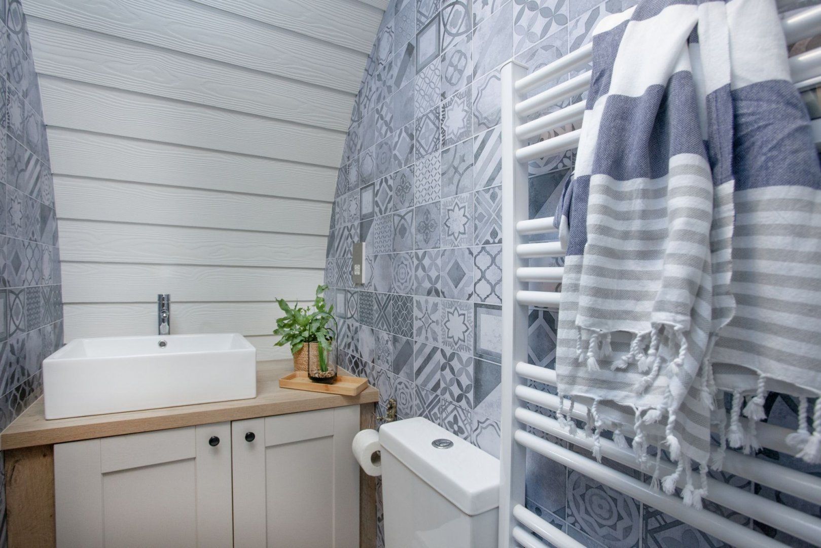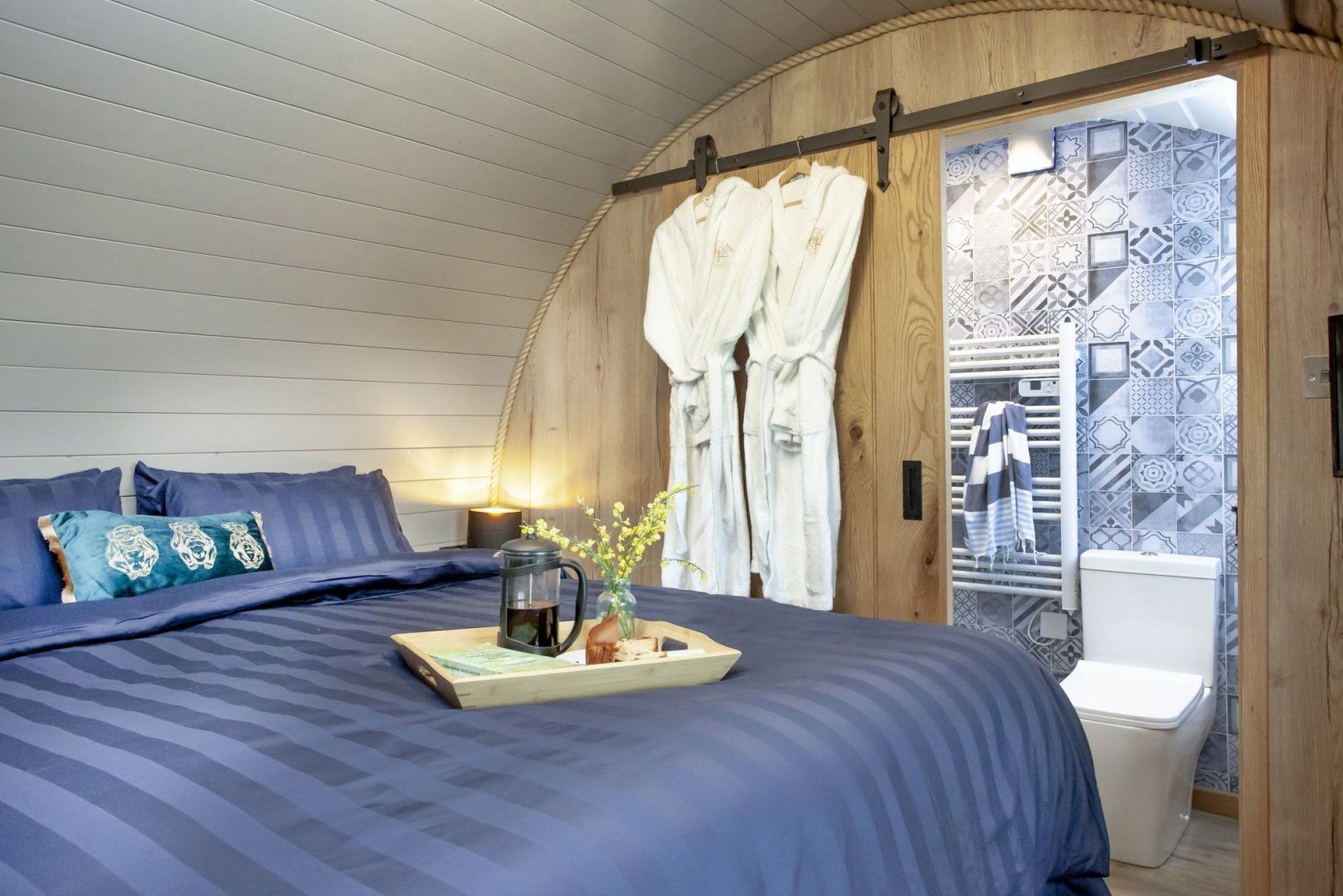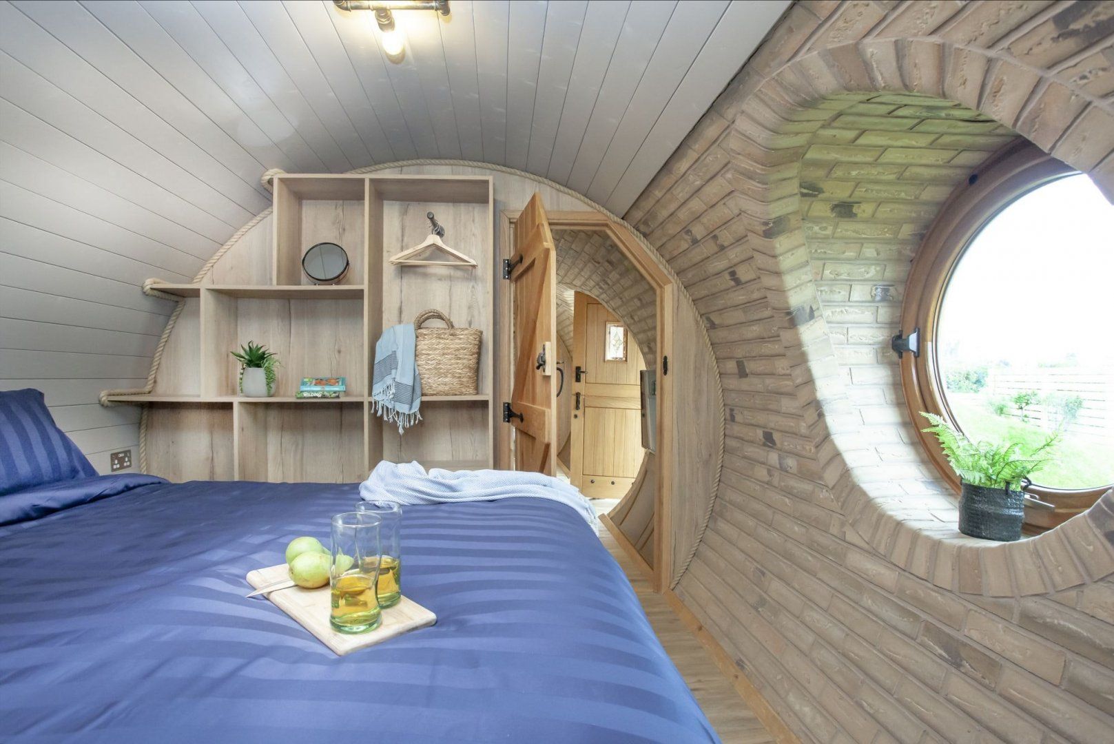 Wander through the round, fairy-lit door and towards the garden area, where you can enjoy meals alfresco at the picnic bench or spend nights under the starry sky in the wood-fired hot tub.