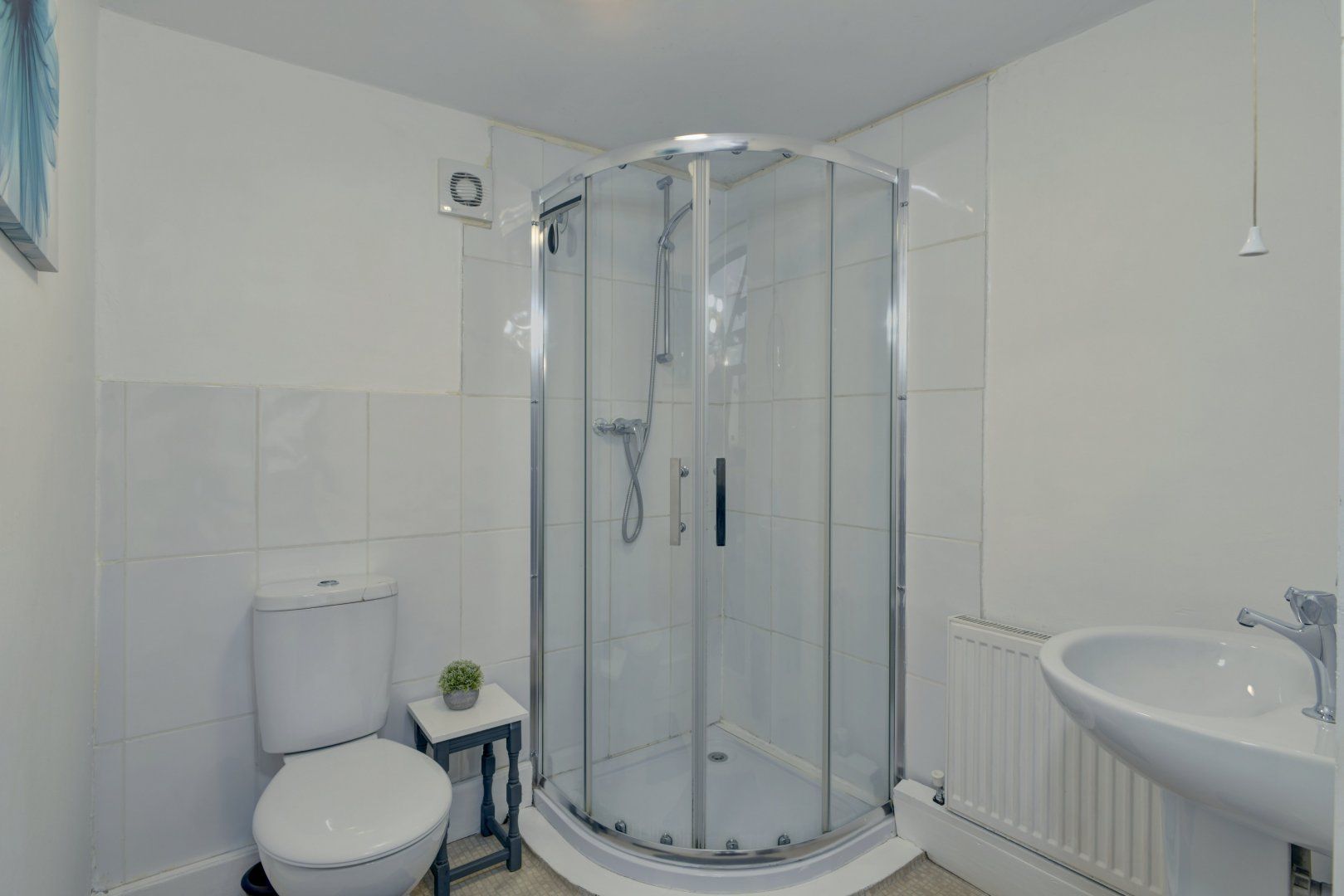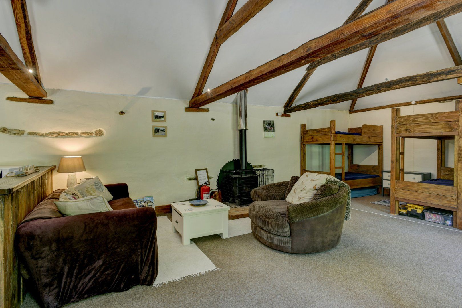 There's a table and 4 chairs, plus comfortable chairs for sitting by the wood-burner. The two sets of bunk beds are at the far end. The separate shower room comprises a corner shower unit, hand basin and toilet.
