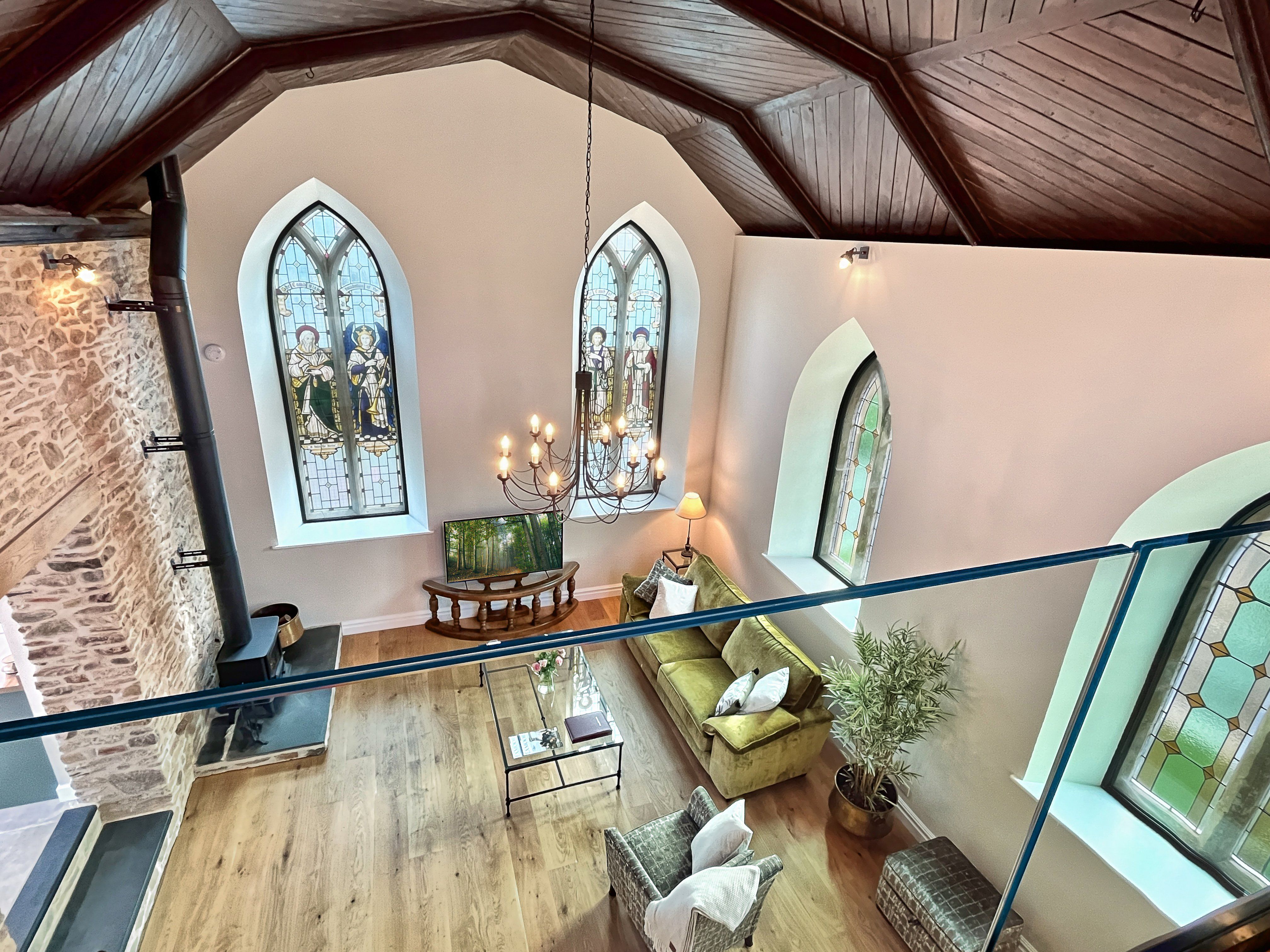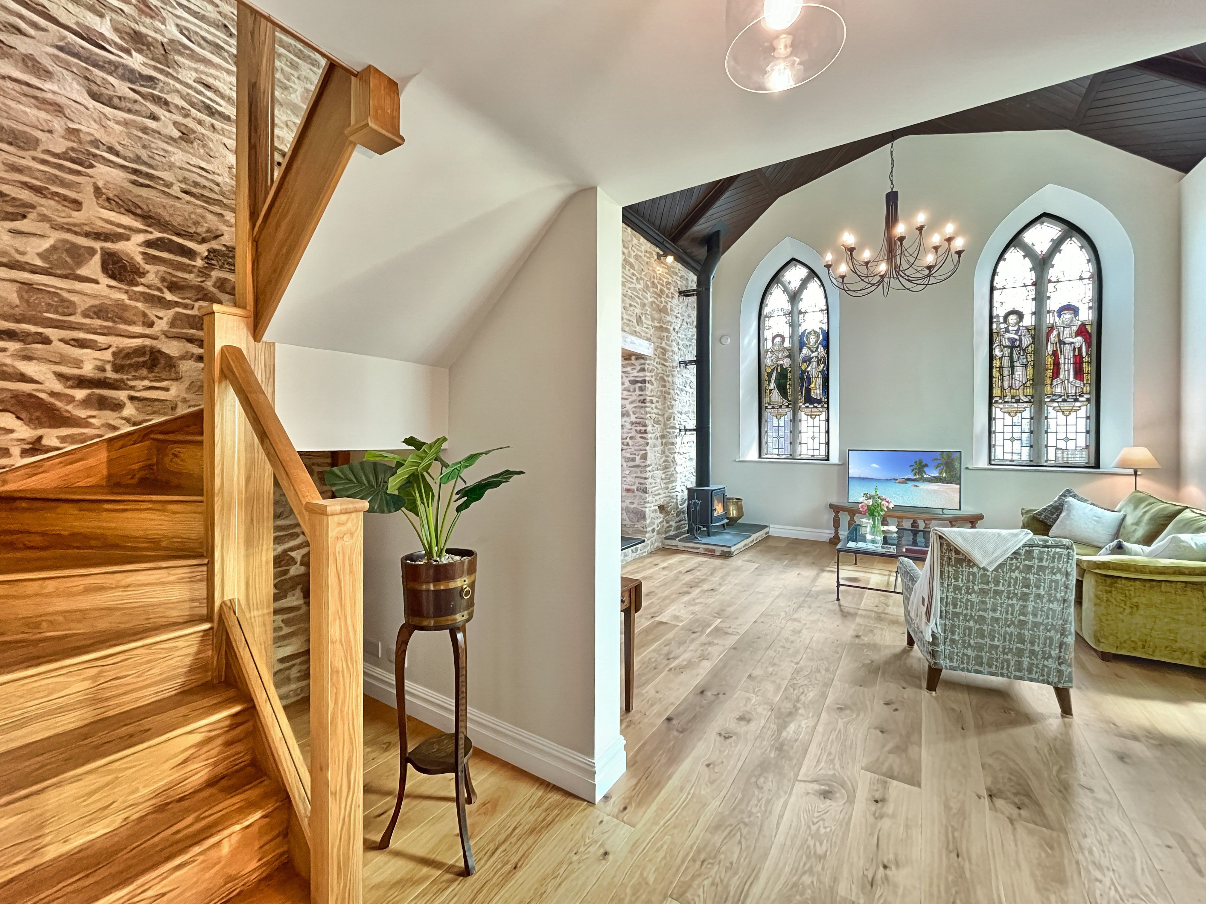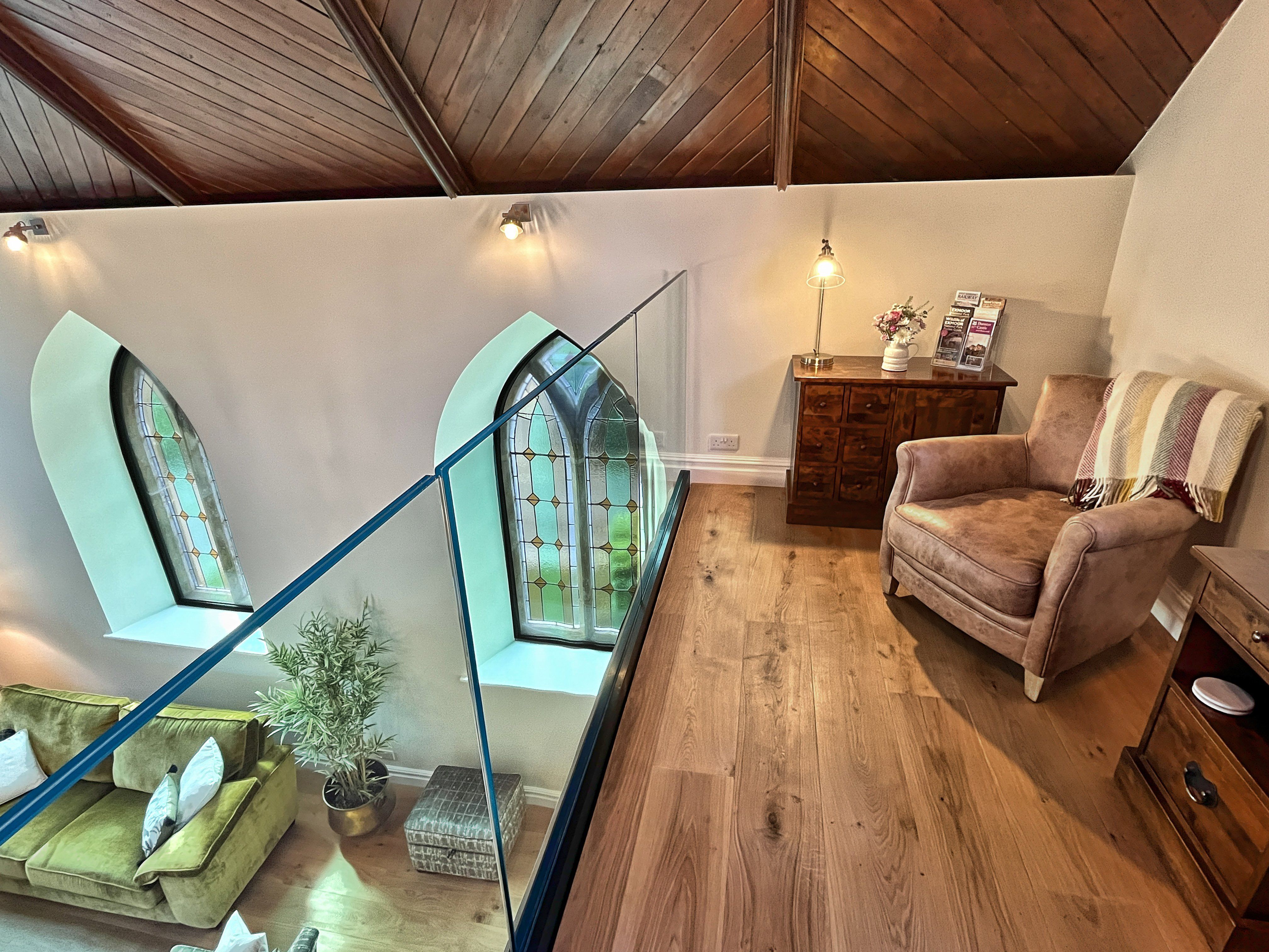 The living area is the site of the original chapel which has a smart television equipped with TV channels, HD multi channel options and apps. Wi-Fi is available throughout (speed 150 mbps) enabling you to keep in touch with the outside world if you need to. A smart speaker is available for you to stream music from your own devices. A selection of board games are also available.