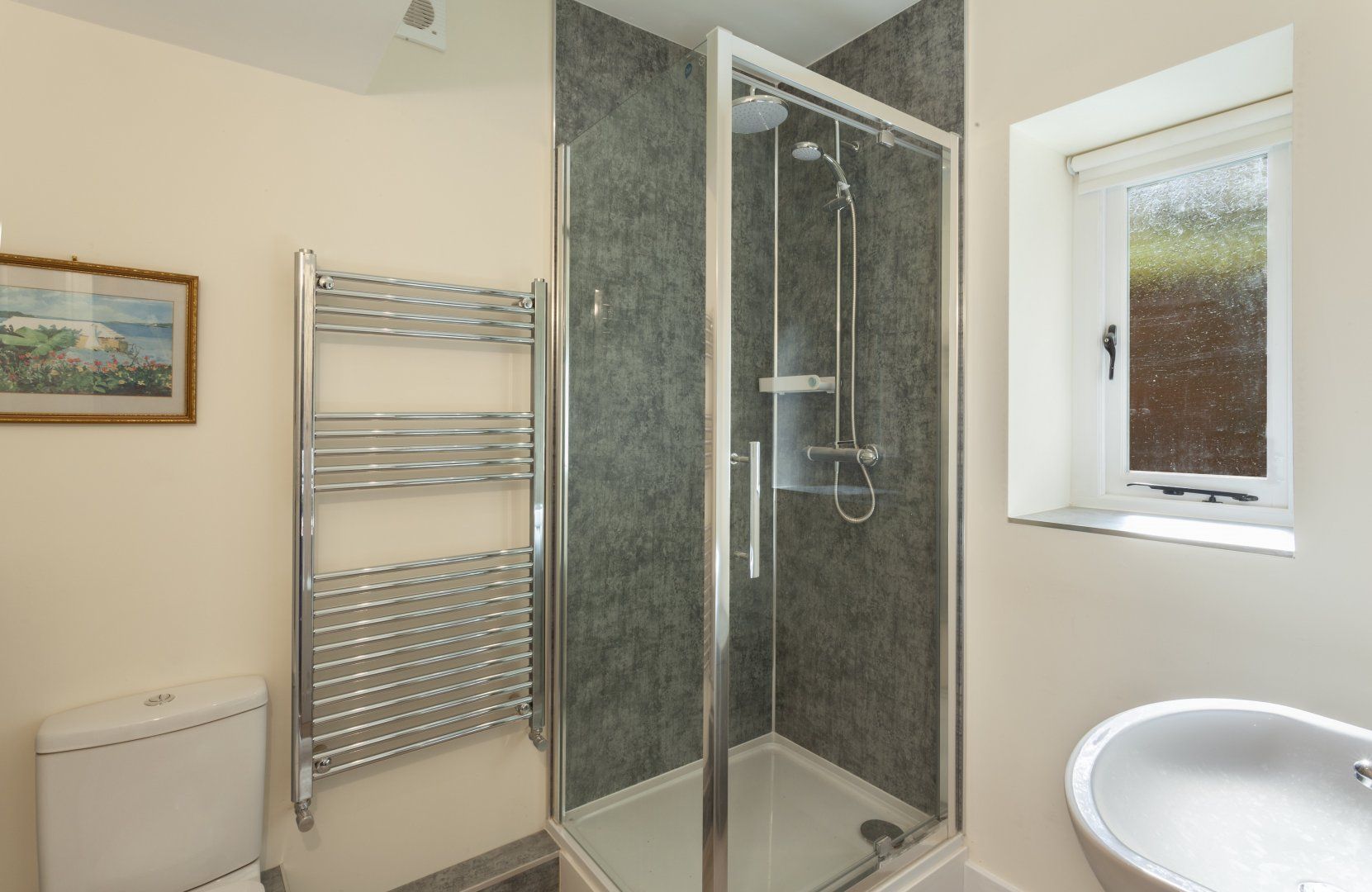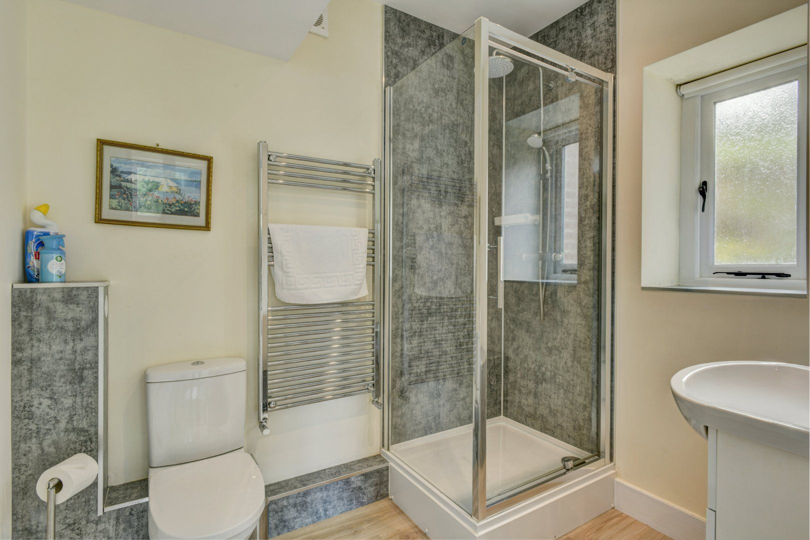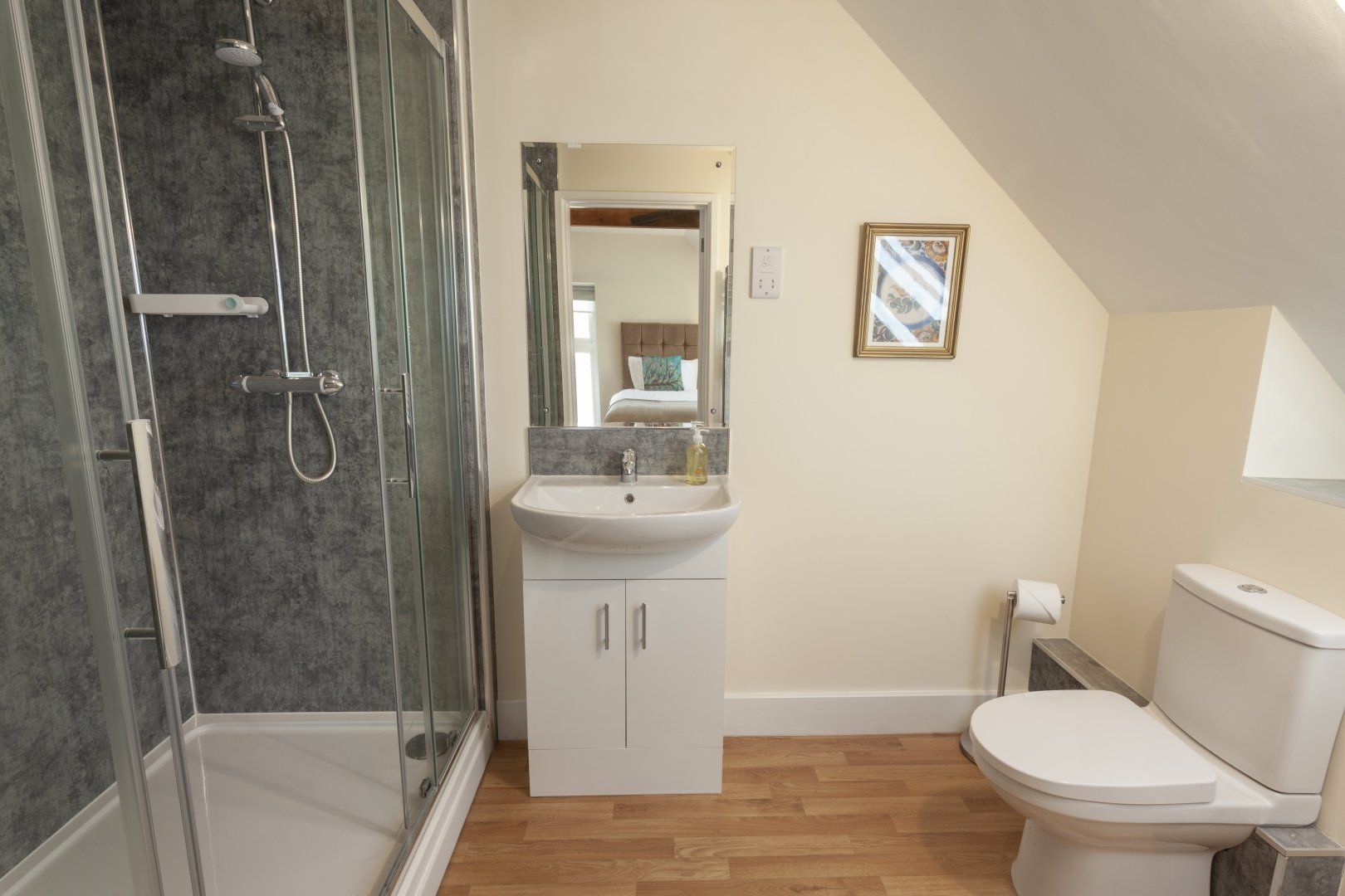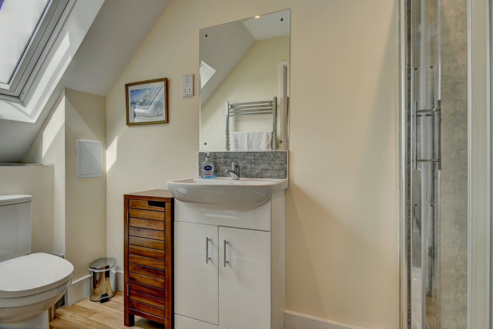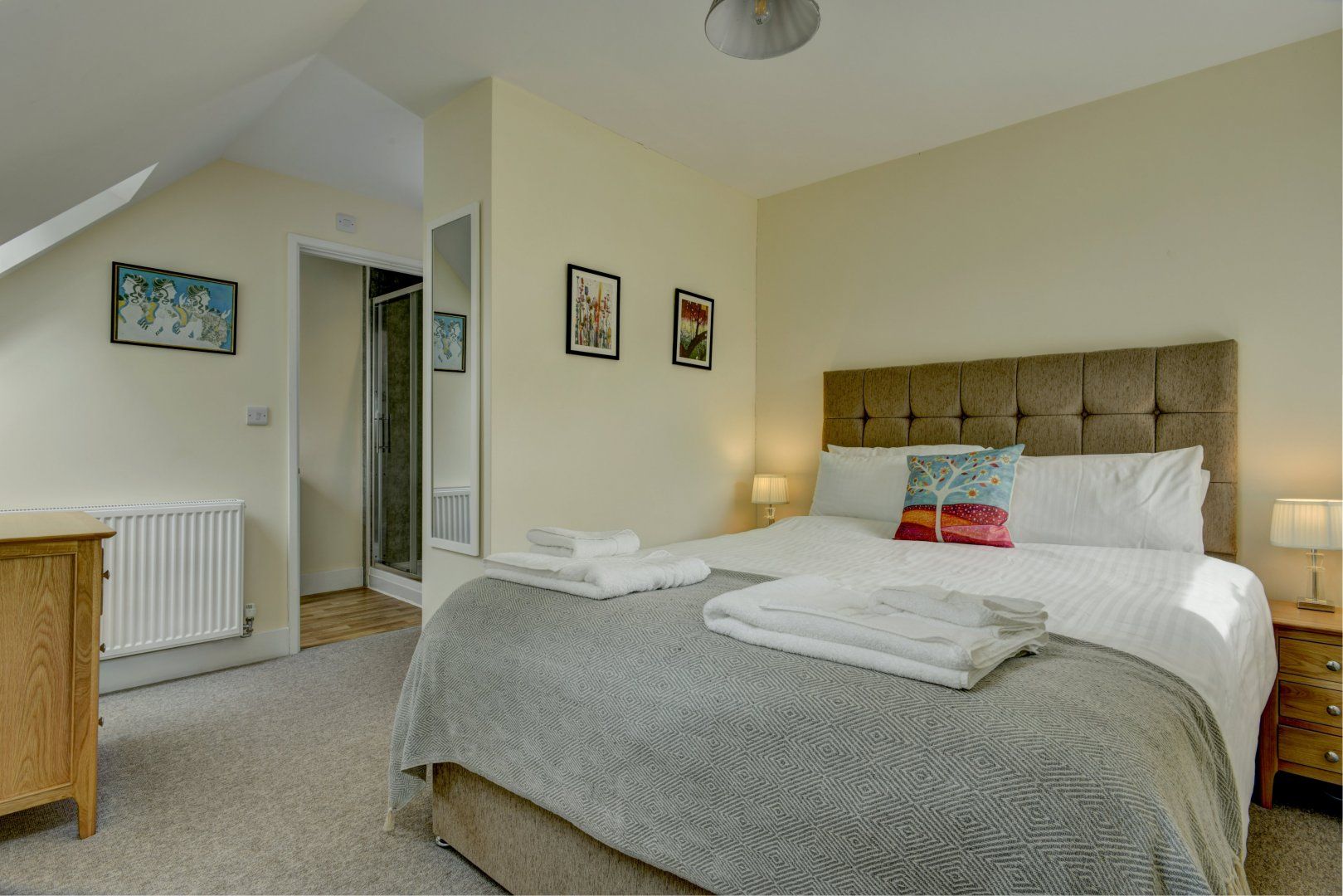 There is one downstairs bedroom, a king-sized double with en-suite shower room. Upstairs, are the other two bedrooms, one is a large twin room with en-suite shower room and this bedroom includes a cot. The third bedroom is a further king-sized double bedroom, also with en-suite shower room. Note, no bath in this property.