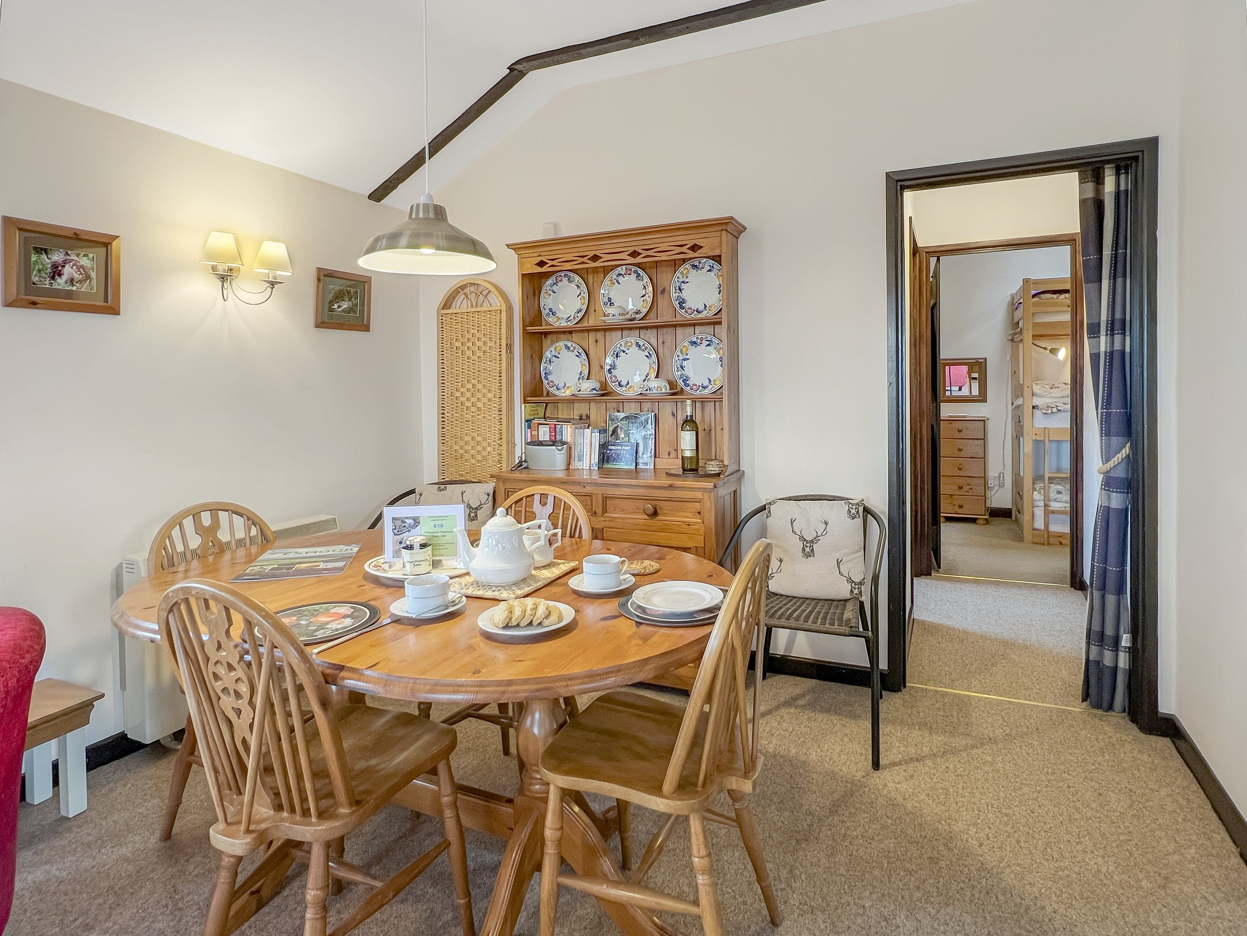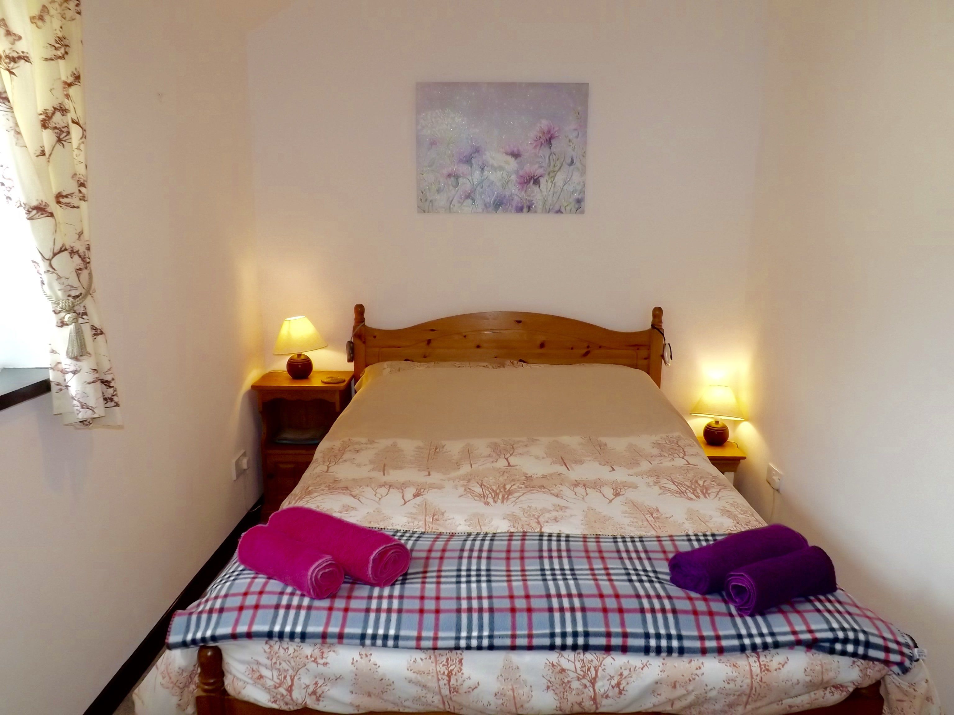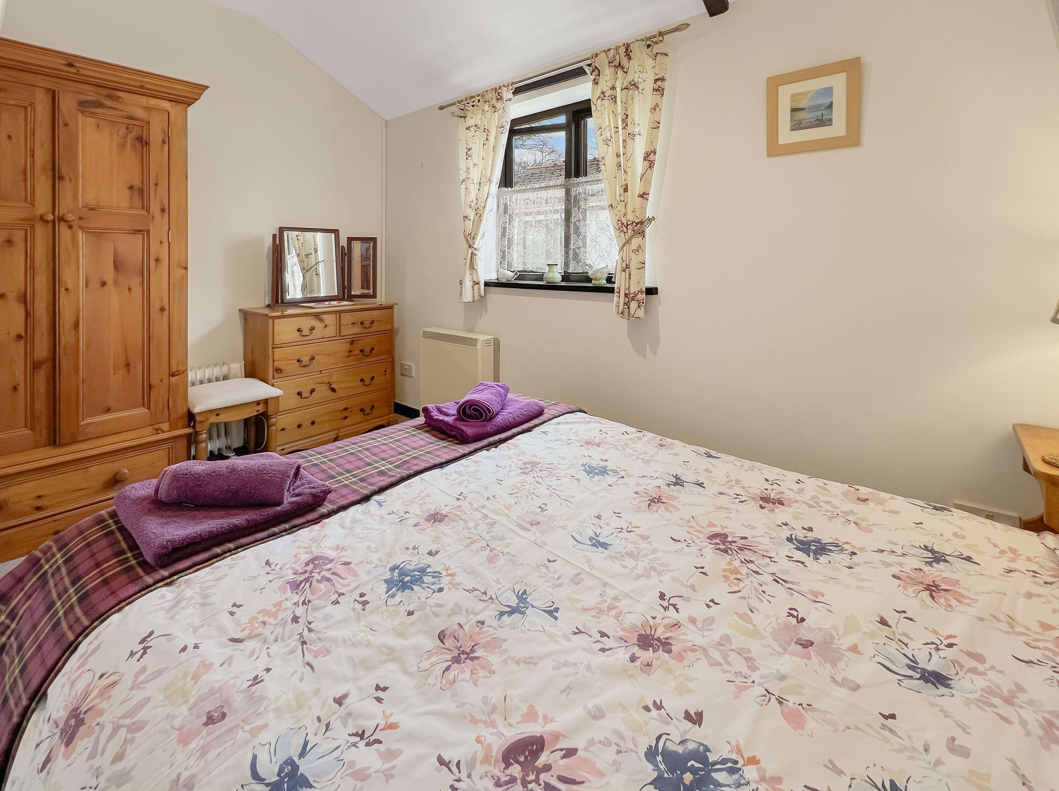 The main bedroom has a double bed, and the second bedroom has triple single adult bunks which were put in by the owners to accommodate their grandchildren and bookings for five people will only be accepted on the understanding that this is a small room with limited storage, lit by a sky light and although the dining table is large, the cottage as a whole is more suited to groups of up to 4 guests. The main mattress at Dairy Cottage has been replaced with a new UK-made Postureflex model which is firm and supportive but not hard. There is also a comfortable guest bed that can be put up behind the sofa if required.