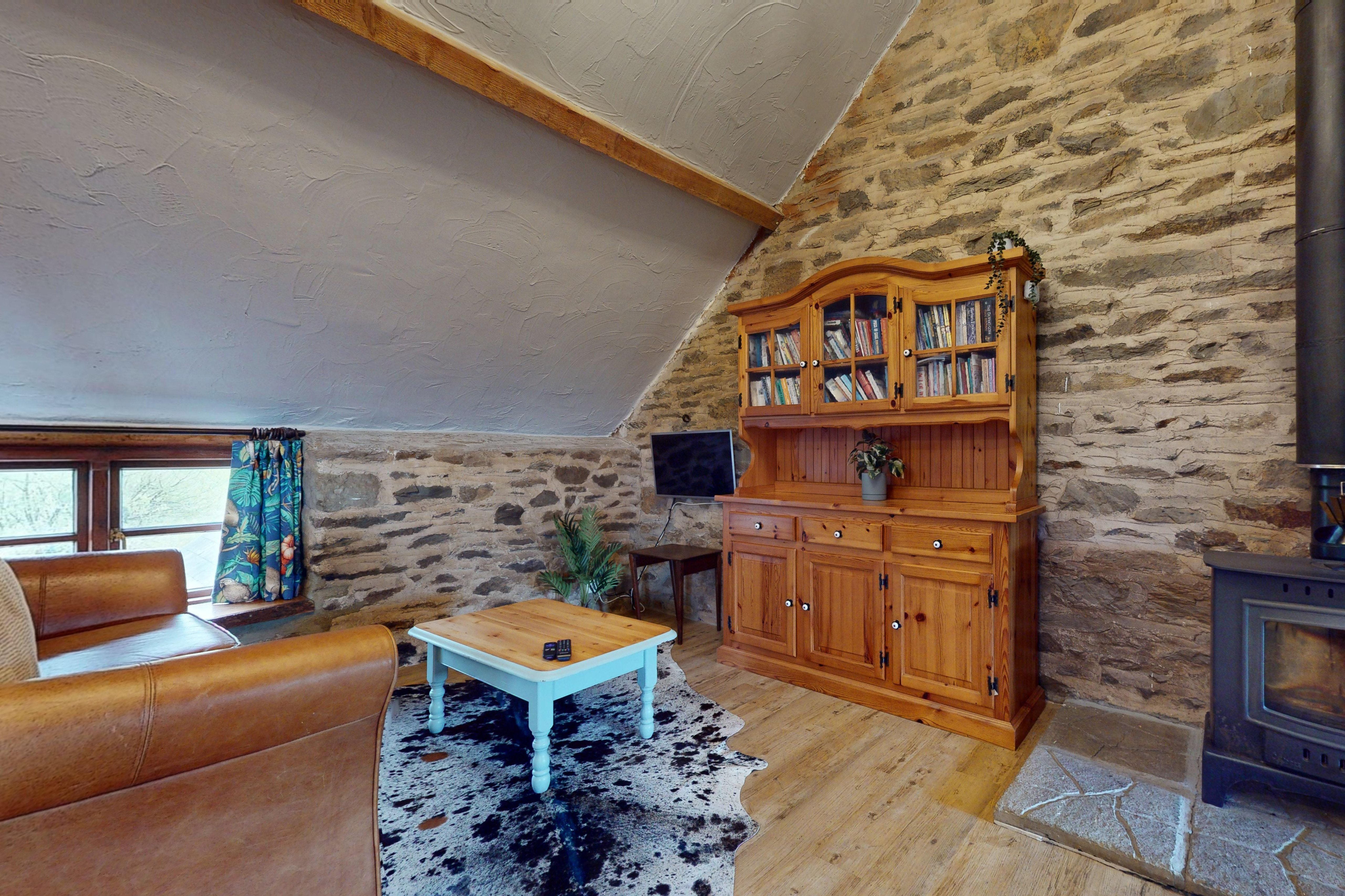The open-plan living area comprises a table with four chairs, wood-burner, and a smart TV and comfortable seating.