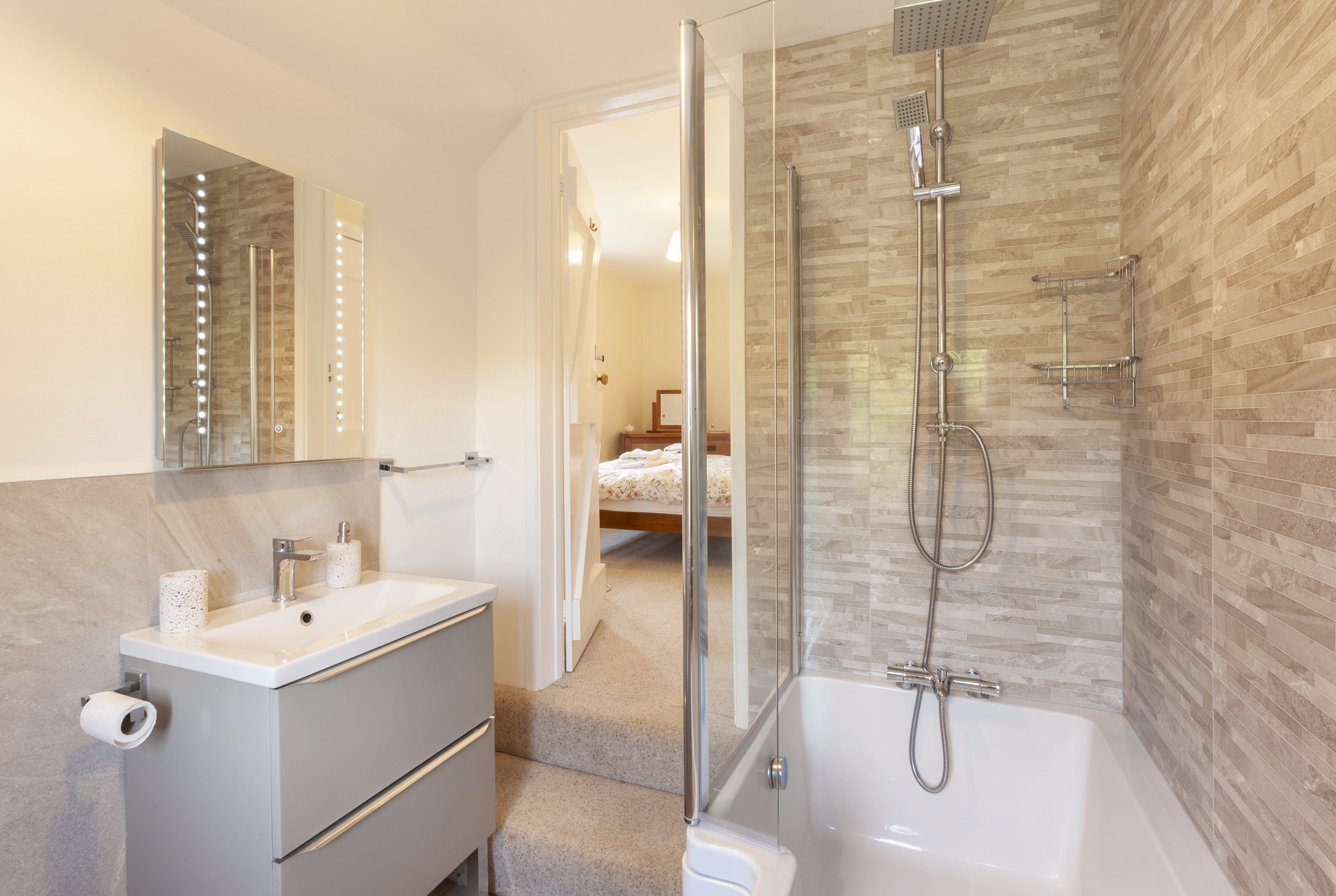 The family bathroom comprises a walk in shower, toilet and hand basin