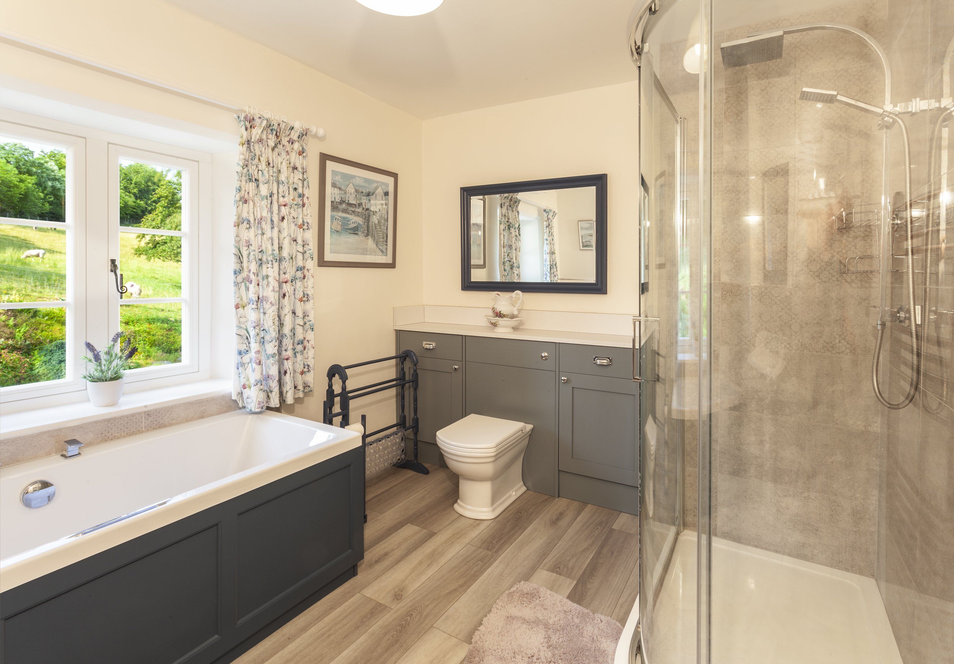 Family bathroom with bath, separate walk-in rainfall shower, toilet, hand basin and hairdryer.