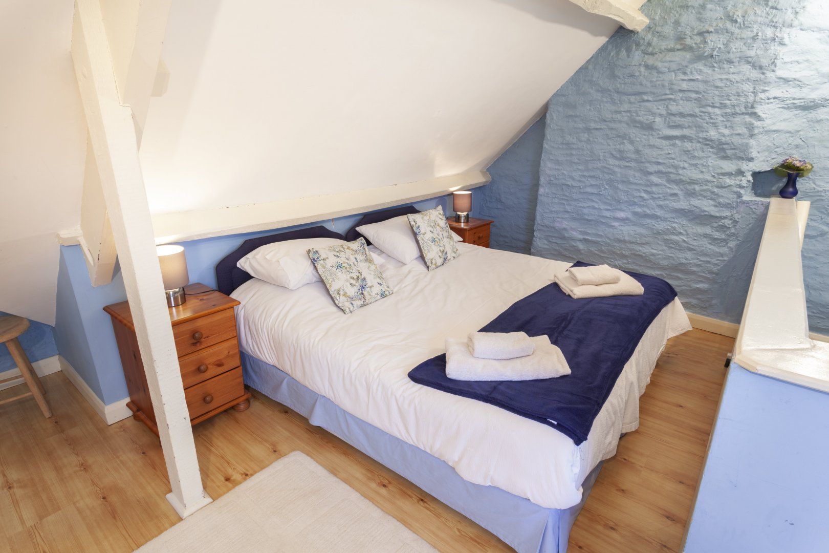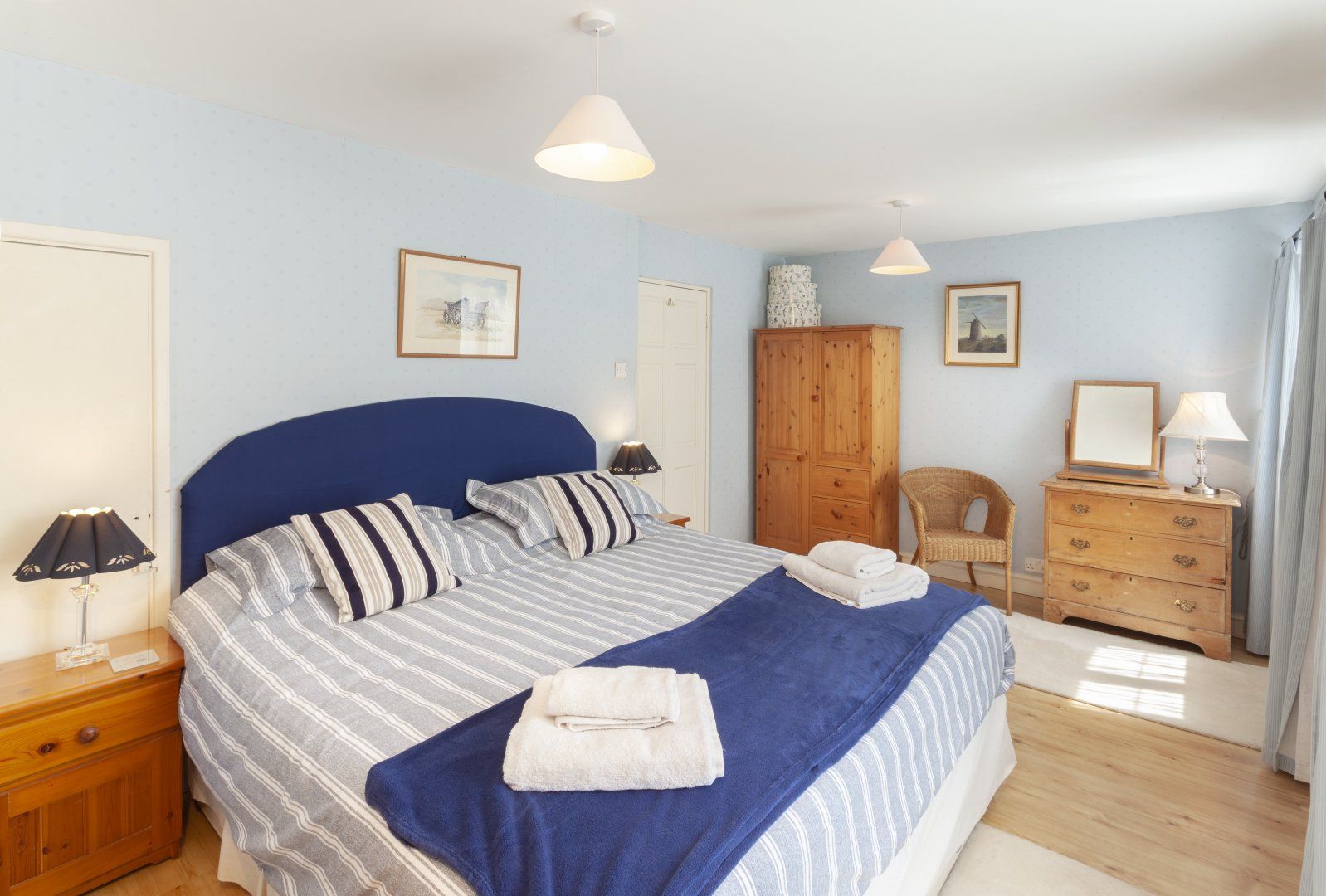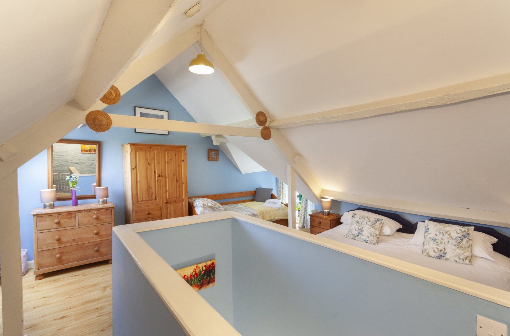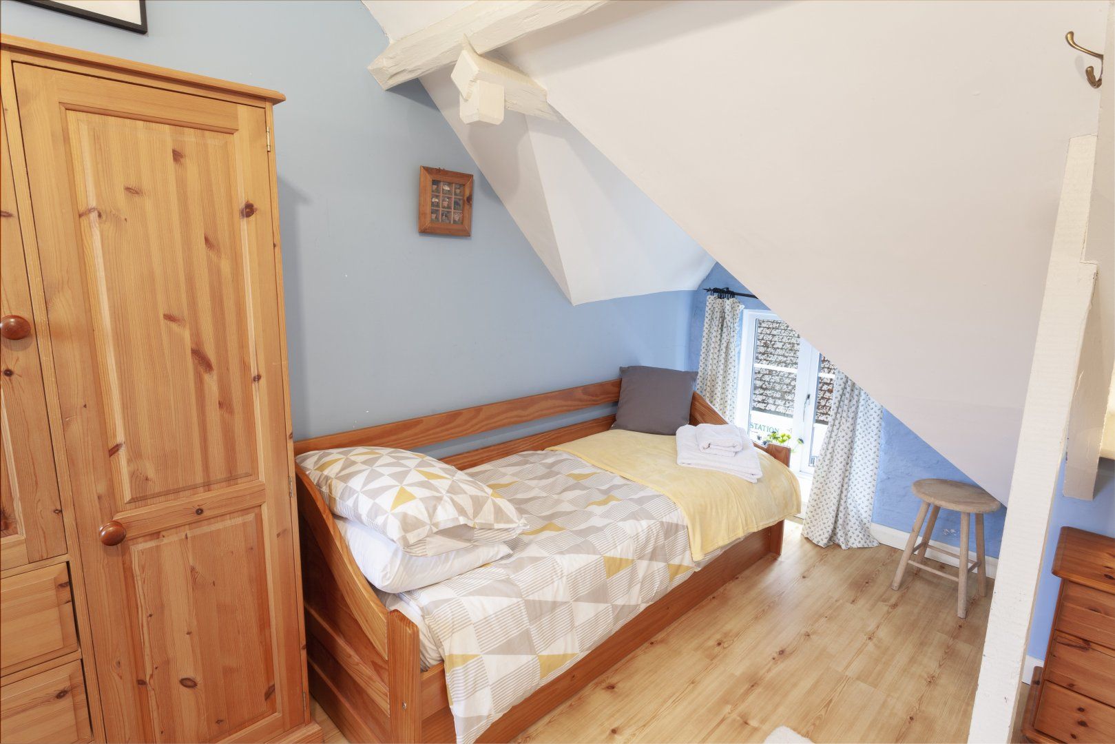 The bedrooms are spacious, comprising one double room on the first floor (with a SuperKing size bed) and one twin/double room on the top floor. The twin beds can be linked to make a wonderfully wide double bed. The top room also contains a sofa that easily pulls out into guest bed providing ideal sleeping accommodation for children.