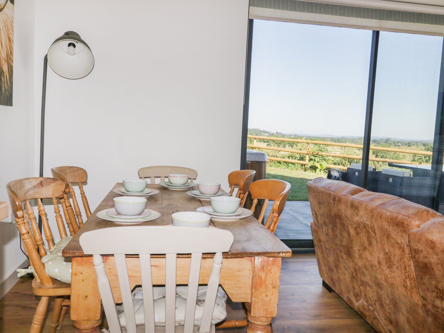 The area is quiet. If you need to unwind in rural seclusion look no further ignore the price and just book you will not be disappointed. The location of this lodge and its facilities are amazing This lodge has a WOW factor as soon as you approach it. There are stunning views of Glastonbury Tor across the Somerset Levels . There is a breathtaking panoramic view from the spacious open plan living area. The hot tub also shares the great views and is secluded and sheltered. There are 2 bathrooms with great showers. There is a massive TV which we never turned on due to the amazing views. The lodge is very light inside due to the large floor to ceiling windows on 2 sides overlooking the Levels. The Lodge is not overlooked with nothing to spoil the views. There are lovely walks direct from your door across the Levels . There is much wildlife, swans, herons swallows and deer. 3 Alpacas, Billie the dog and a black cat visit the garden daily and are all friendly. There is a good WIFI signal but being rural the phone signal is present but a bit weak . There is ample parking. We only went out a couple of days as when you get here you will know why. There is very small campsite as you approach out of view of the Villa as you arrive. The hot tub was large and relaxing and needs to be off and reduced noise outside by 10 pm as not to disturb the one nearby lodge .The upstairs en-suite bedroom has a large bed with a comfortable mattress . The downstairs double bedroom is lovely but the soft mattress made the bed unsuitable for sleeping on so we used upstairs instead. I would suggest the same mattress as upstairs is purchased to rectify this as it would be cooler sleeping downstairs in summer. The sofas and art décor chair look great but are too soft and low for anyone with lower back problems. There is a hard tall chair suitable for reading and sitting though. The kitchen is very well equipped so we used it every day for evening meals. The main oven is slow so leave food in for longer. There are no tea cups or small mugs only numerous large ones. There were beach towels and bathroom towels provided which were on the small side . There is plenty soap washing liquid a dishwasher washing machine meaning you only need to bring your own shampoo and a large towel if you want one. We came as a couple and will definitely be returning in future. We cant wait to see on the nearby owners farm which has a harrier jumpjet which is wheeled out of its shed on a Sunday Overall we had an amazing stay and cant recommend the lodge highly enough. Don't forget a few more bottles of bubbly , just relax and take in the very special views