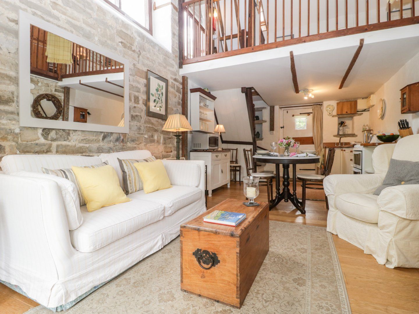 Holiday home The Granary is within the grounds of the owner's' extensive home and is a super holiday cottage. Pristine gardens conceal a solar heated plunge pool (available 1st May until end of August) which is shared with the owners. The living space is open plan with lofty ceilings, feature stone walls and glazed doors which look over the garden. From the neat kitchen, steep stairs lead to the bright and airy bedroom on the mezzanine which has a double bed and single bed for flexible sleeping arrangement but please note max occupancy is 2 guests.. Note: The solar heated pool is only available between May and August and is shared with the owners. Note: The Granary has steep, narrow stairs. Note: Maximum two guests. Regrettably babies and children from 0 to 6 years cannot be allowed. Note: The property and pool may not be suitable for people with limited mobility. Note: For any holiday between 1st September and 31st May, there is a heating supplement of £20.00 per week. Please note this property cannot accept pets but the owner does have a labrador on site. Shop 200 yards. Pub 1 mile. Beach 15 miles.
