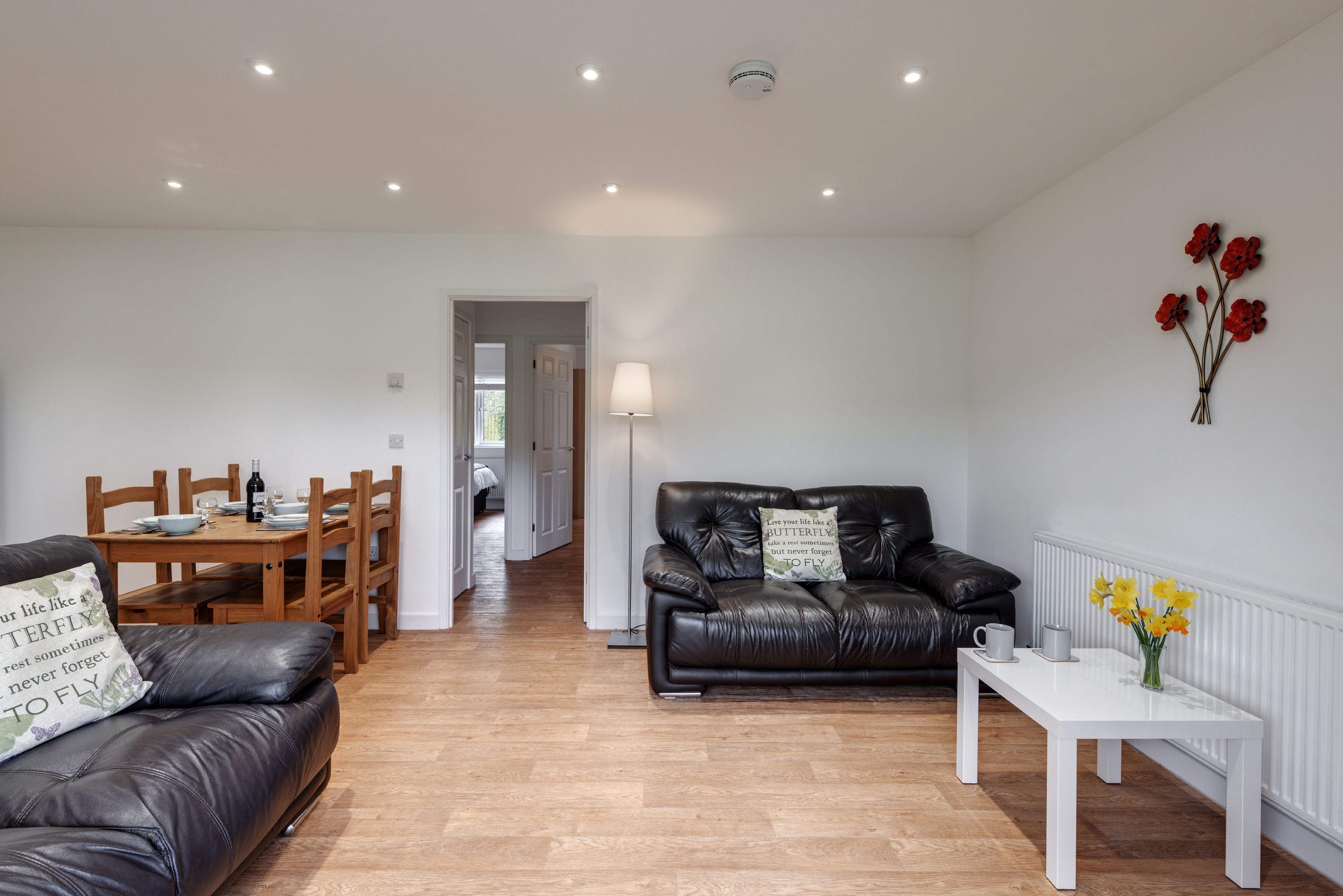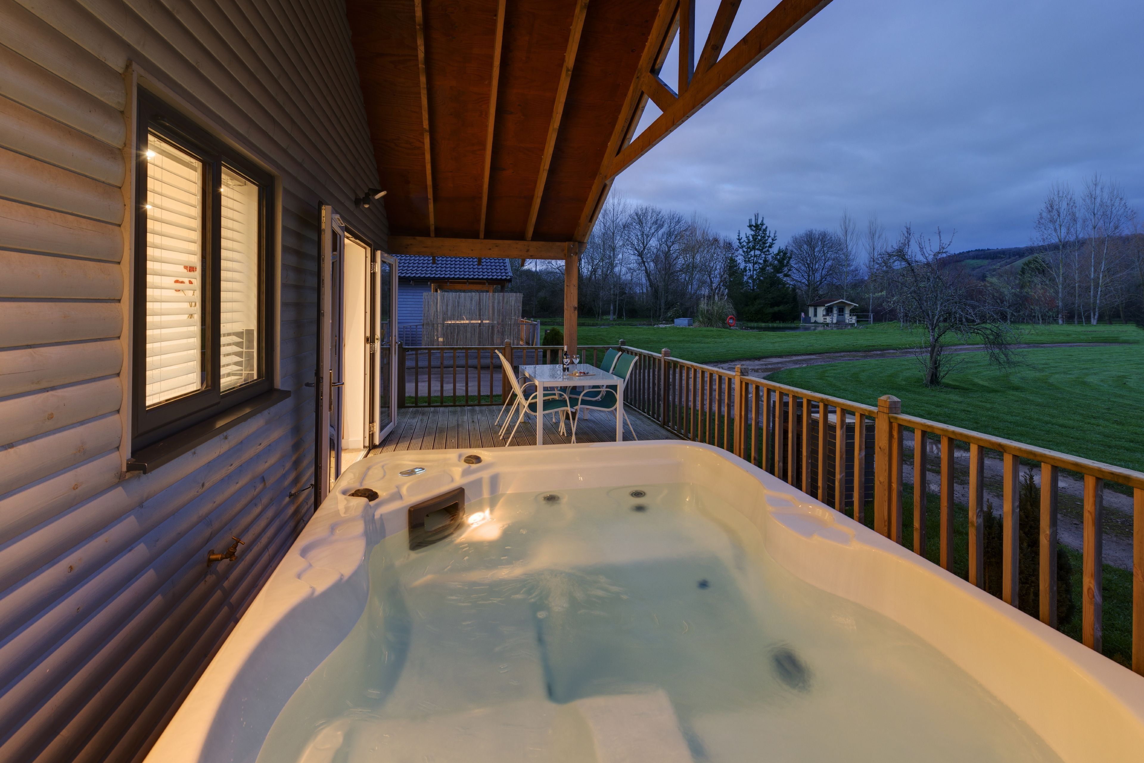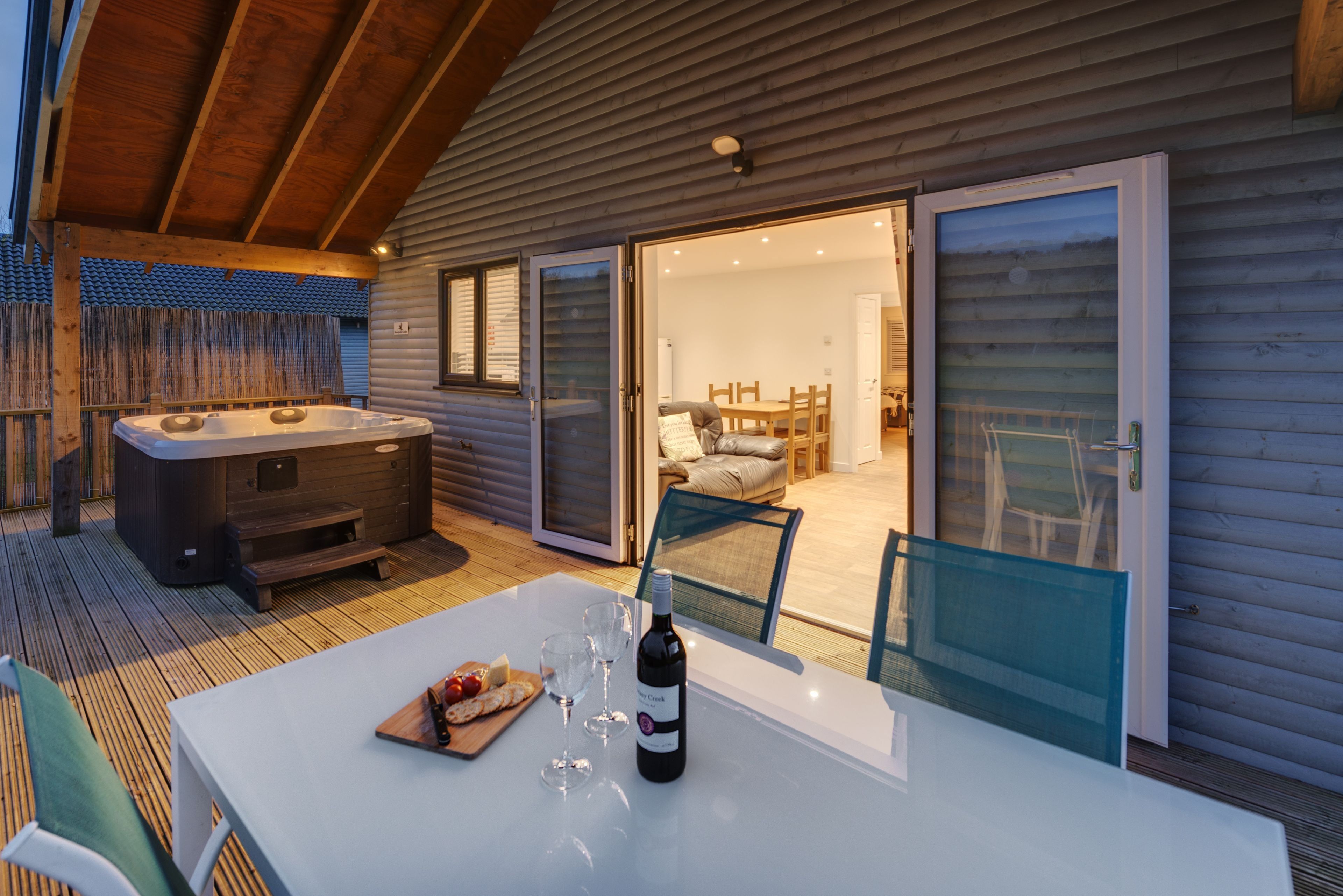Living areaOpen plan with the kitchen and dining area with access to the decked terrace. Two sofas seating four and Flatscreen TV with Freeview. KitchenOpen plan with dining and living area with access to the decked terrace. Double gas oven with gas hob, microwave, fridge freezer and dishwasher. DiningOpen plan with the kitchen and dining area with access to the decked terrace. Dining table with four chairs. Master BedroomKing size bed, wardrobe and dressing table. En-suite. Bedroom TwoTwin zip and link beds that can be made up as a king size bed if requested at the time of booking. Wardrobe and dressing table. En suite. Family bathroomEn suite to master bedroom has a walk-in shower cubicle, WC and wash basin. Bathroom TwoEn suite to bedroom two has a walk-in shower cubicle, WC and wash basin. OutdoorsDecked terrace to the front of the property with a table, chairs and private hot tub. Parking for two cars next to your lodge.