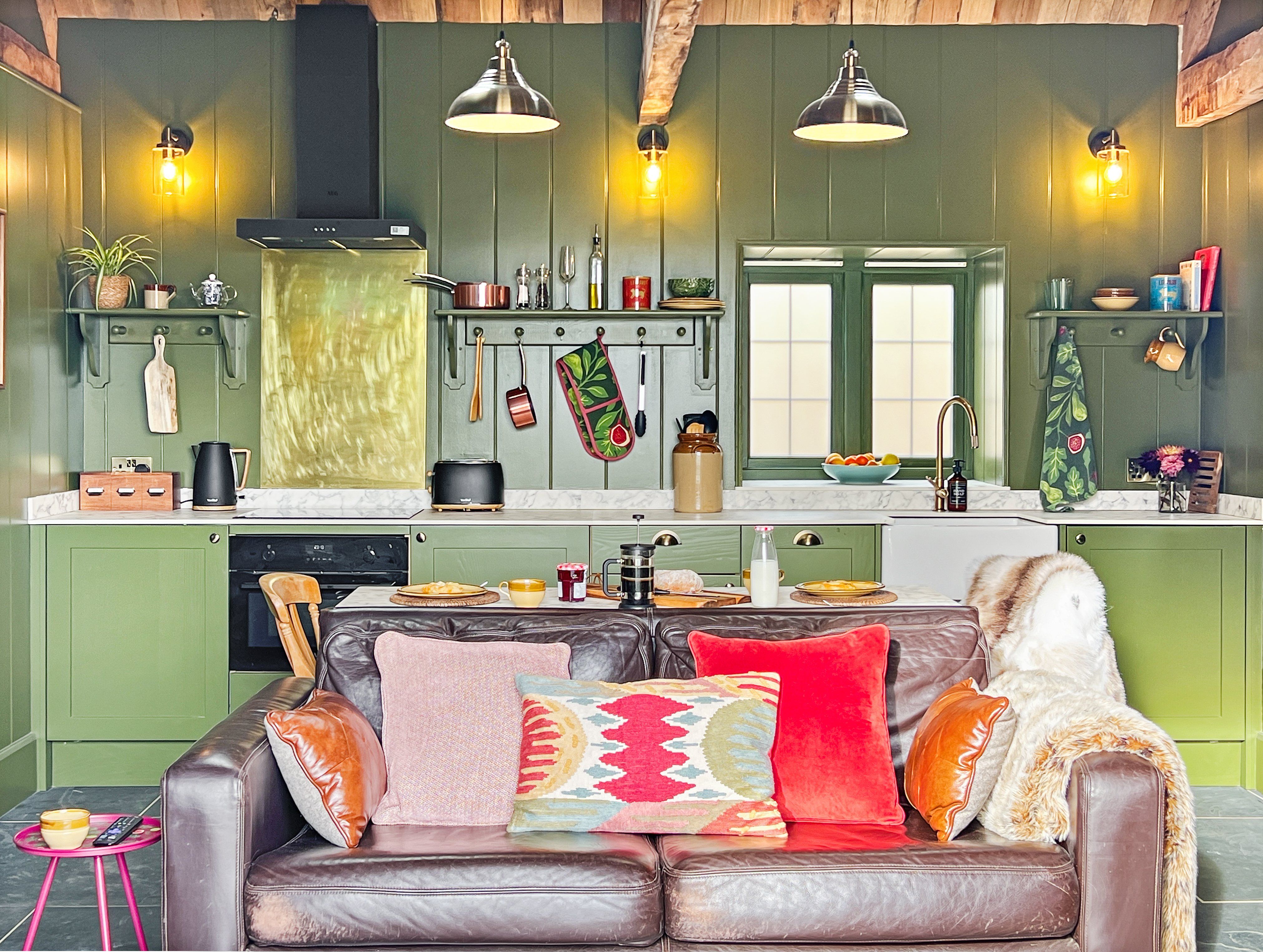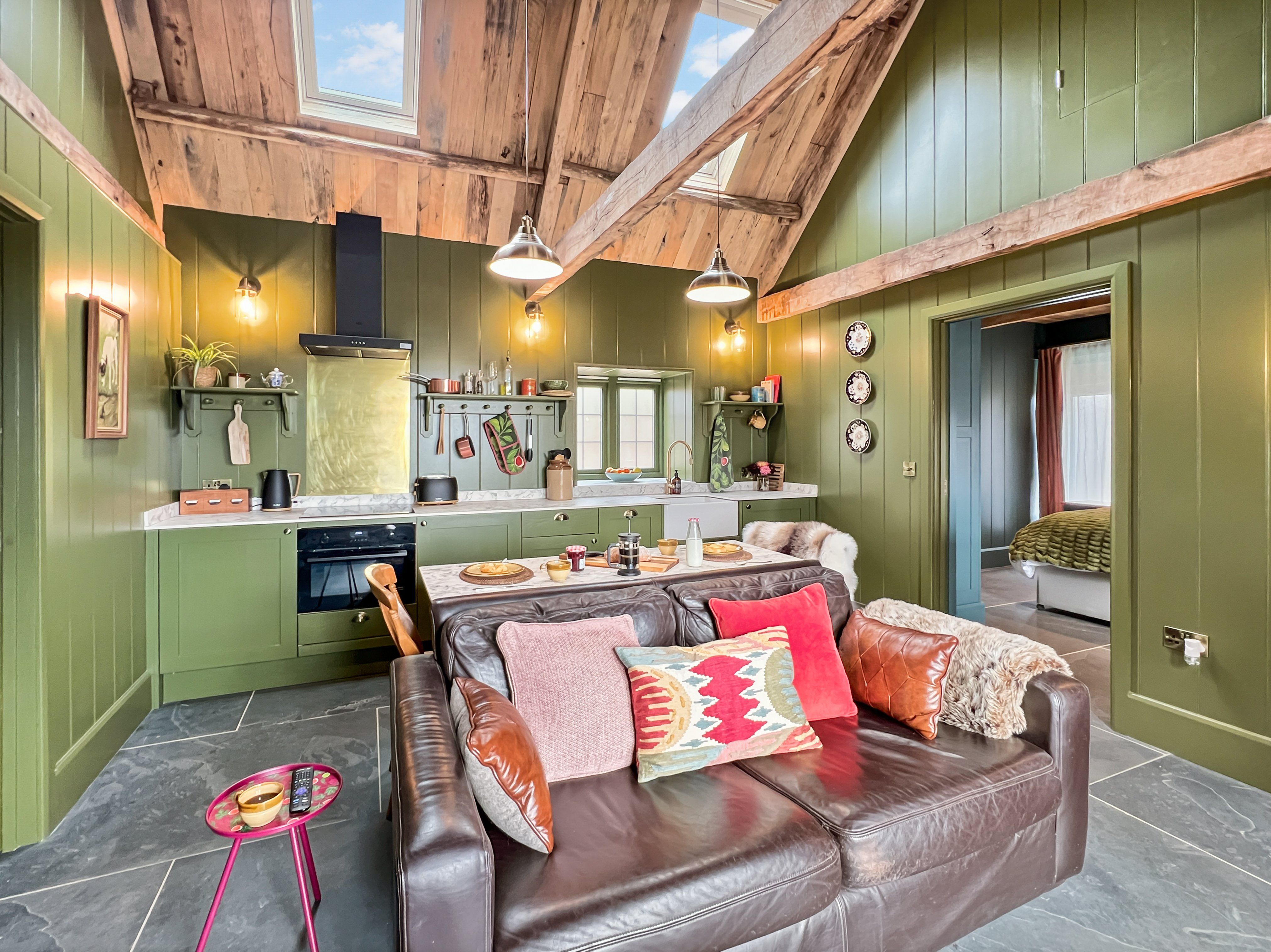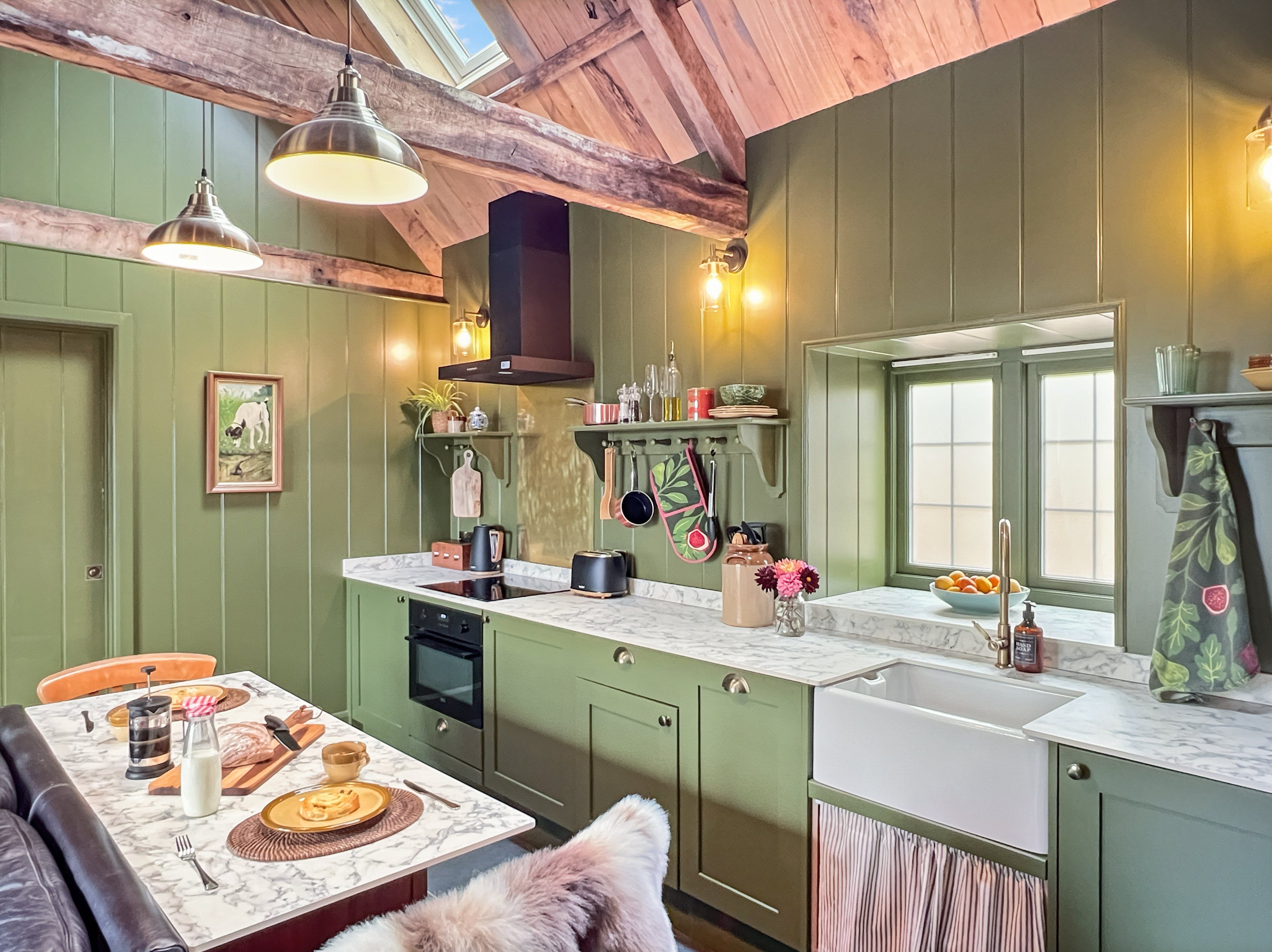Buttercup Cottage kitchen is fully equipped for guests to cook their own meals with a fridge, freezer, dishwasher, oven, hob and microwave. Other amenities include a kettle, coffee maker, toaster, and all the cooking basics - pots and pans, oil, salt and pepper, plus dishes and cutlery including bowls, plates, cups, wine glasses, and baking sheets.