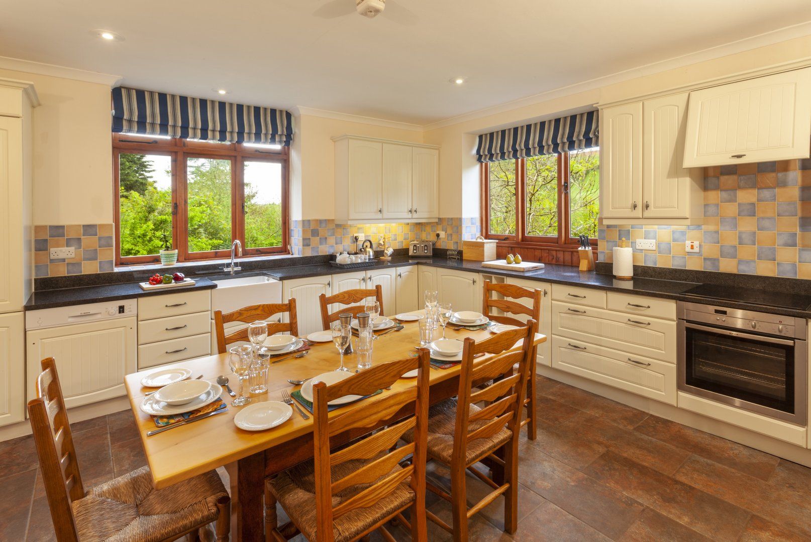 Newly fitted first floor kitchen-dining room well-equipped with Aga electric cooker, microwave, fridge/freezer, dishwasher, and washing machine/tumble dryer, plus dual-aspect windows with views out over farmland