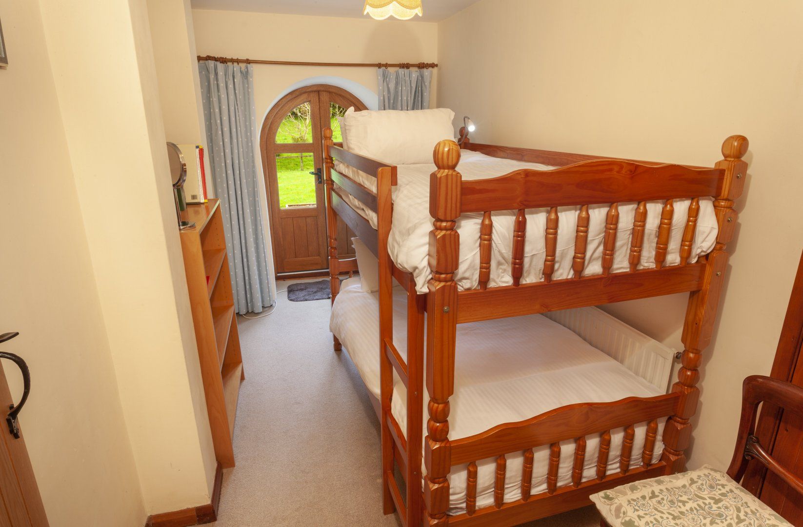 3 ground floor bedrooms (one spacious king-sized double en-suite with feature-arched doorway to garden, one with bunk beds, also with arched doorway to garden, and one twin with exposed wooden beam and arched window. Please note, twin beds can be zipped together to form a super-king bed upon request)