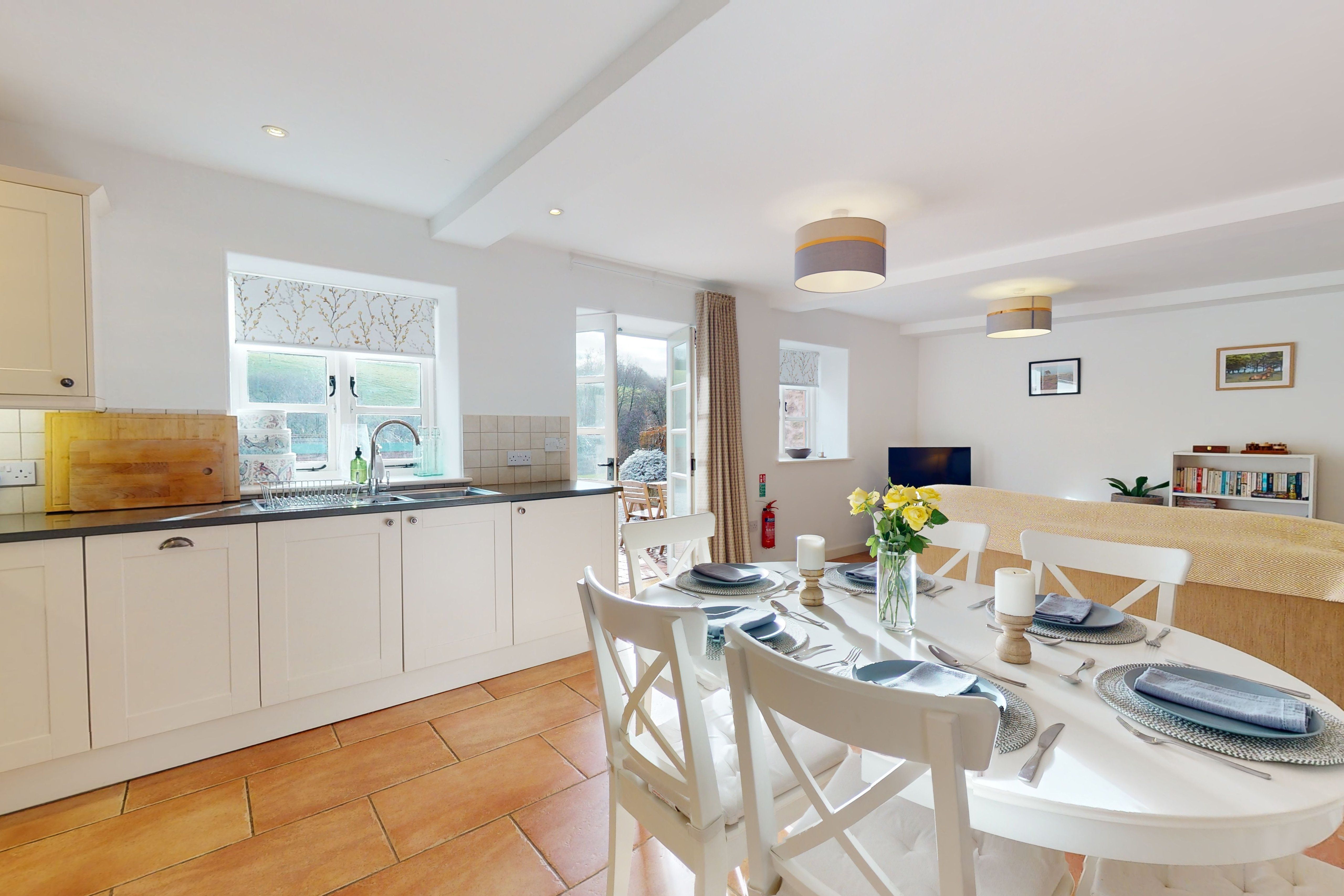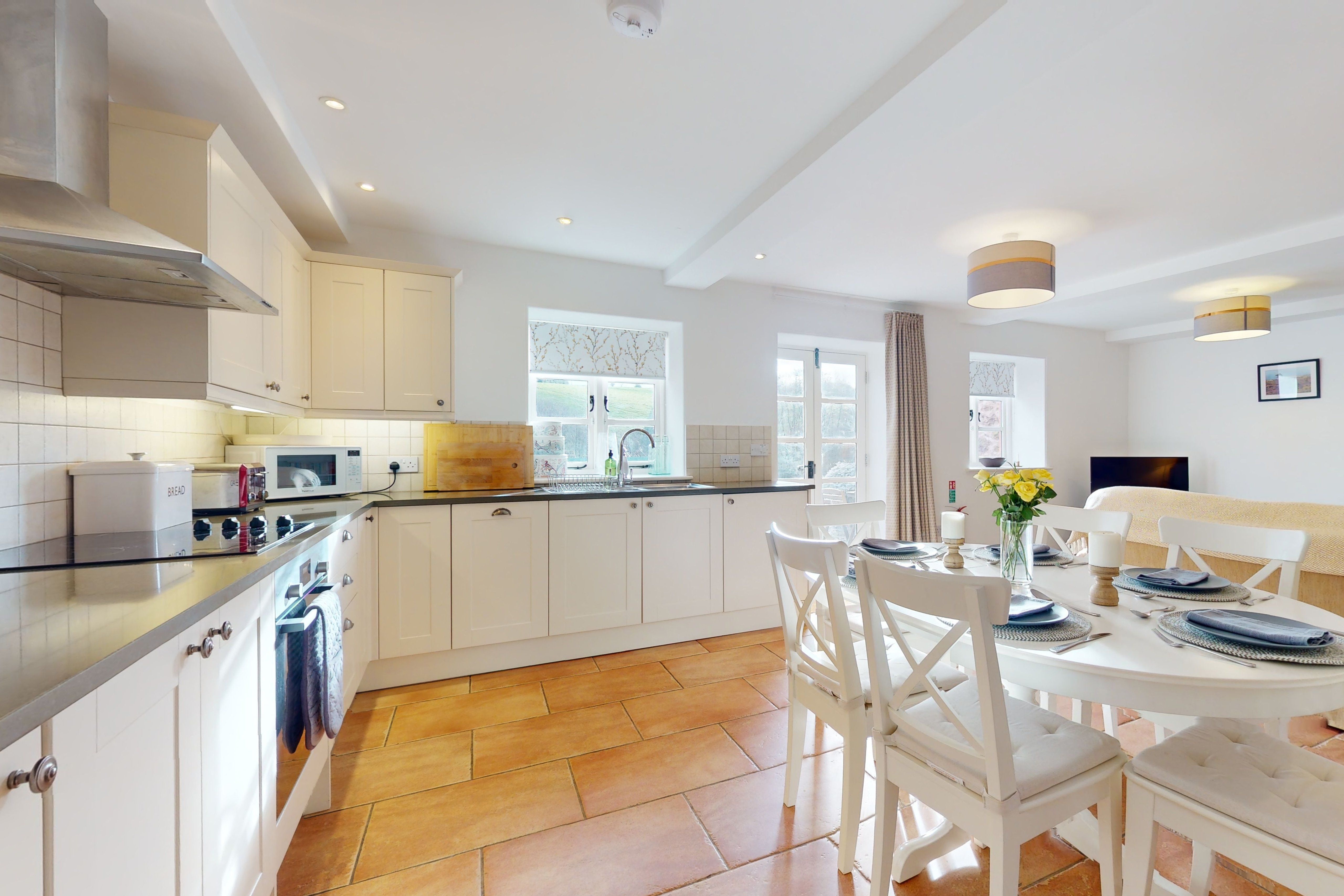 The kitchen is fitted with all electric oven with hob, dishwasher, fridge with freezer compartment, microwave, and washer-dryer. Other equipment includes toaster, kettle, a variety of kitchen utensils, cutlery, crockery and glasses.