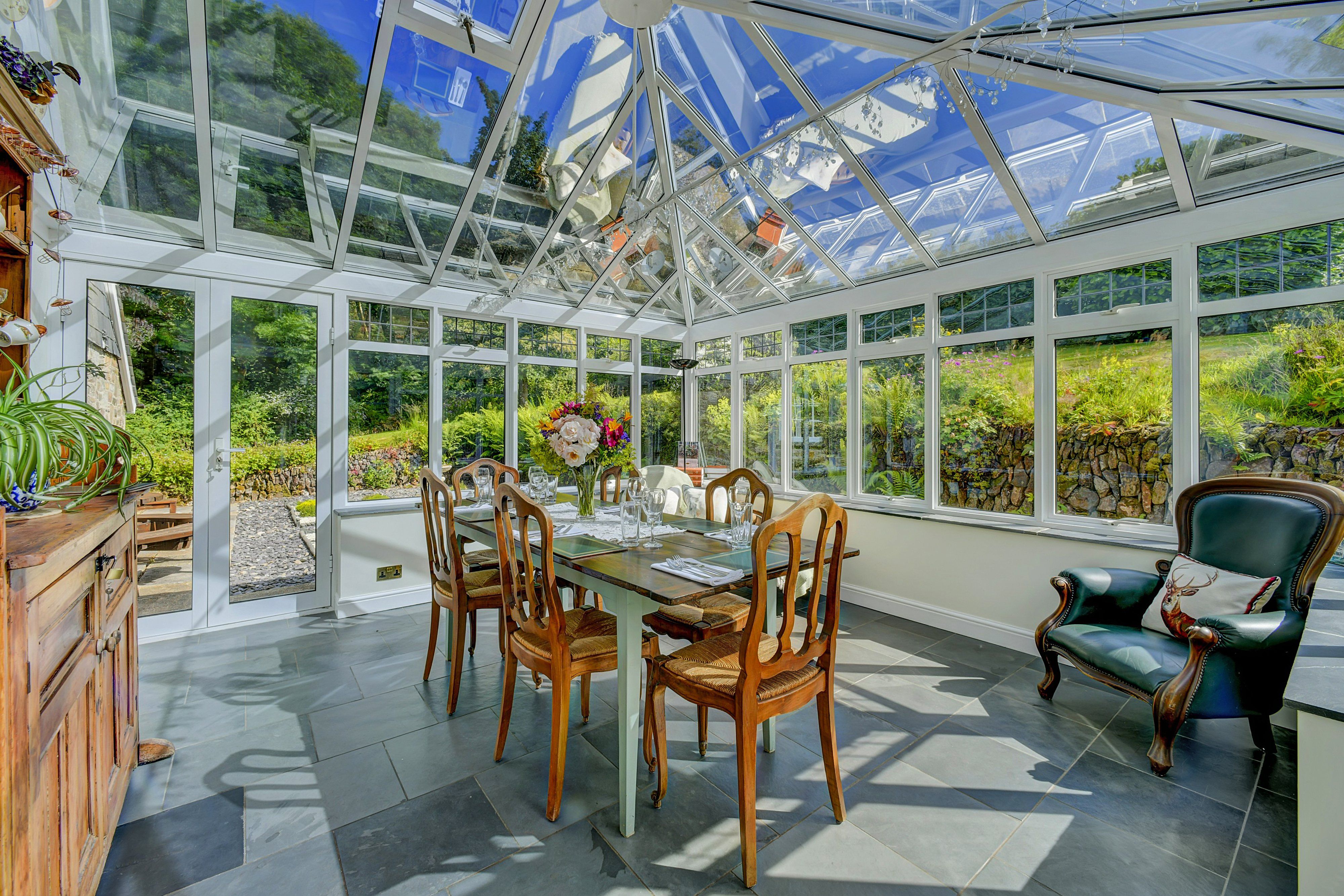 4 bedrooms (one ground floor ensuite double with shower room and dressing room, one first floor super-king-sized double, one further first floor double, and one first floor twin) Large ground floor sitting room with huge inglenook fireplace and wood-burner Well-equipped ground floor kitchen with adjoining utility room Conservatory dining area with large oak table and comfortable seating for up to 8 guests Further ground floor breakfast room First floor bathroom with bath, hand basin, and separate toilet Wifi (though please note mobile phone signal unavailable), oil-fired central heating plus shower room/conservatory underfloor heating, and electricity included in cost Bed linen, luxury towels, bathrobes, and welcome pack (containing bread, milk, local biscuits, homemade cake, bottle of house-wine, cider, and local coffee and tea) Pets welcome (max. 6, supplement of £15)