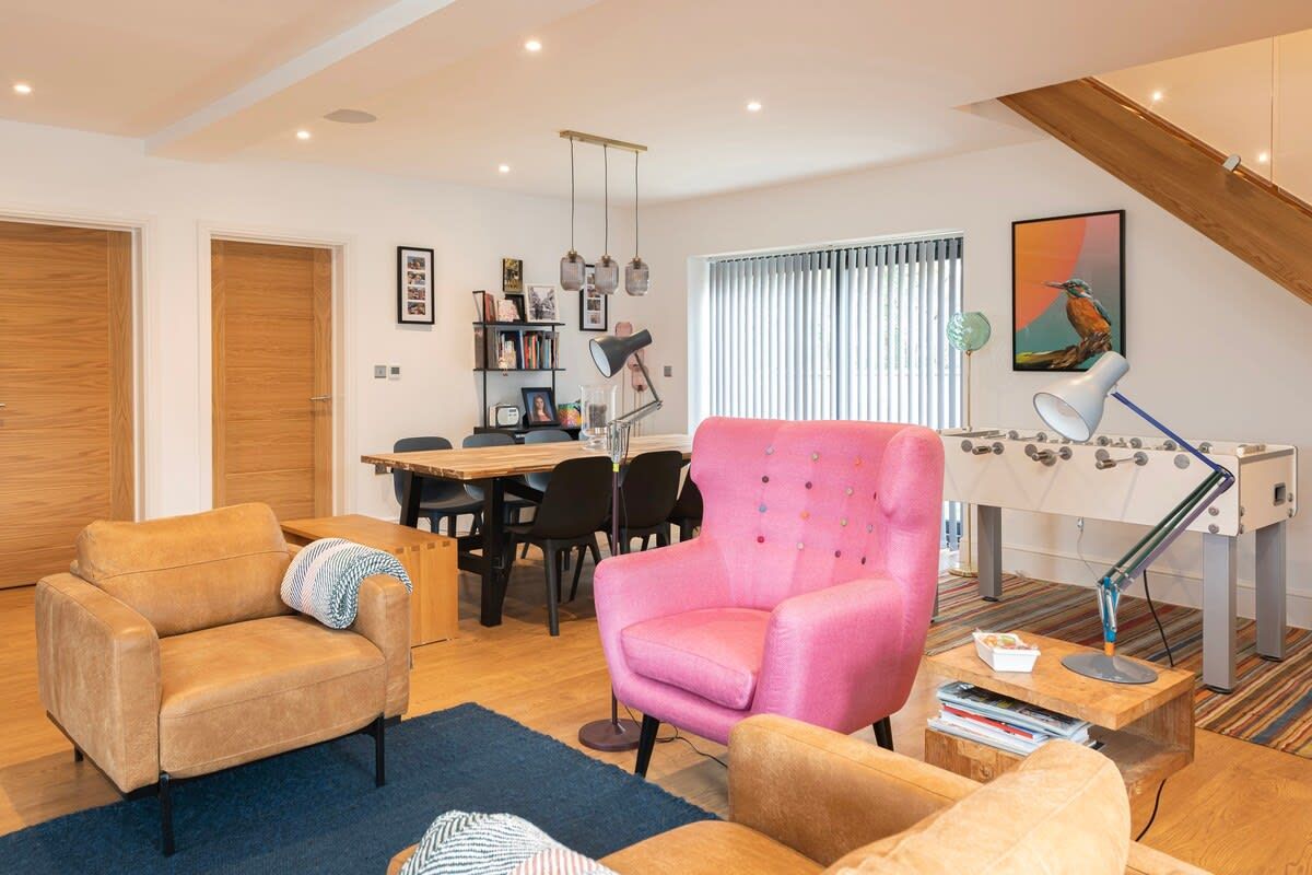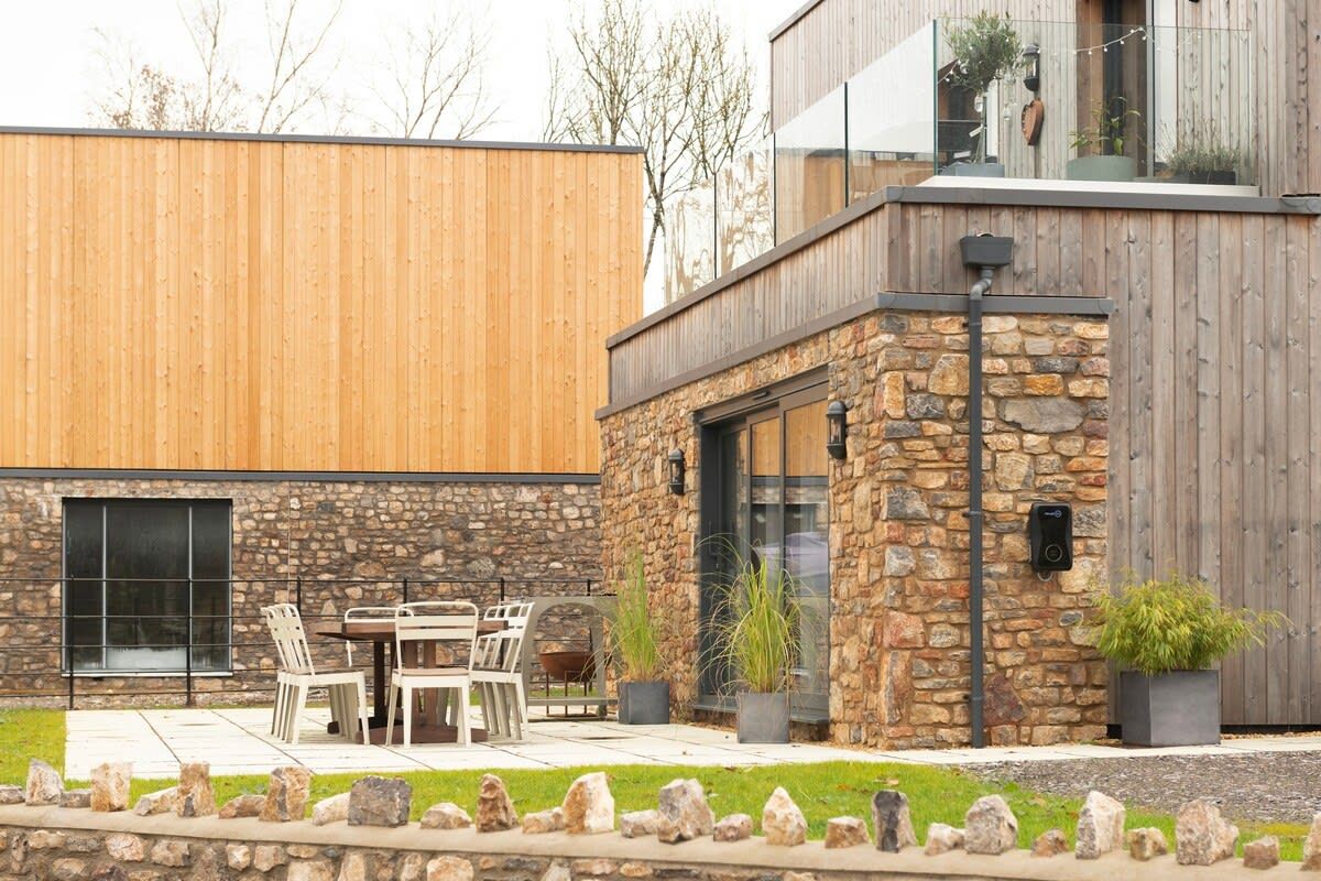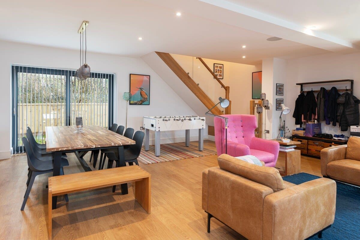 This unique home is the perfect place to relax and enjoy a holiday in the Somerset countryside. The house is located on a 450-acre estate in Somerset, approximately a thirty-minute drive from the historic centre of Bath. You’ll have everything you need for a comfortable stay, including a garden with a pizza oven, a stunning open-plan living, dining, and kitchen space with double-height ceilings, and a gym room. The bedrooms are comfortable, and the main bedroom has a balcony that boasts wonderful views.