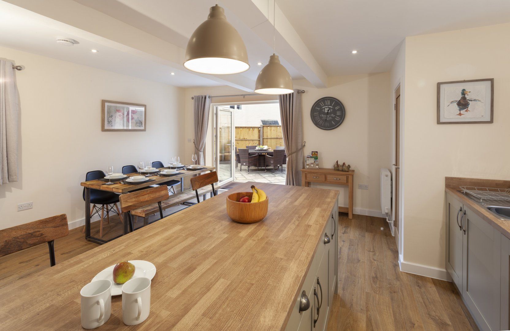 Open-plan kitchen with breakfast bar and stools; the kitchen has recently been totally refitted (2019) and includes all new appliances such as electric oven and hob, microwave, washing machine, 60/40 fridge-freezer and dishwasher