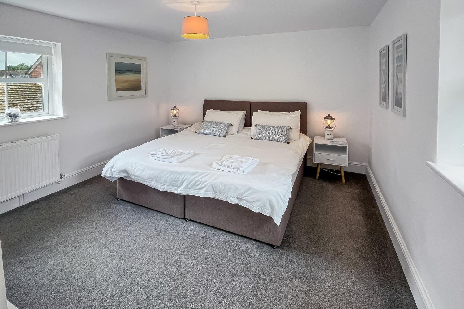 The bright master bedroom benefits from dual aspect windows and has a super king-sized bed and is perfect for a honeymoon suite or brides’ room. It has a dressing table, double wardrobe and 2 bedside tables.