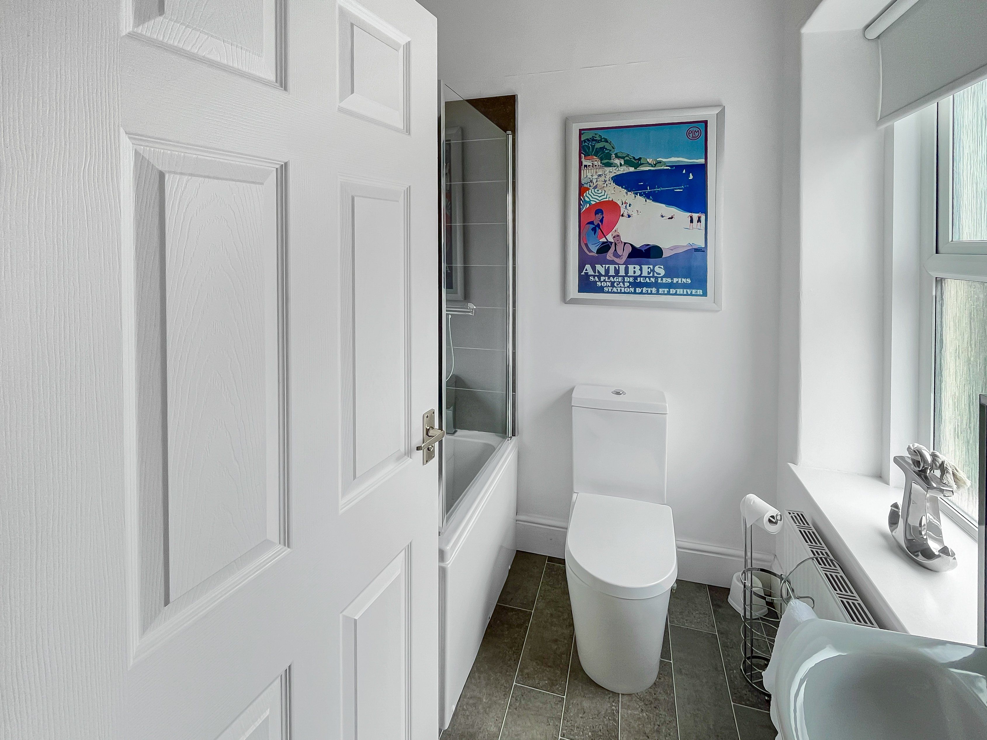 The family bathroom has a large quadrant shower, toilet and hand basin.