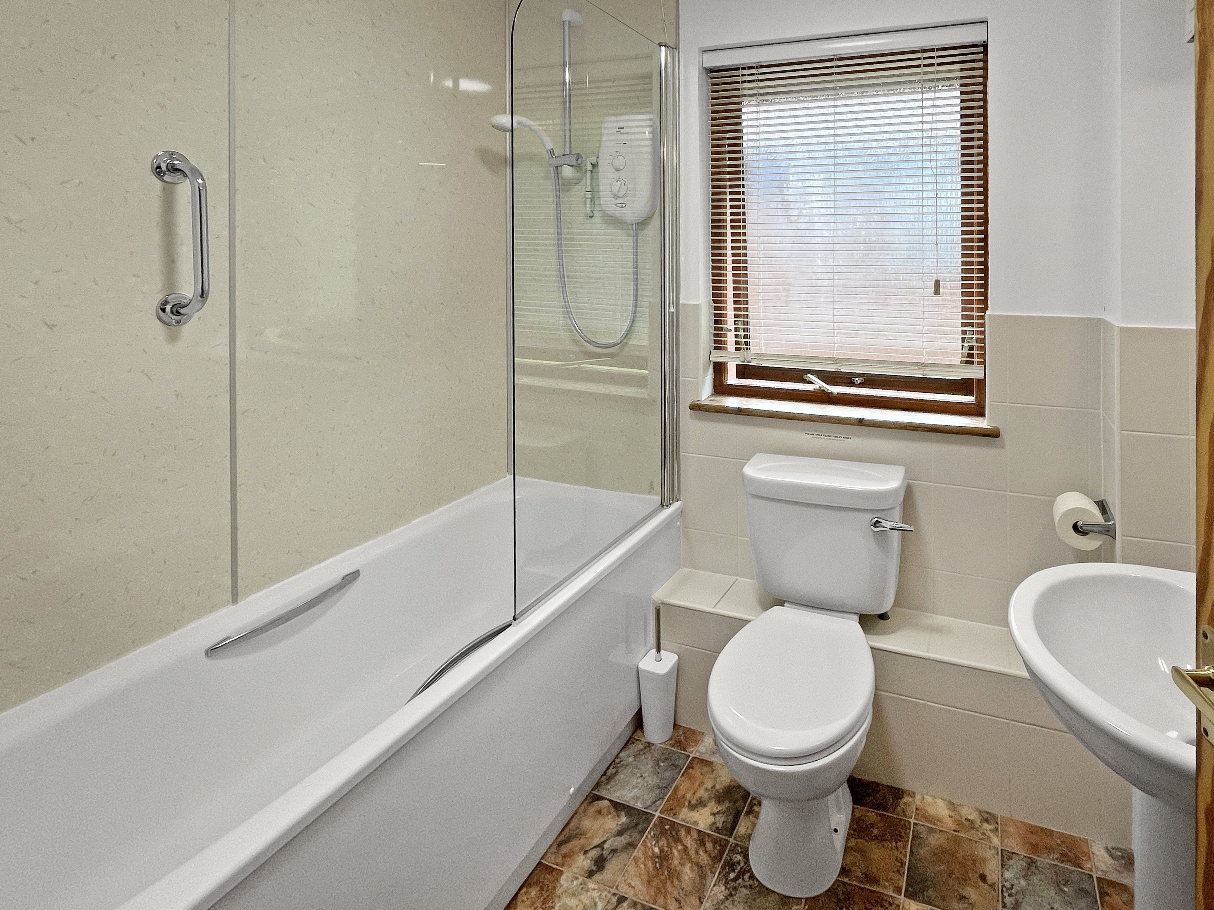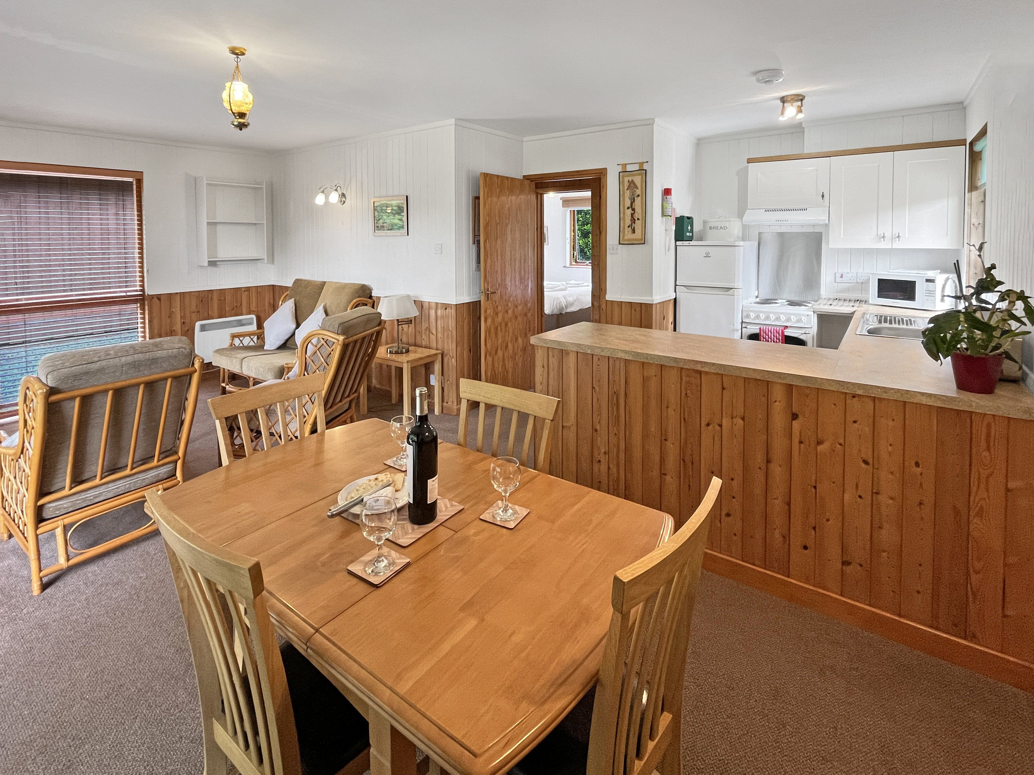 The kitchen area is separated by a breakfast bar and has a fridge freezer, microwave oven, electric oven, and toaster and is fully equipped with all utensils and crockery. It has the additional benefit of a dishwasher.