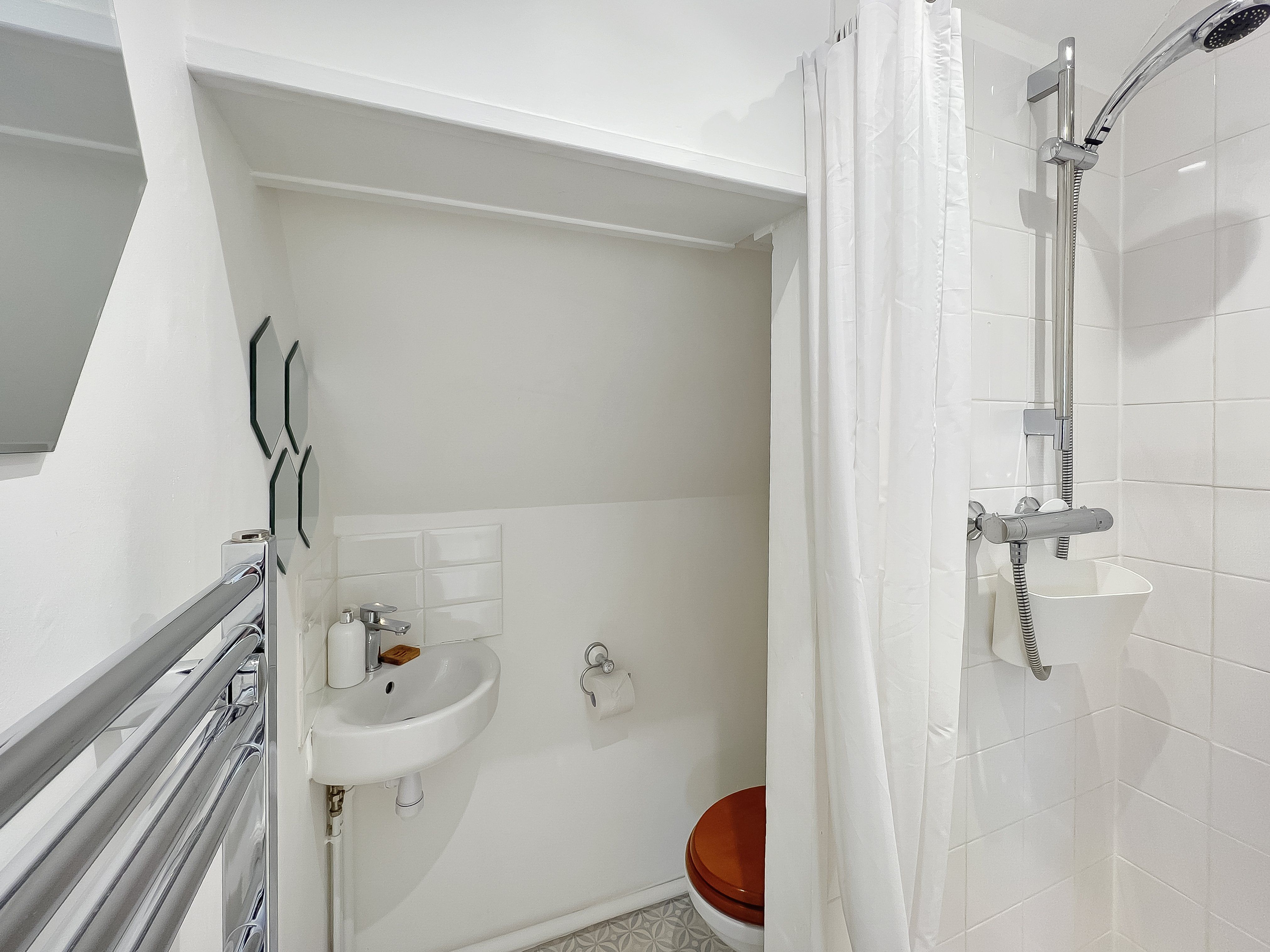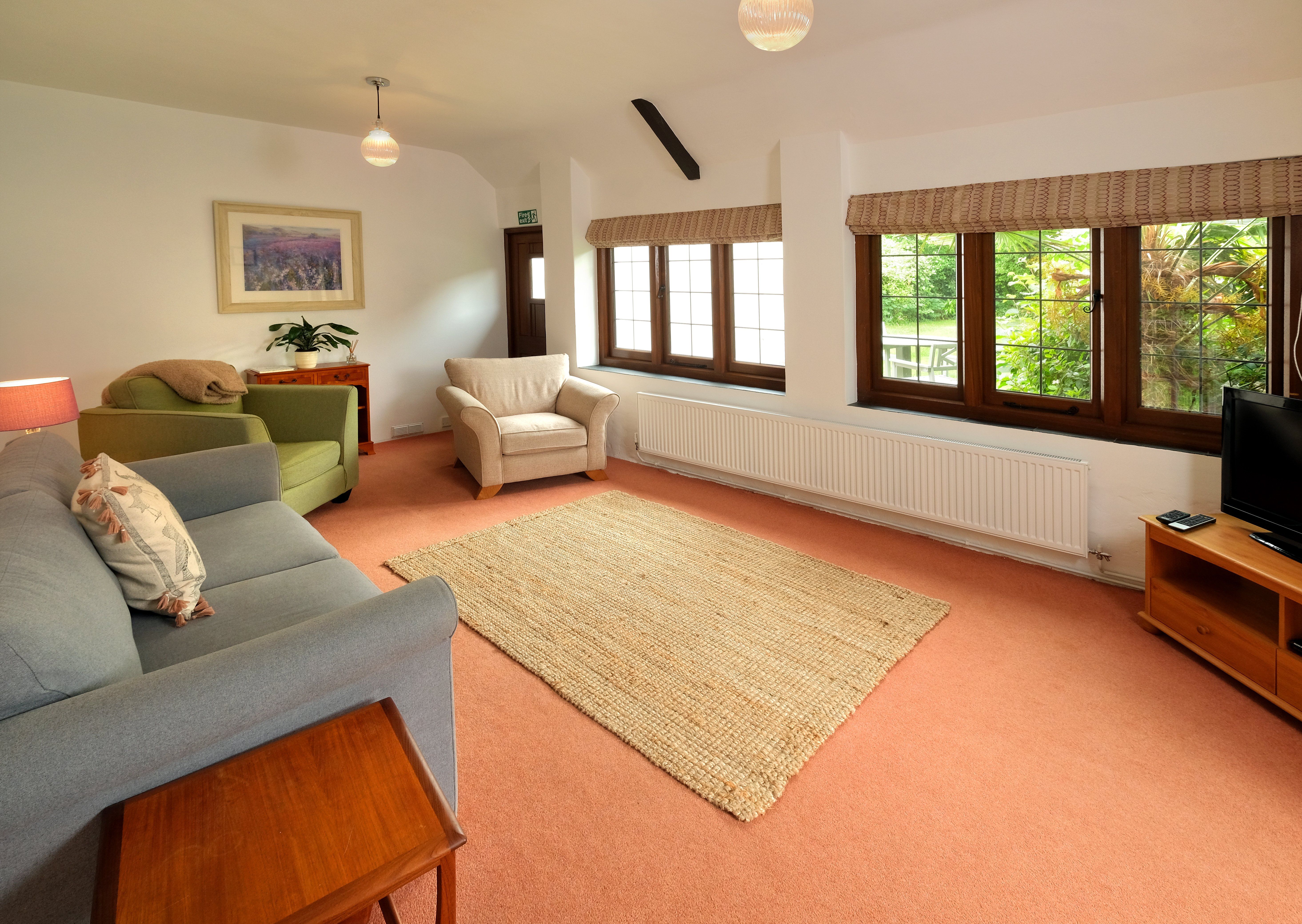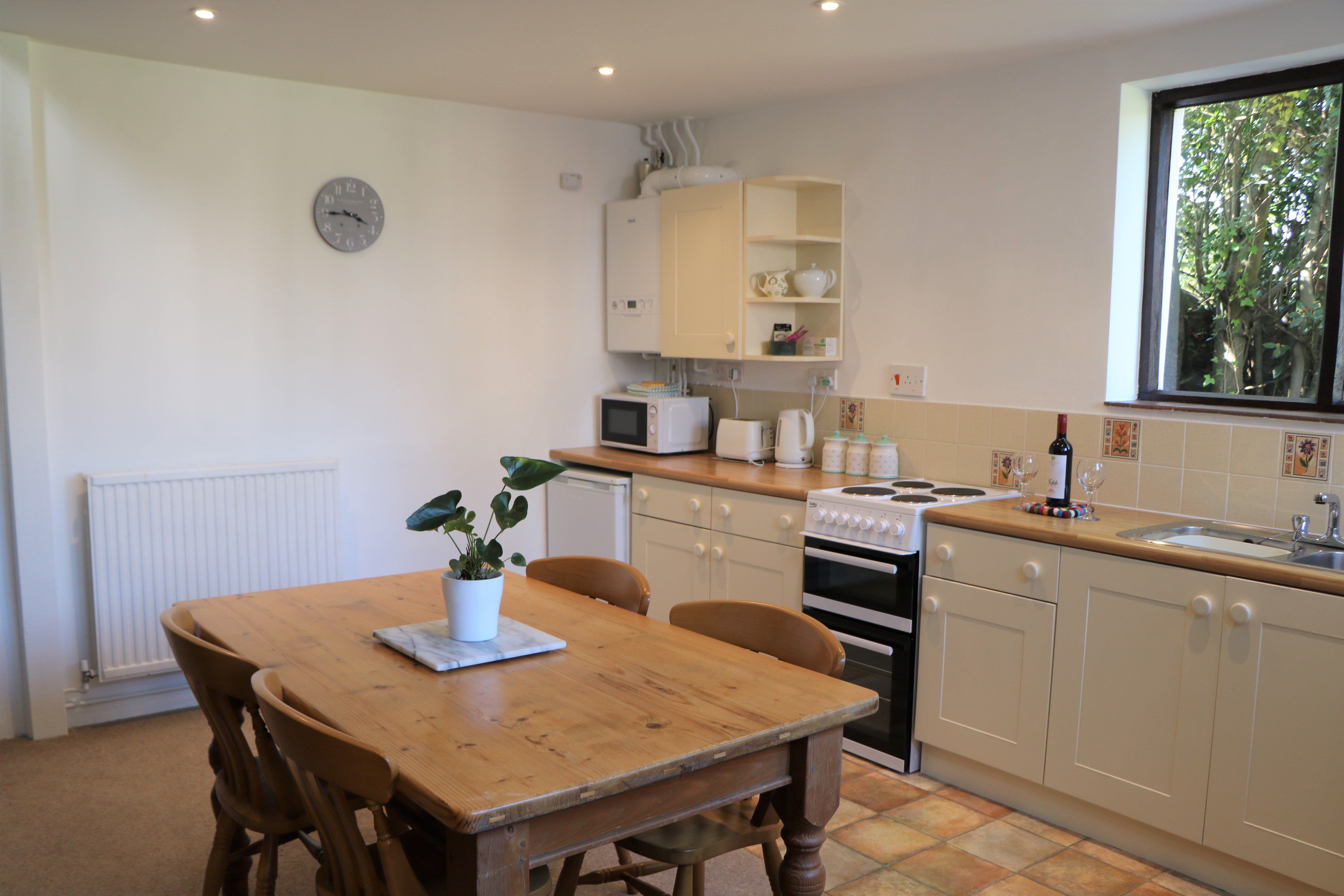 Facilities Freeview TV, DVD player, sofa (which is a sofa-bed for sleeping 2 guests if required), and patio doors leading to the private garden. Kitchen/dining room with cooker, microwave and fridge. Spiral stairs lead upstairs to the first floor where you will find the bedroom with double bed and en-suite with shower room, with toilet and hand basin. There is an external laundry room with freezer, washing machine and tumble dryer, which is shared with other properties on-site (honesty box for use of these facilities).