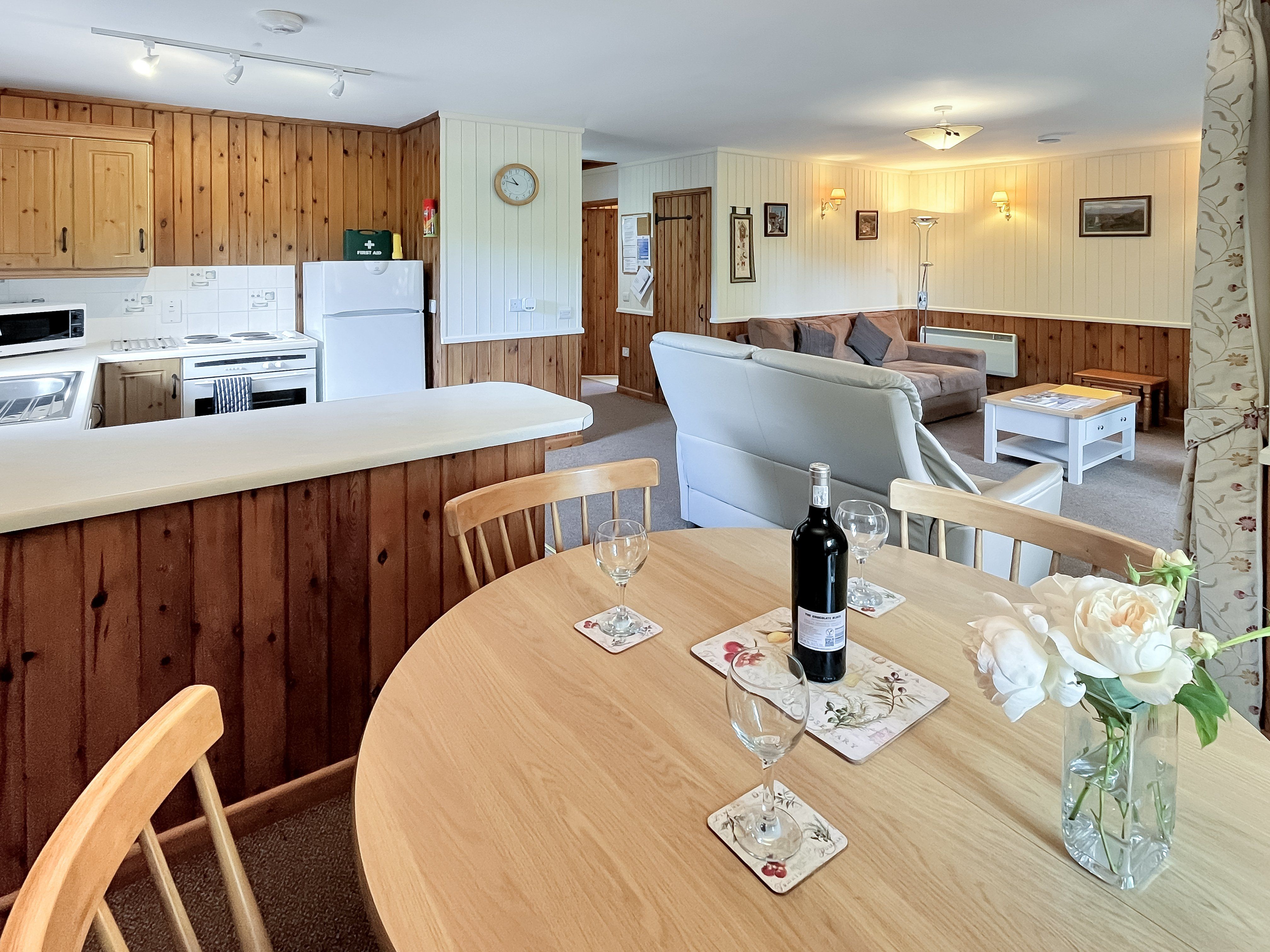The dining area is set at the front of the Lodge on the far side of the breakfast bar with lovely views through its full length picture window and is based on a round table capable of seating up to seven.