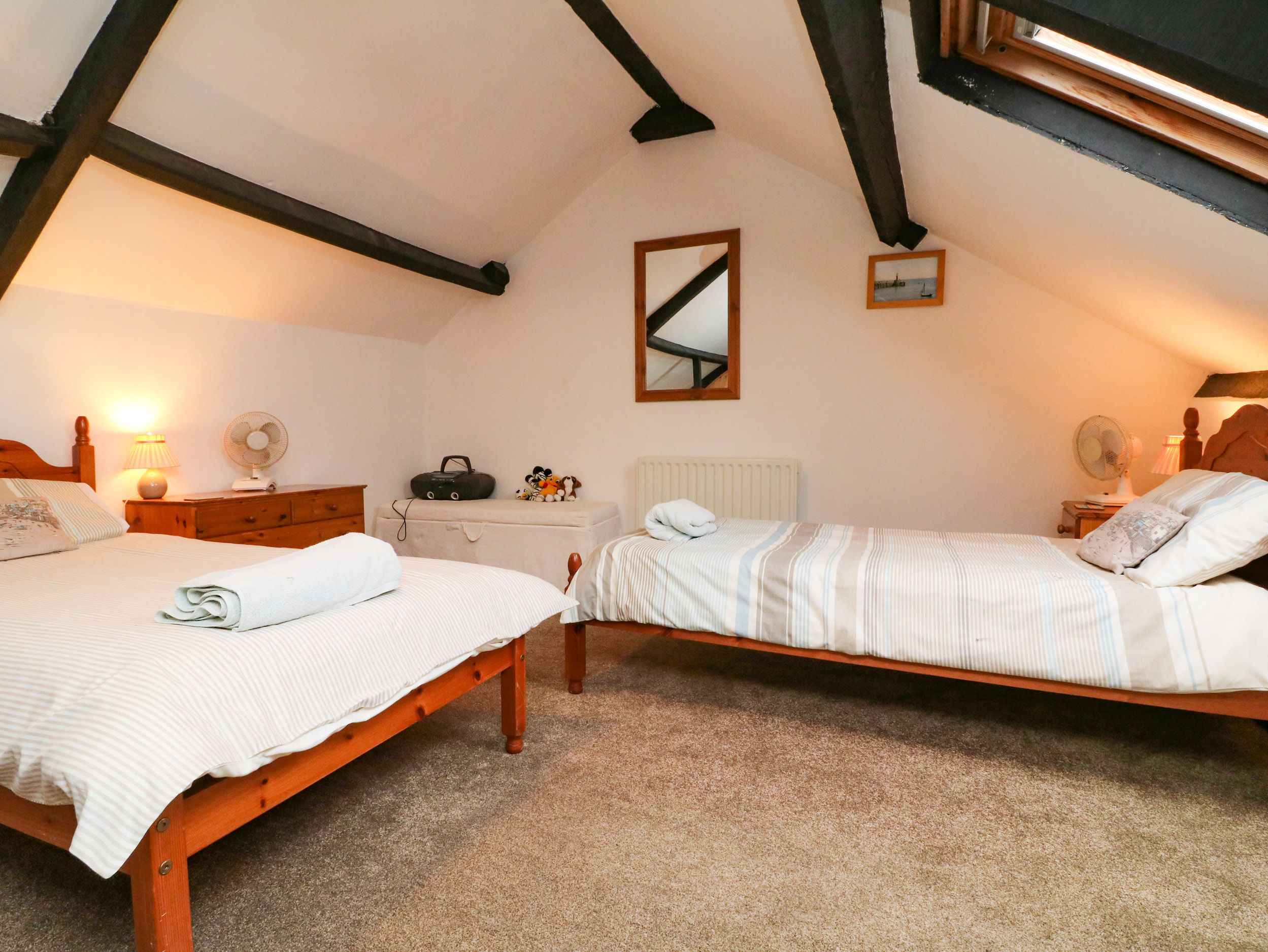 Accomodation Details Over three floors. Four bedrooms: 1 x super-king-size with TV and en-suite shower, basin, and WC, 2 x king-size, 1 x second-floor twin with table tennis. Bathroom with bath, hand held shower, separate shower, basin and WC. Kitchen/diner. Sitting room with Log burner. Snug/hallway