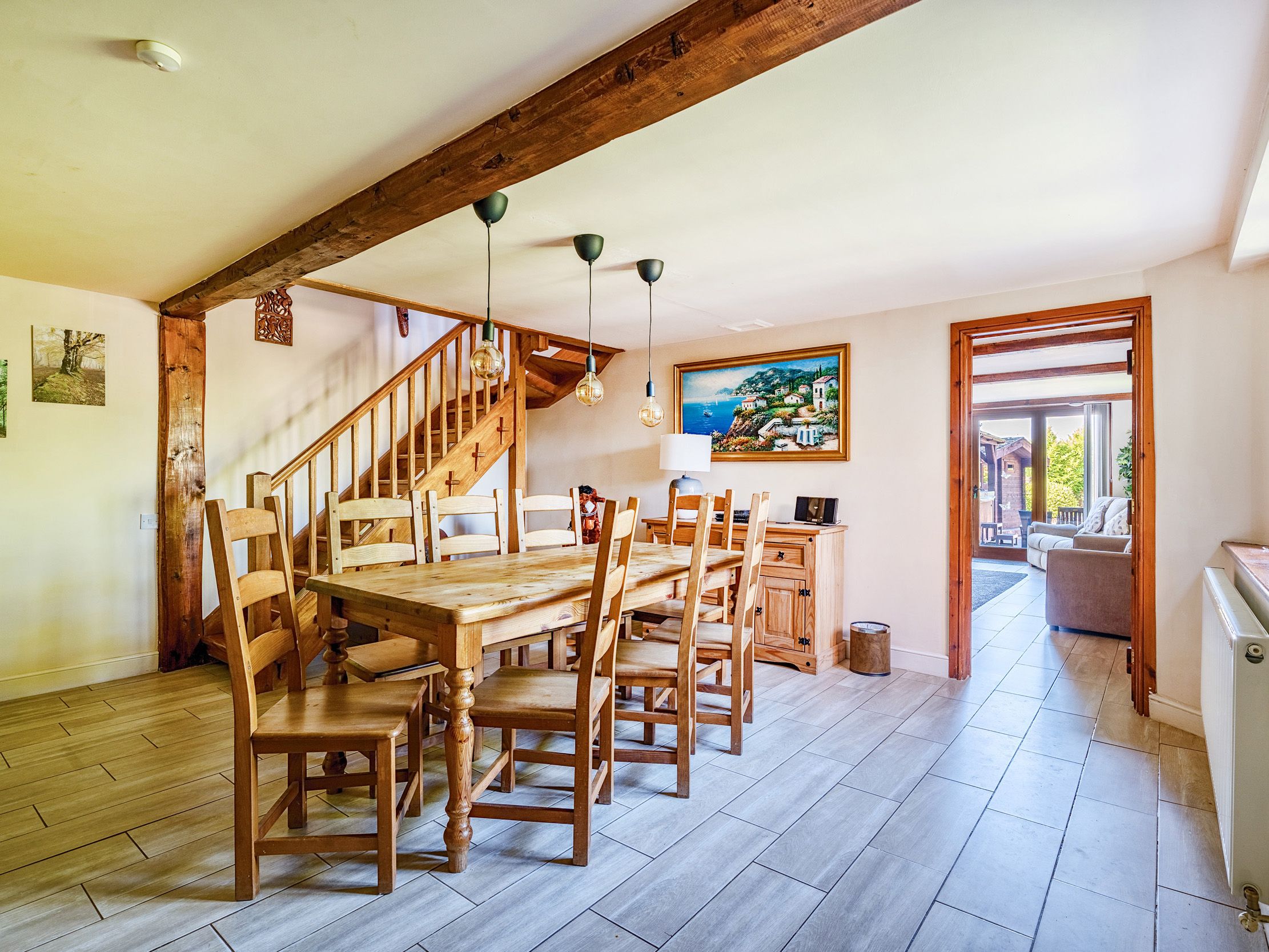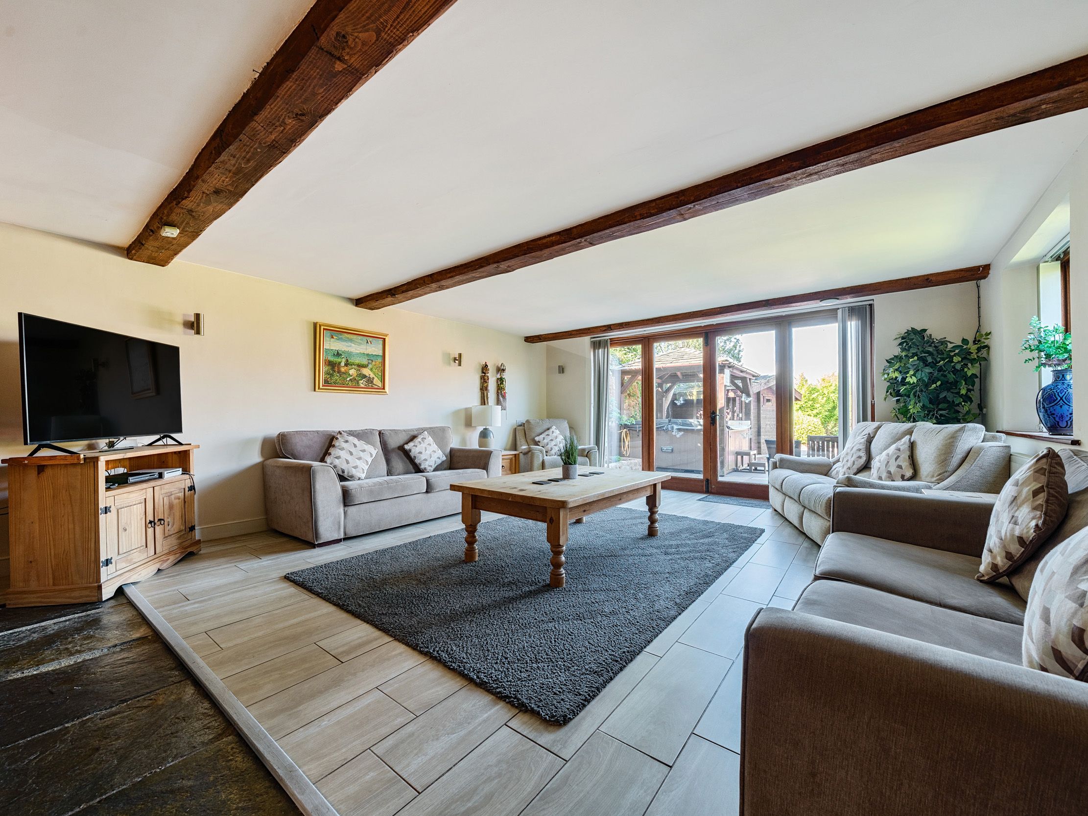 Amenities Oil central heating with woodburning stove. Electric range oven and hob, microwave, fridge, freezer, washing machine, tumble dryer, dishwasher, 3 x TVs with Freeview, 2 x DVDs, CD, WiFi, selection of books. Fuel, power and starter pack for stove inc. in rent, sauna charged via coin meter. Bed linen and towels inc. in rent. Cot, highchair and stairgate. Off road parking for 3 cars. Private patio and small lawned garden with furniture and BBQ leading to shared lawned garden opening on to accessible field. Sole use of hot tub and outdoor sauna (coin-operated). Two well-behaved dogs welcome. Sorry, no smoking. Shop and pub 5 mins walk (some walking along road, no pavement). Note: There are outdoor steps and a stream in the grounds. Note: The drive at the property is only large enough to accommodate family-sized cars, up to people carriers. Note: There may be some road noise. Note: This property has a Good House Keeping bond of £200.00