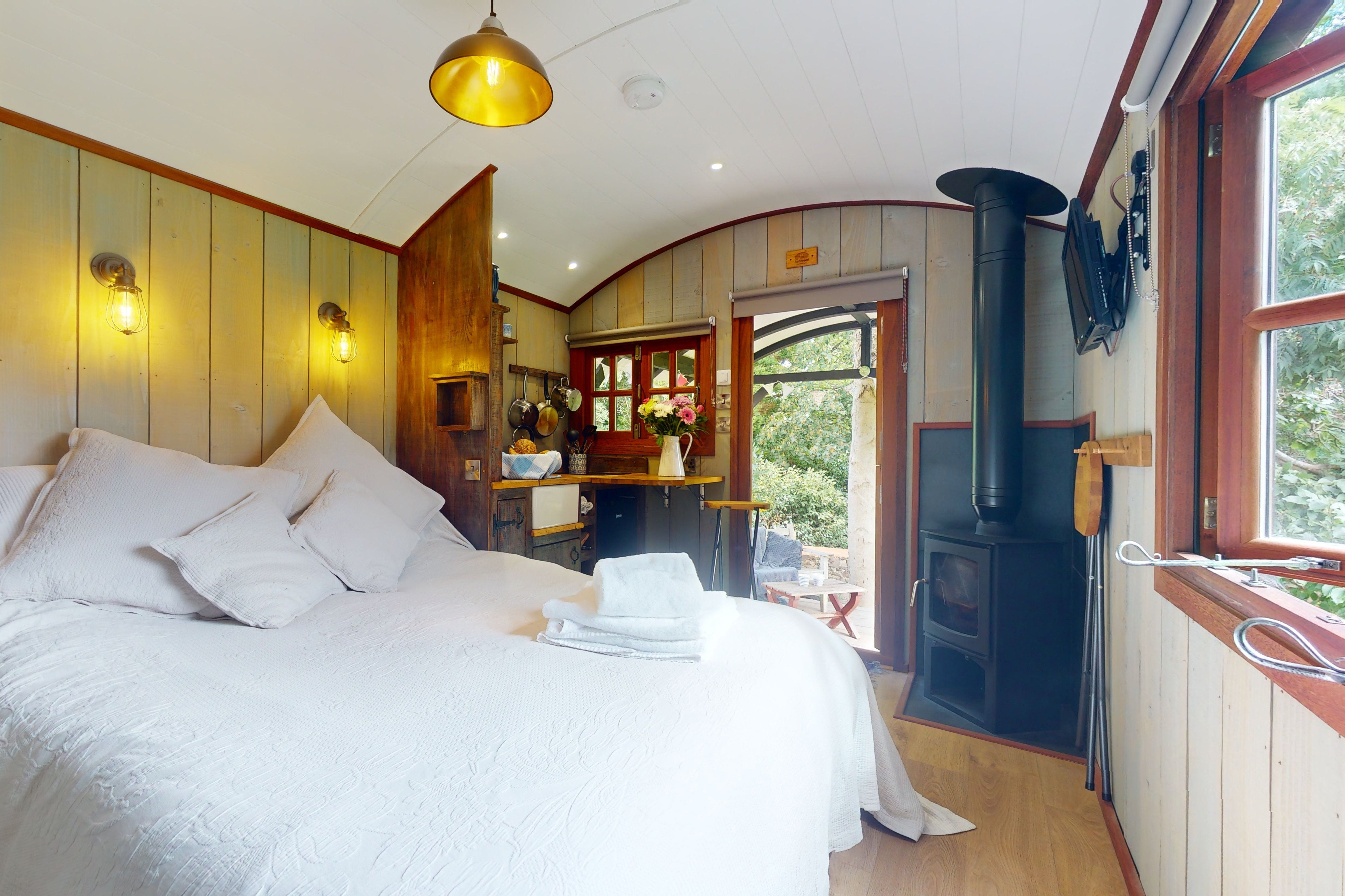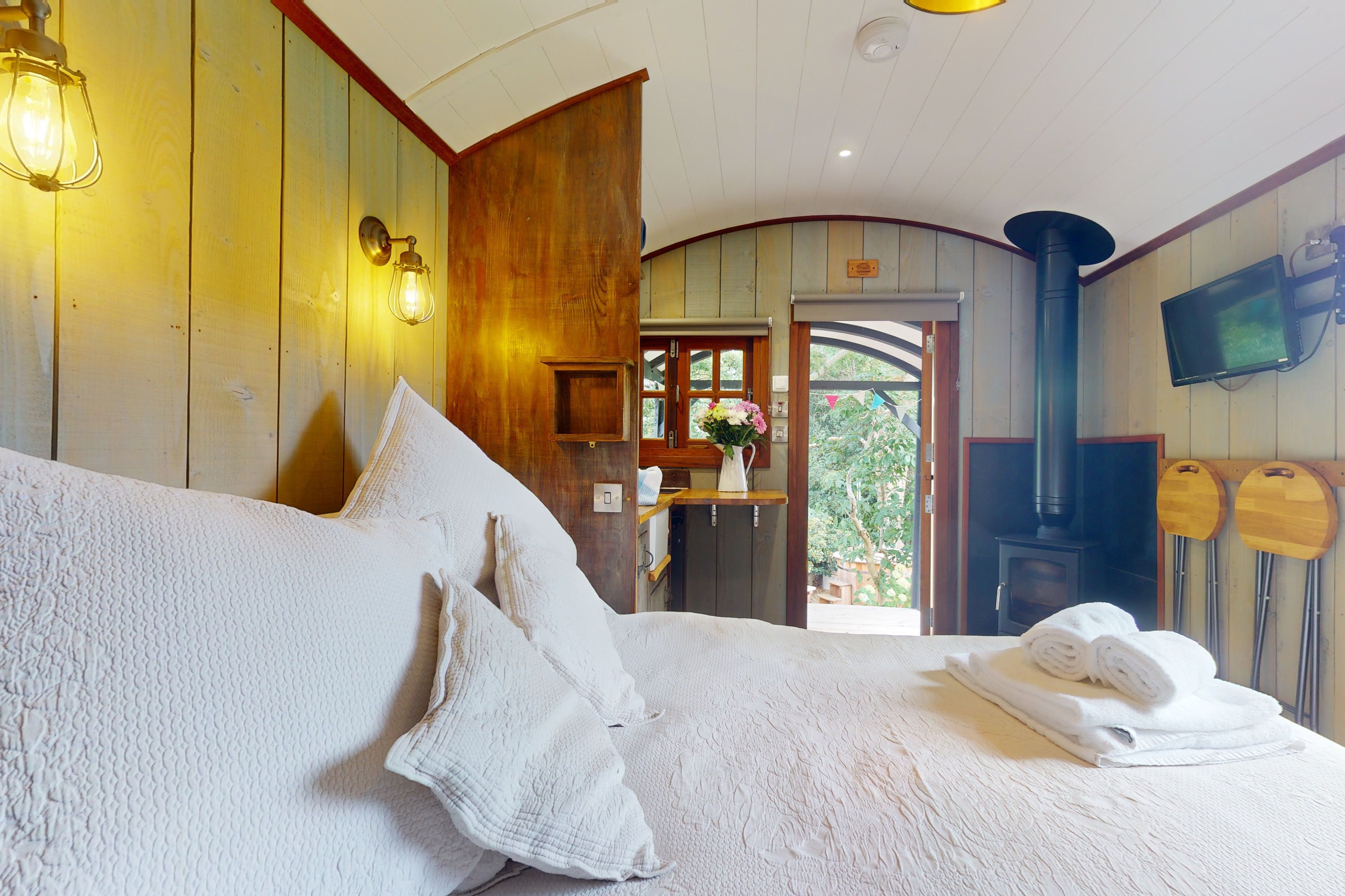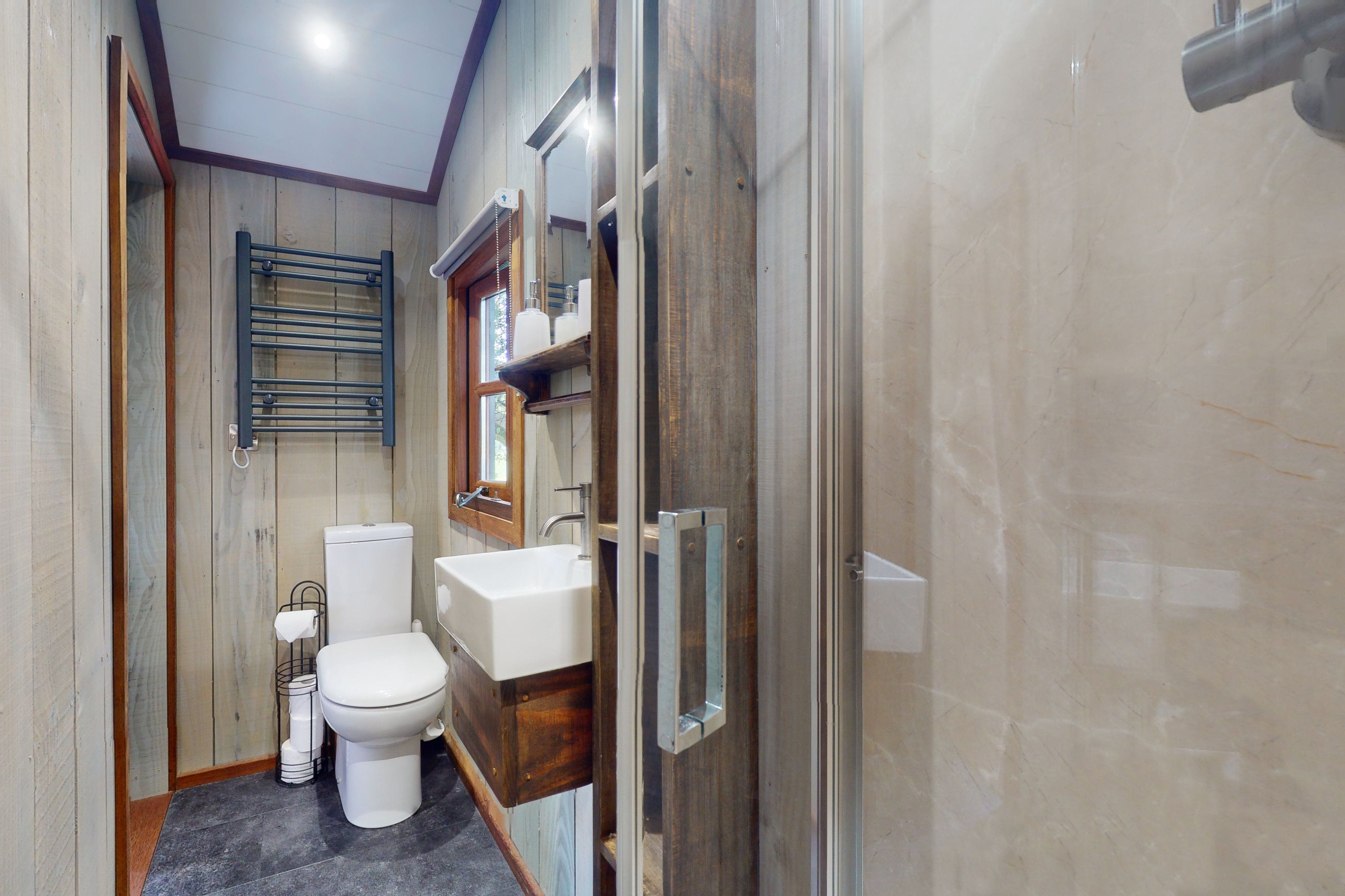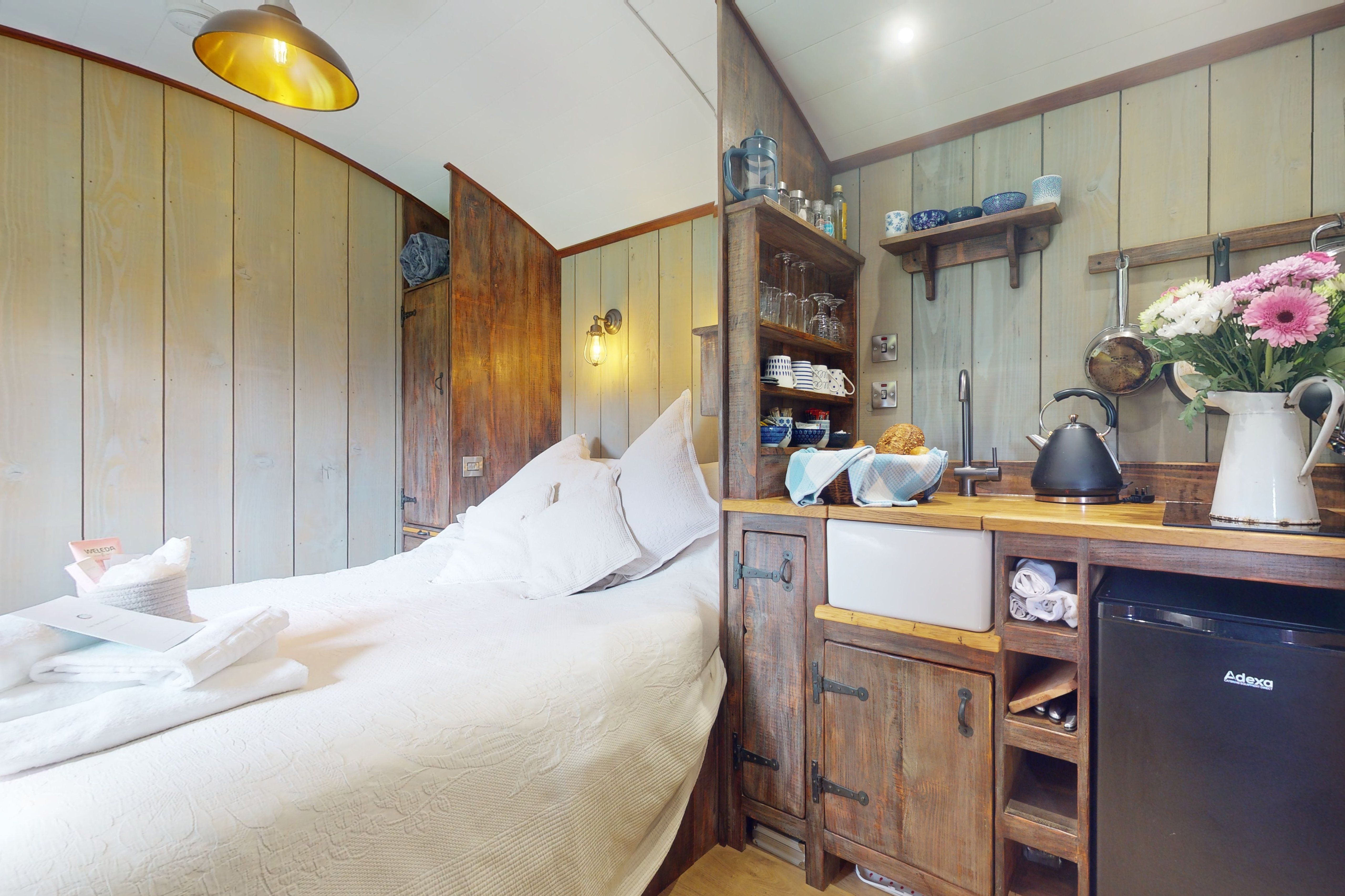 Facilities The bed forms the centre of the space and looks directly out over private fields. There is under-bed storage, wardrobe space and shelving for your clothes and an en-suite shower room, with toilet, hand basin and heated towel rail. Bed linen and towels are provided.