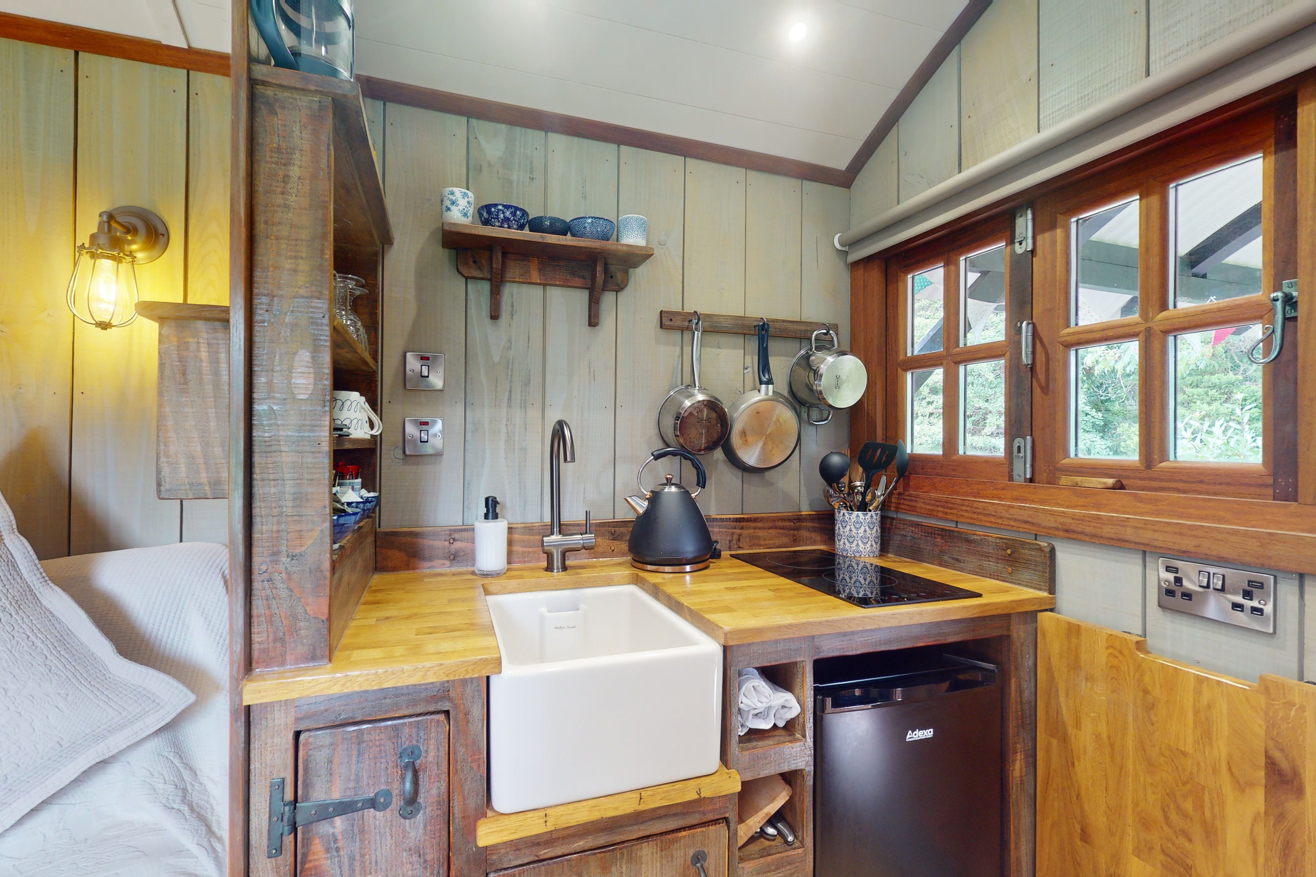 The kitchen area has a double ceramic hob, fridge (with ice box compartment) and a fold out table area, useful for food preparation or storage. There is also a kettle, cafetiere, toaster and all pots, pans, utensils, cutlery, crockery and glassware provided.