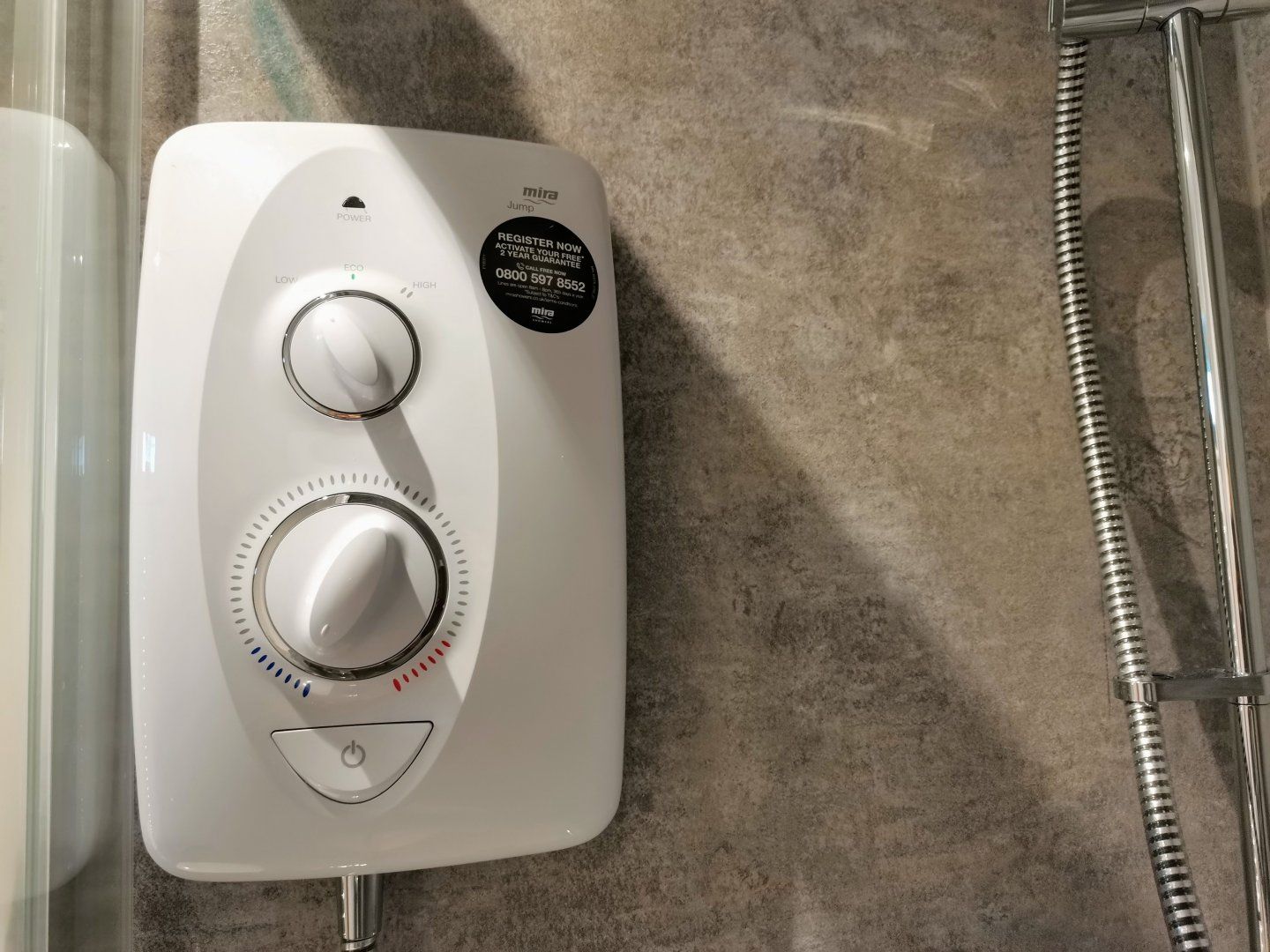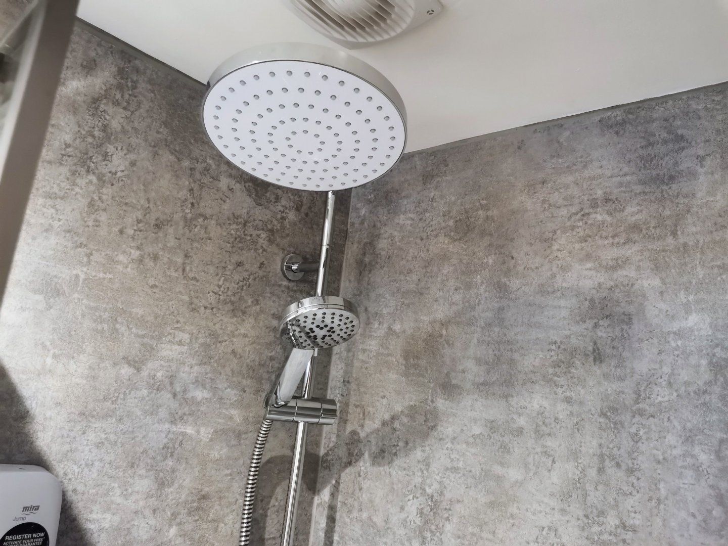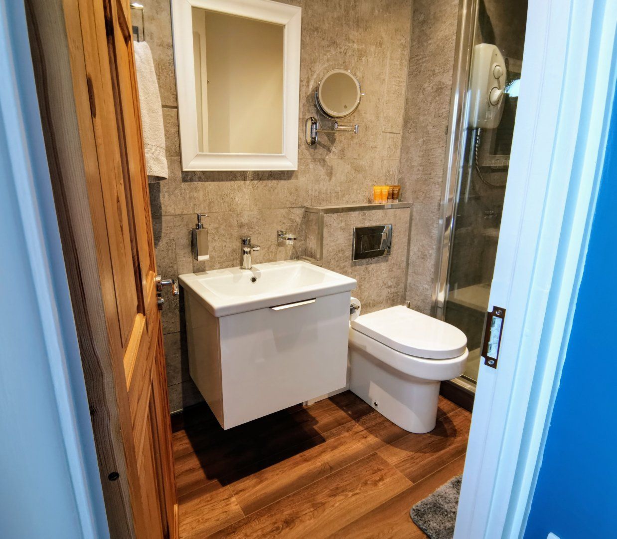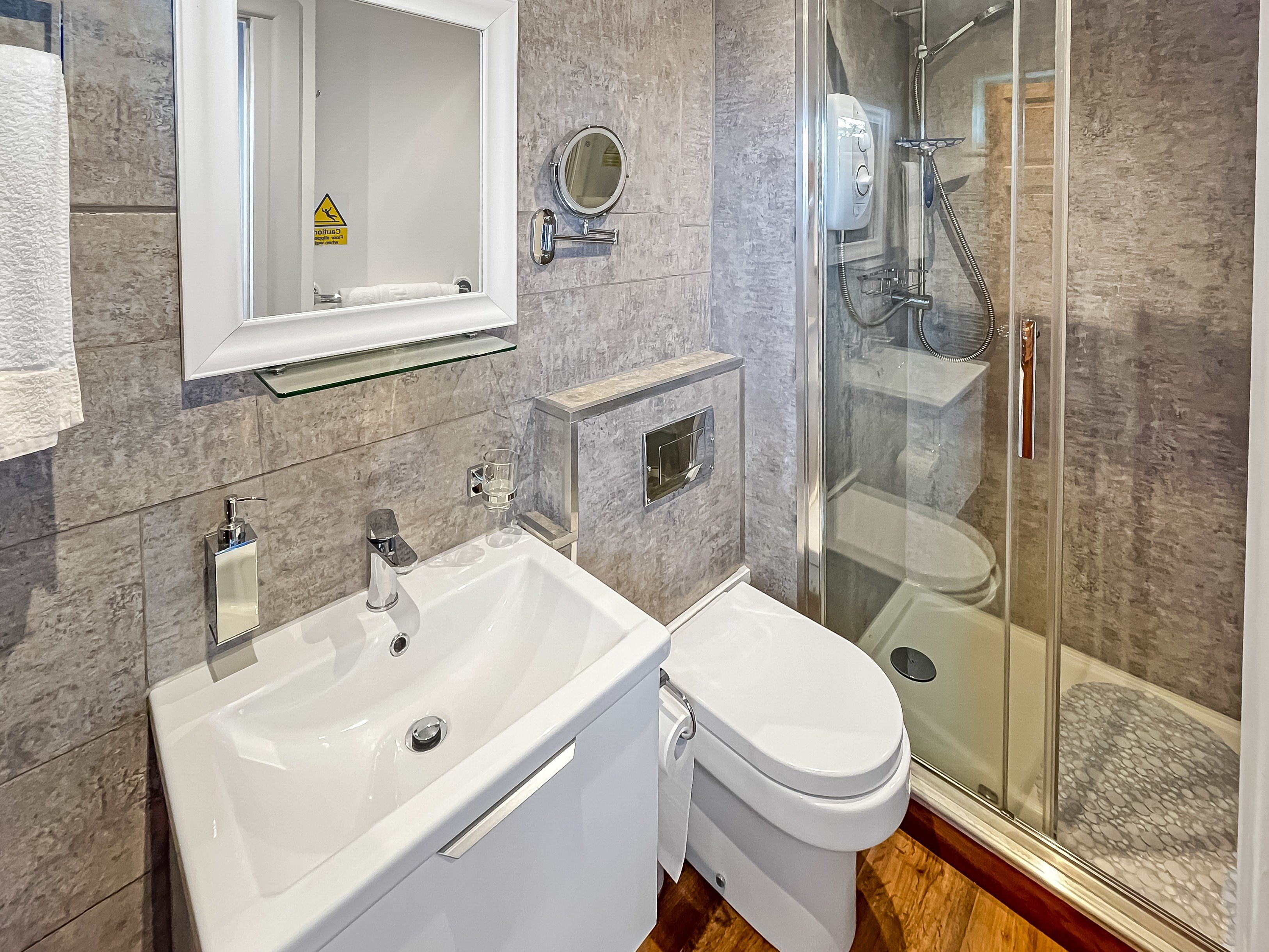 The shower room is off the entrance lobby, comprising walk-in electric shower, toilet and hand basin.