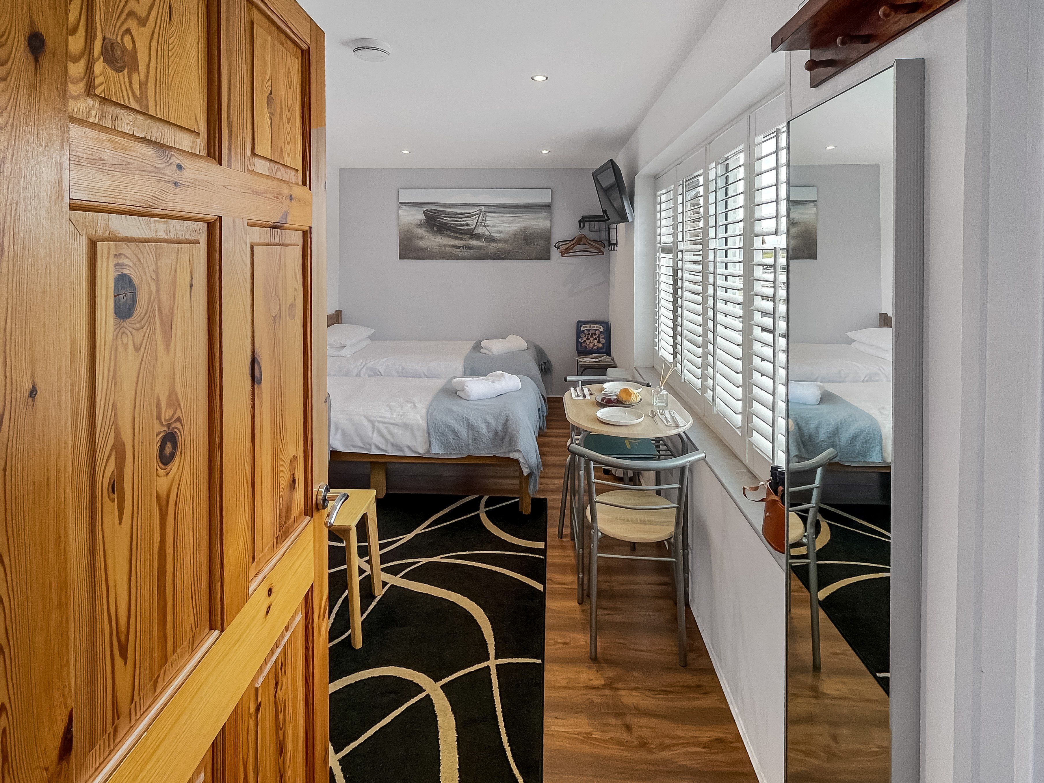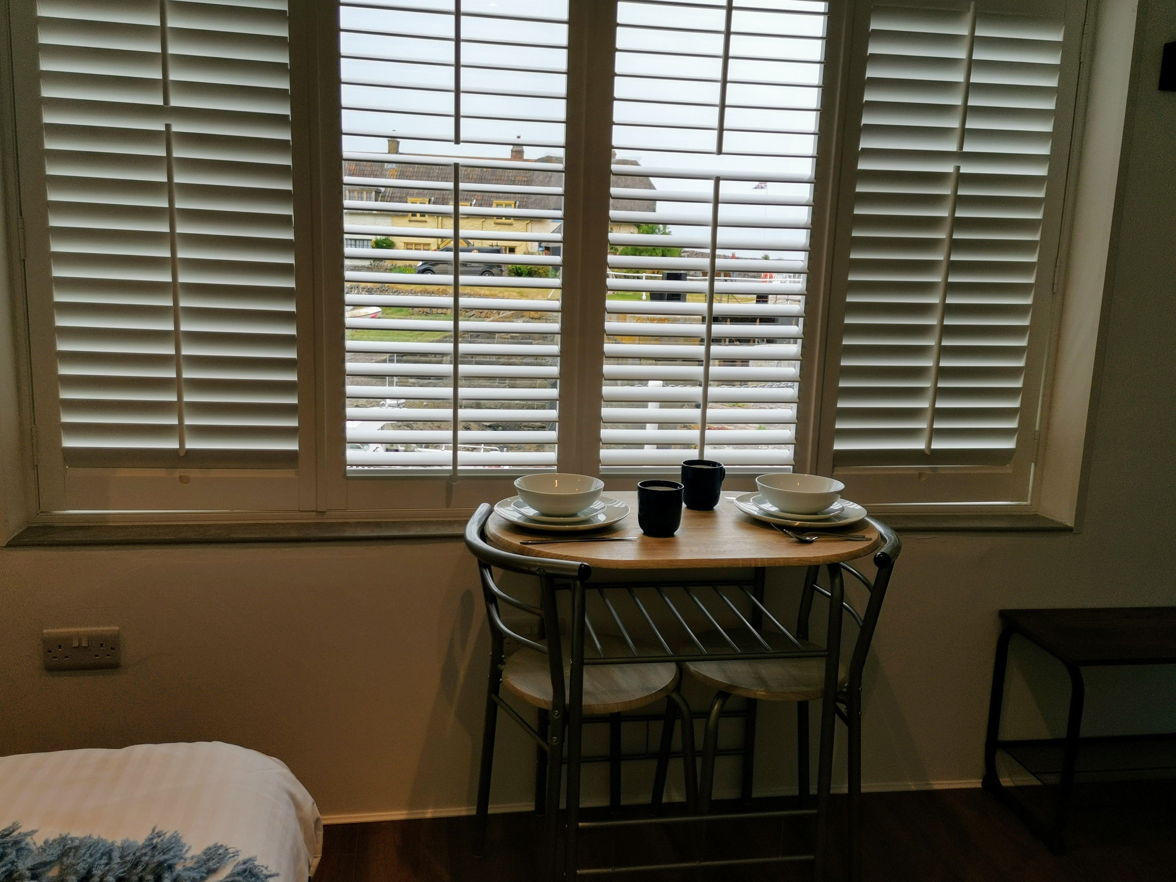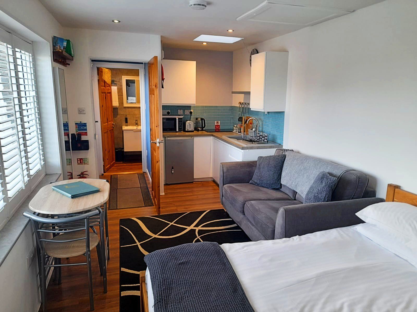 The small kitchenette is equipped with an under-counter fridge (with freezer compartment), microwave-grill, air-fryer, toaster, sandwich maker, kettle and electric hob. Its ideal for those who want to make their own breakfast or brunch and prefer to eat their main meals out and about.