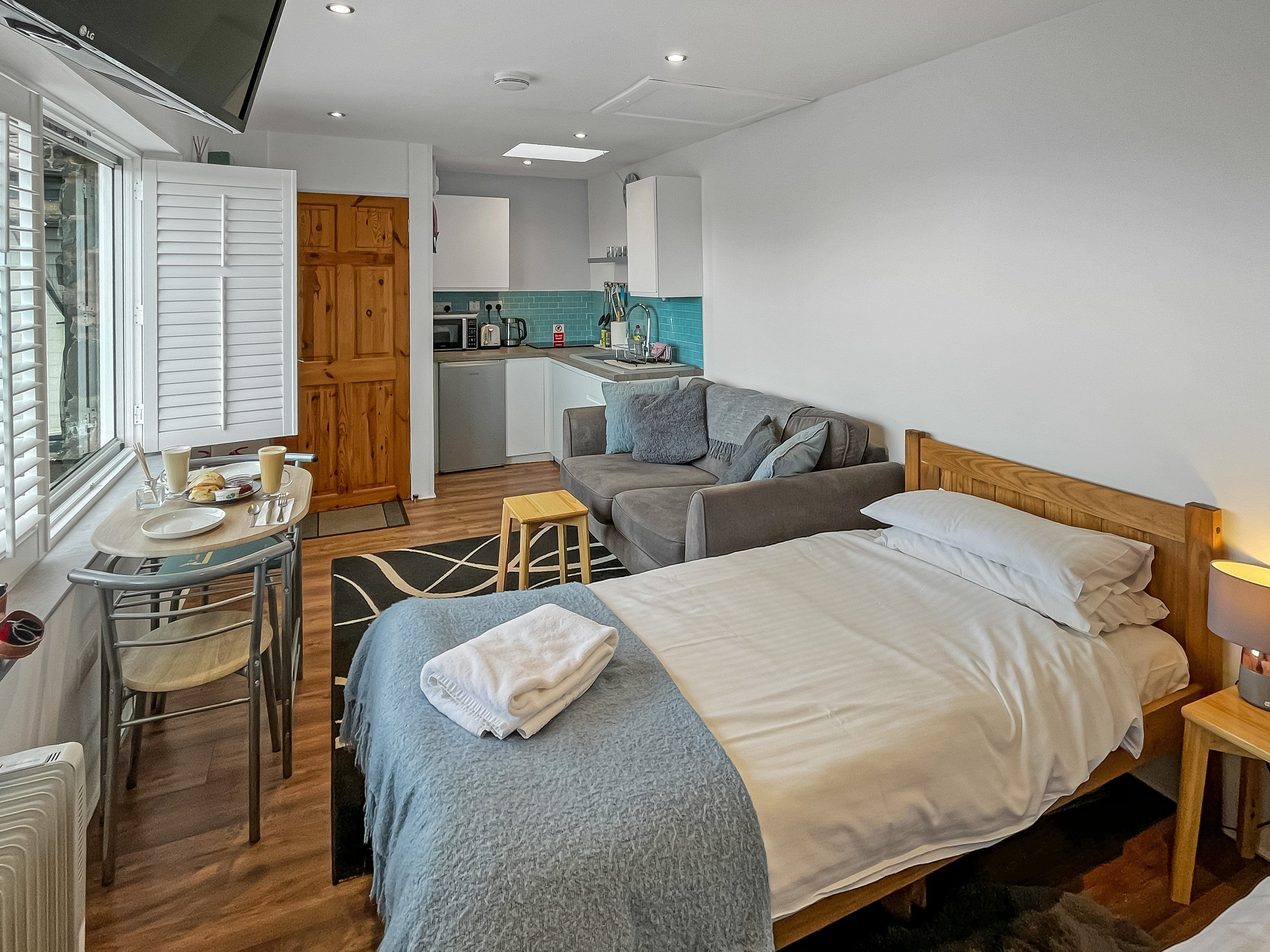 With a prime location right next to the harbour, Harbour House Studio is perfect for sea-lovers who want a front-row seat to the bustling harbour life. The ground floor apartment includes two single beds, a kitchenette with a kettle, microwave/grill, toaster, sandwich maker, and a 2-ring induction hob, and a shower room with a walk-in overhead and handheld shower. Bed linen and towels are provided, and electricity and heating are included.