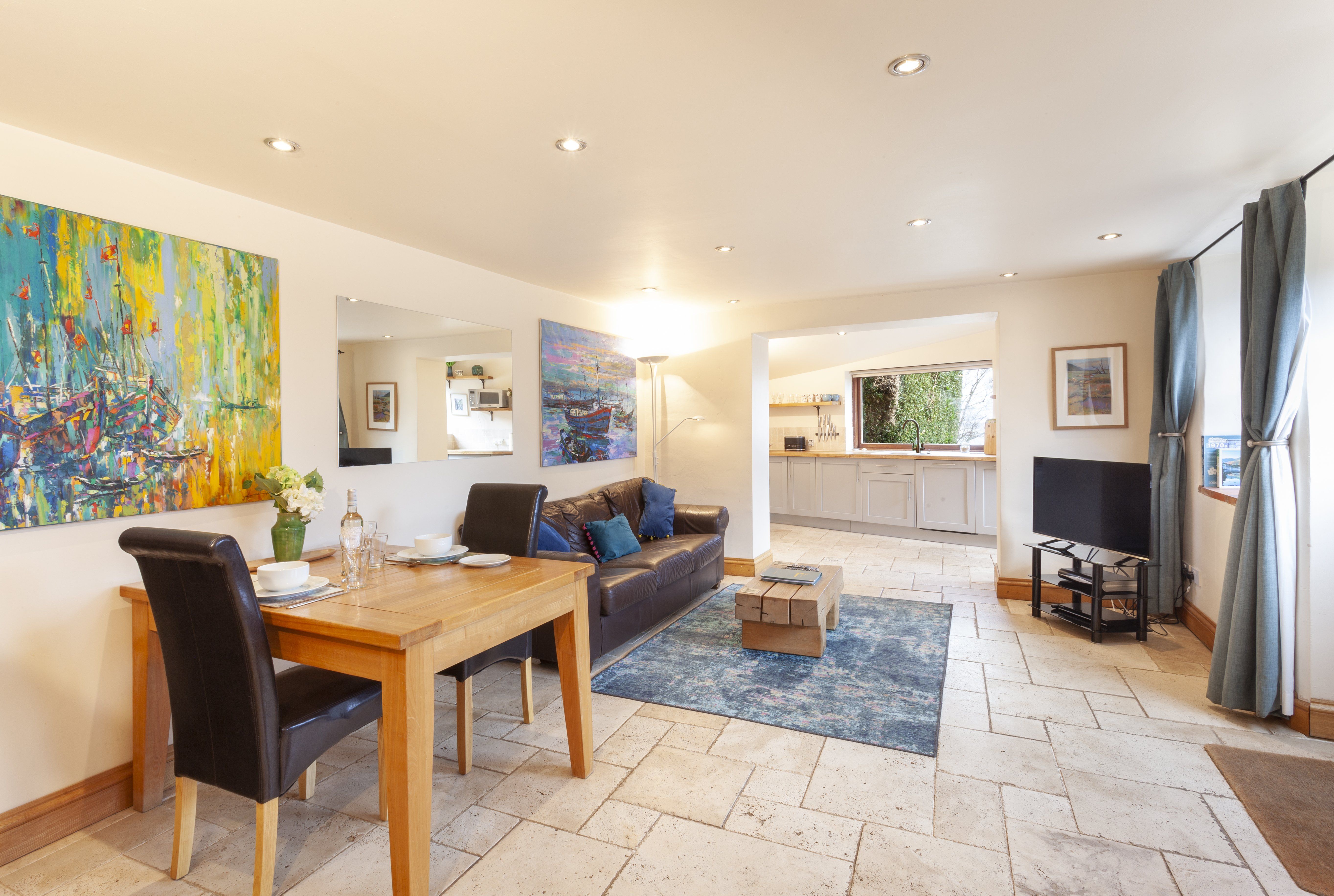Large ground floor open-plan living and dining area with stone flagged floor plus (full Sky) television/DVD player/CD player