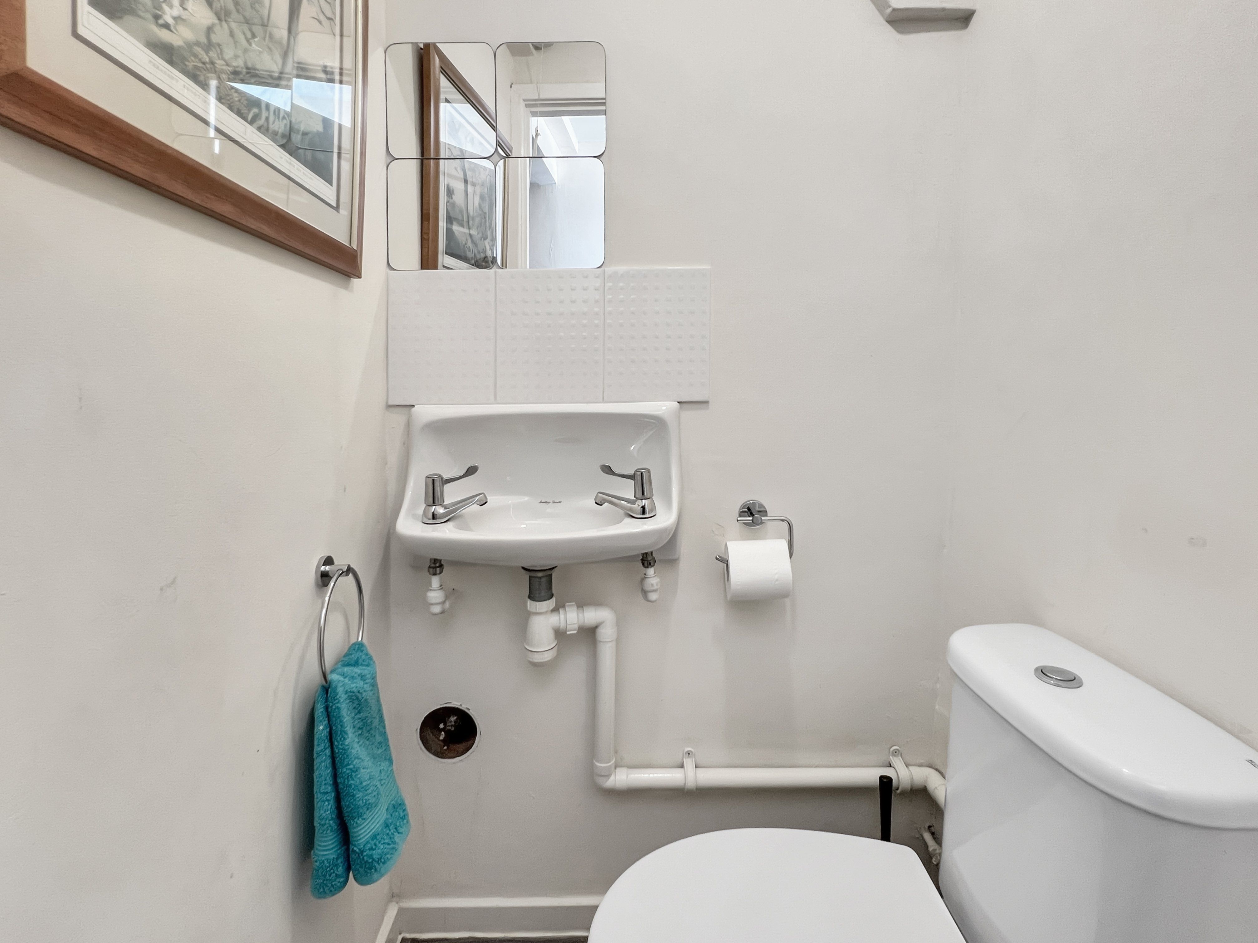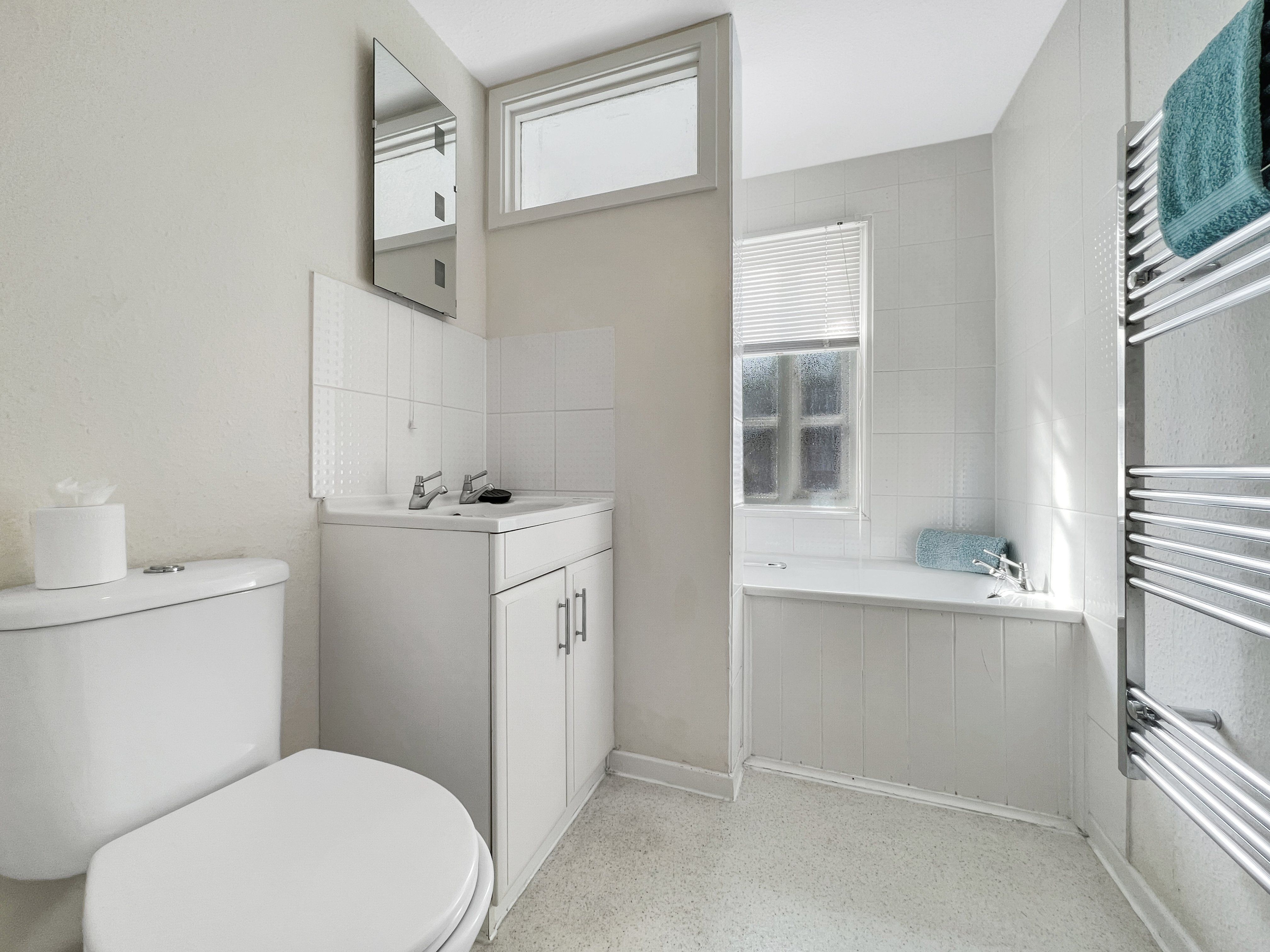 Recently updated first floor bathroom with powerful shower over bath and modern large towel rail