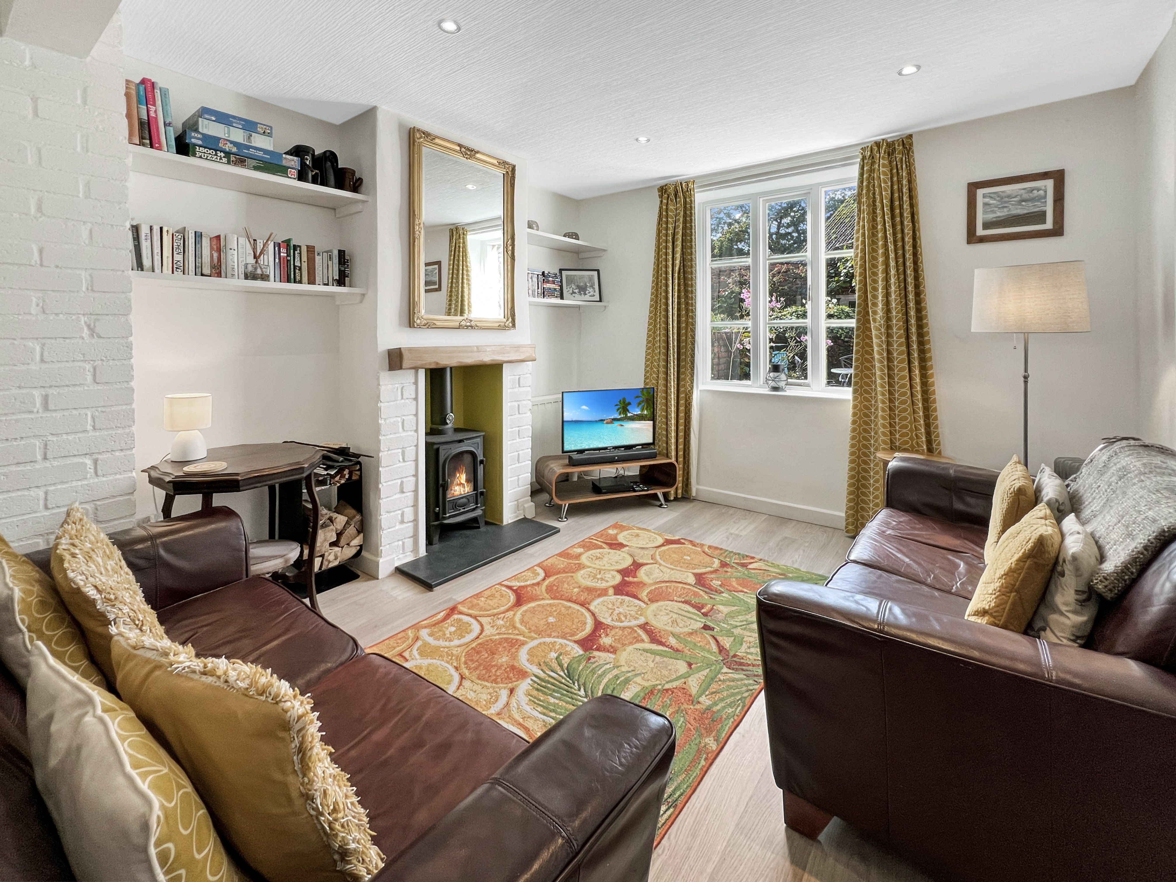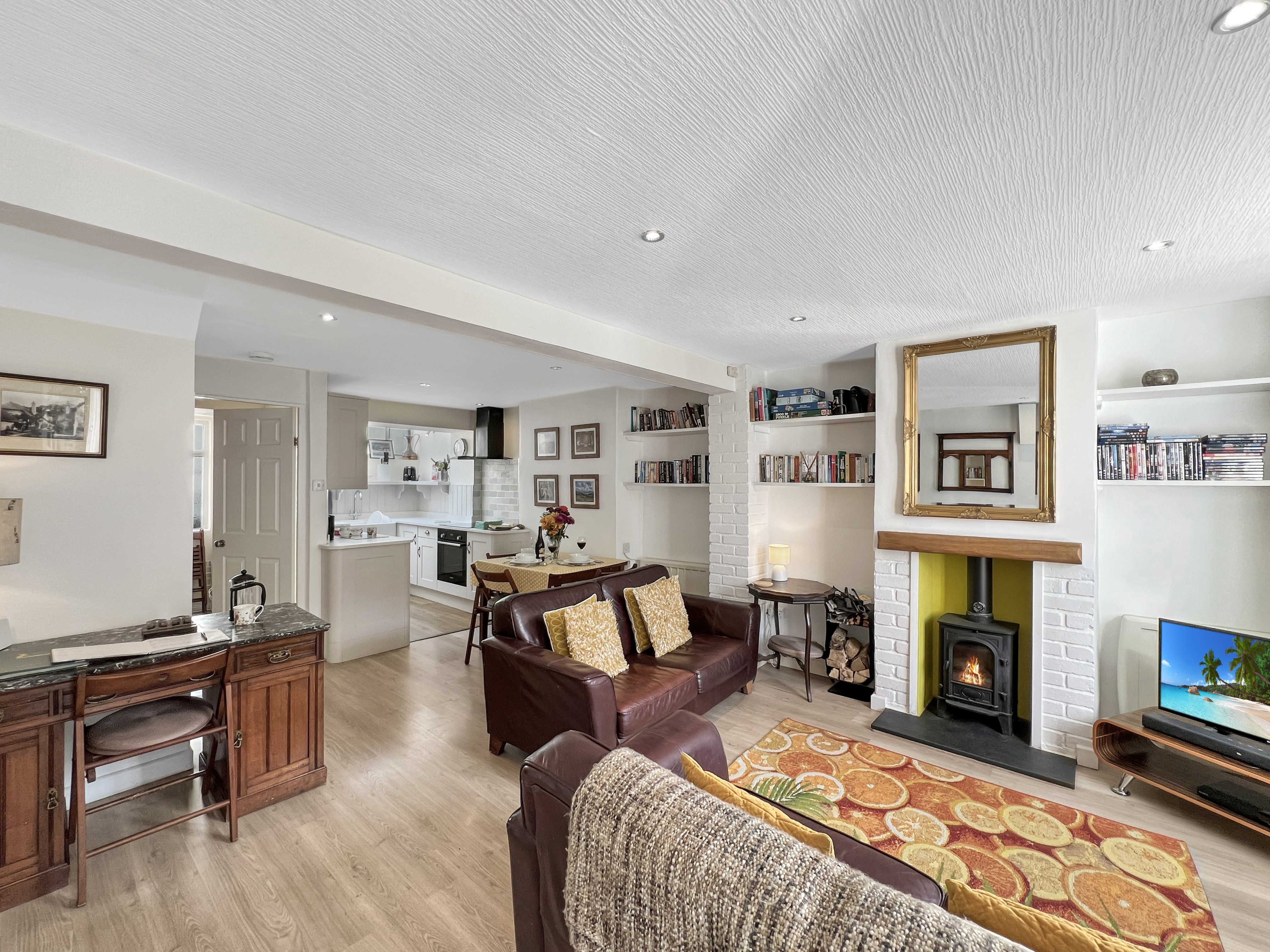 Open plan ground floor kitchen/dining/living area with modern HD TV/Chromecast/sound bar/DVD player and new log burner