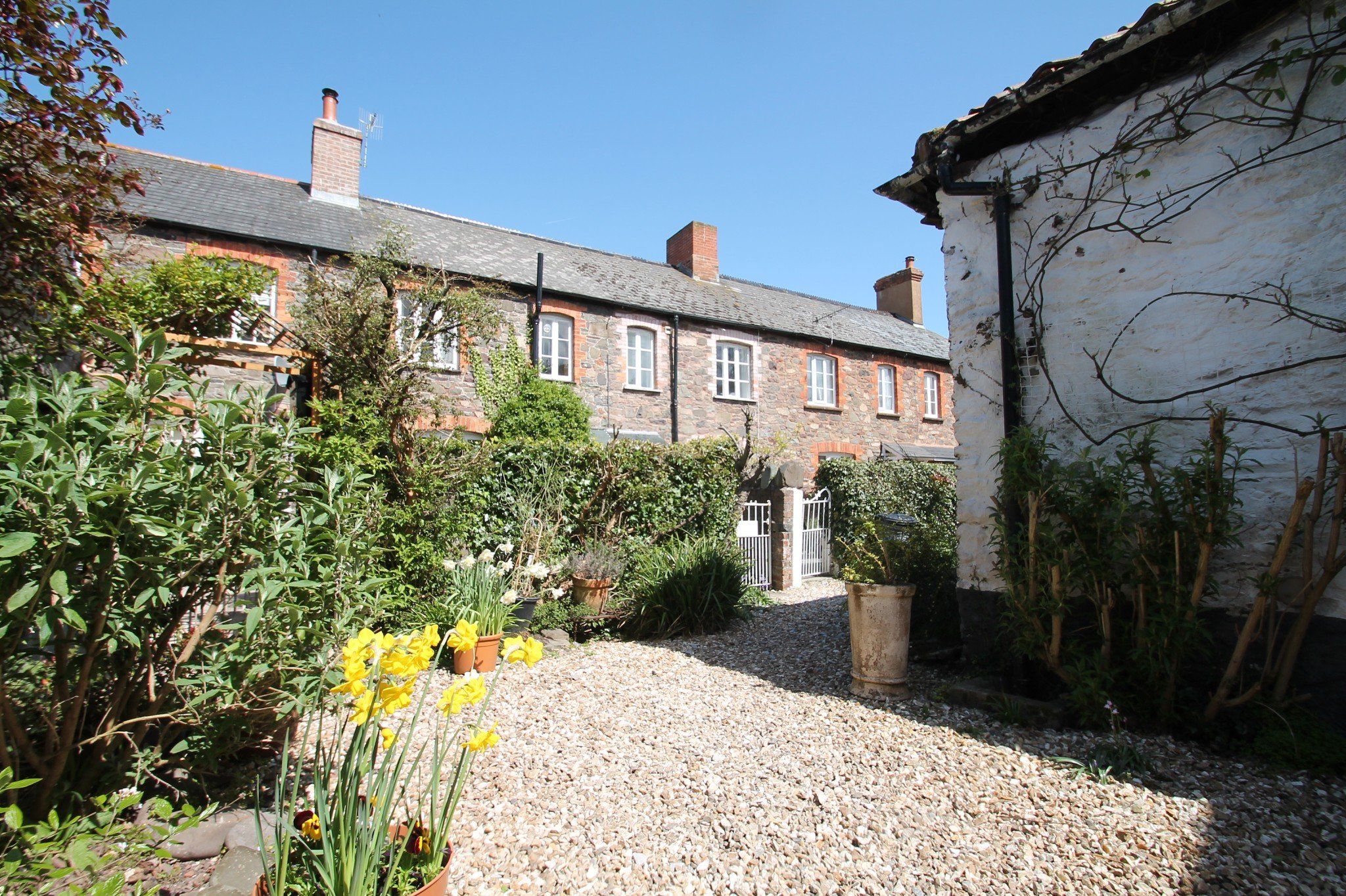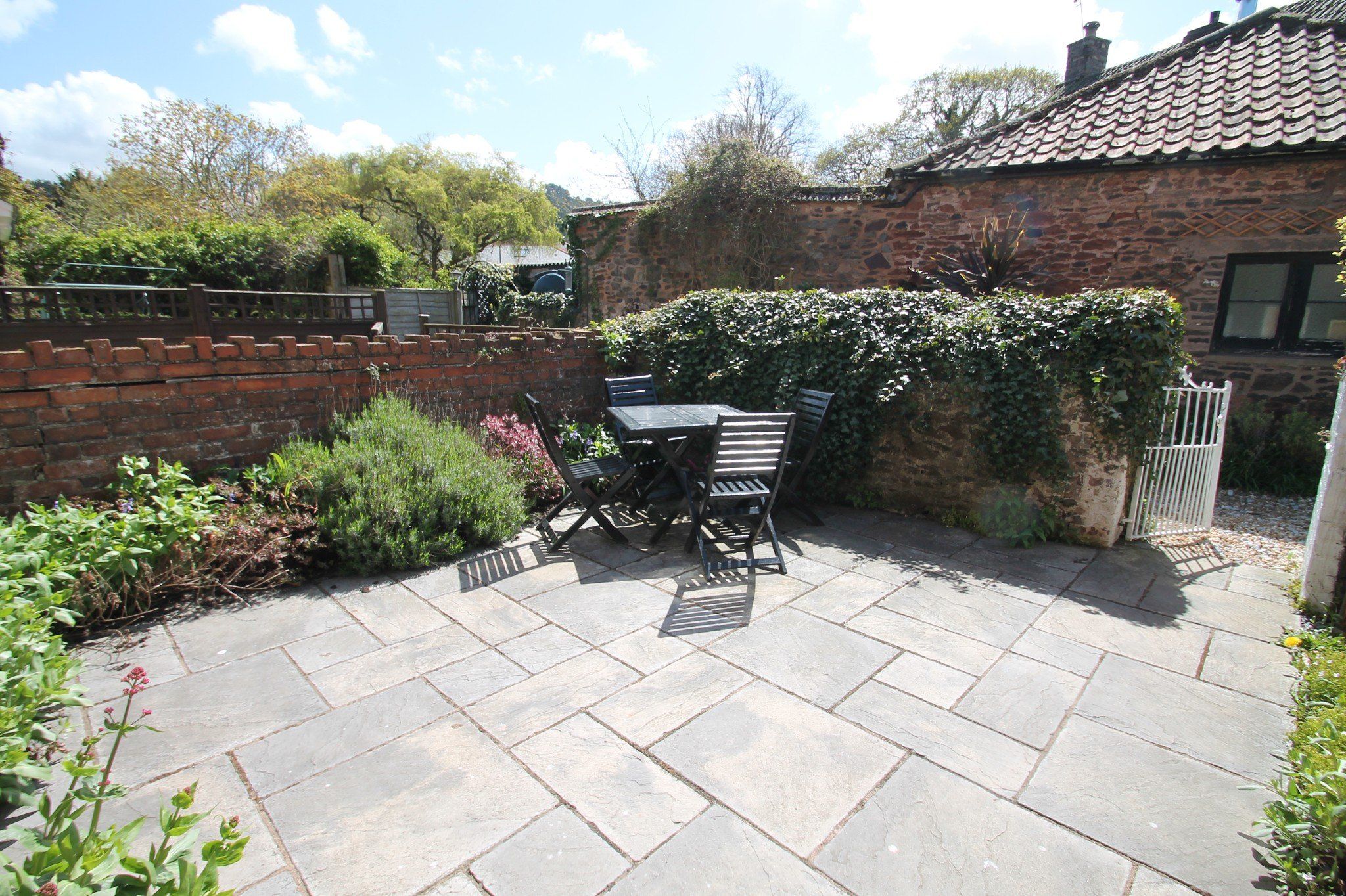 Private enclosed courtyard with outside seating and bed of mature shrubs
