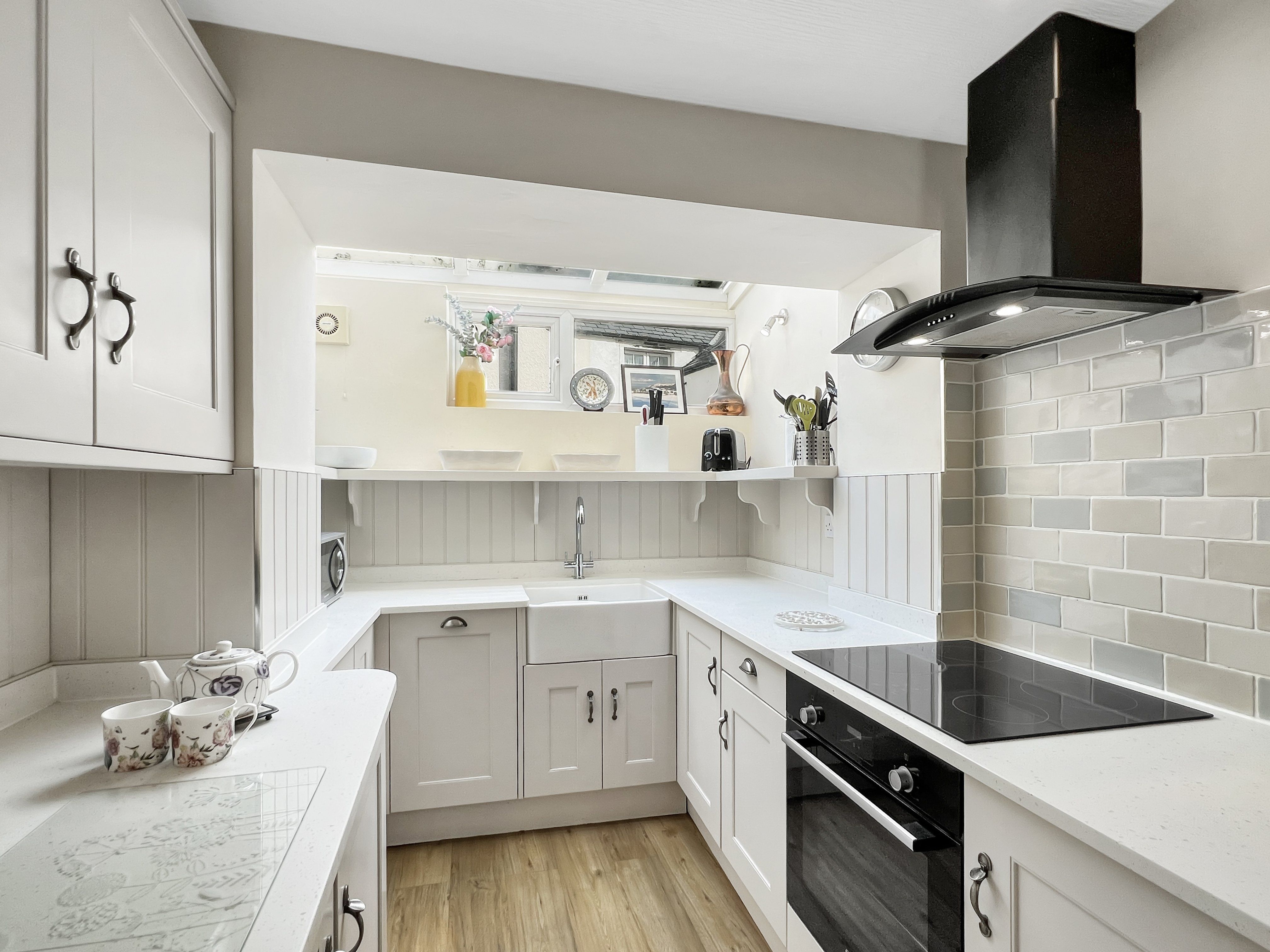 Newly installed (2018) kitchen well equipped with electric hob, oven, microwave, fridge/freezer, dishwasher, toaster, kettle, variety of kitchen utensils, cutlery, crockery, and glasses