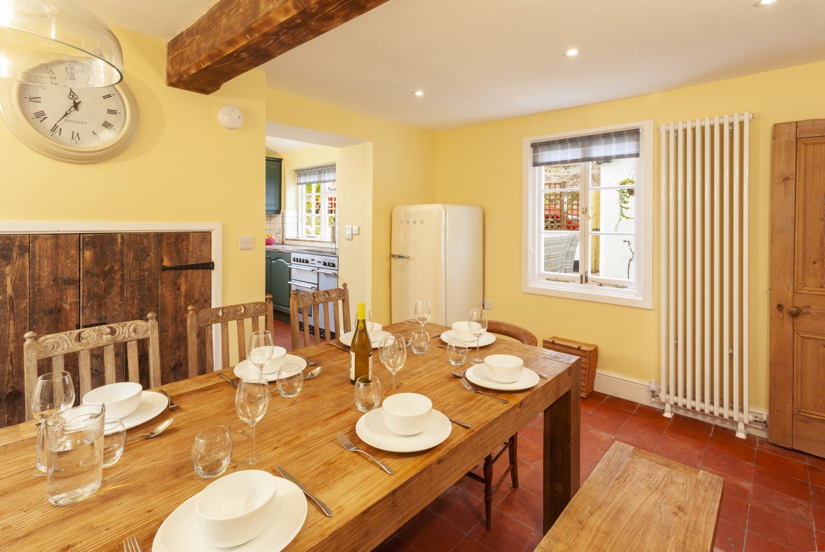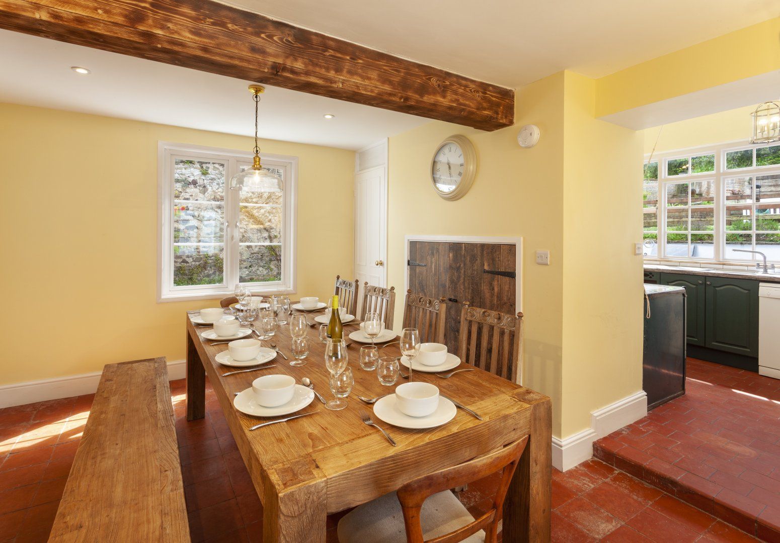 You enter the property from the rear, through a seated courtyard into the hallway. Downstairs comprises a large laundry fully equipped with washer, dryer, plenty of storage and drying space. There is a downstairs WC and separate shower room. The spacious dining room comfortably sits 12 (but has welcomed more!) leading to the kitchen which is bright and airy yet snug with the main feature, the Aga, (only lit in winter months). There is also a large cooker, Microwave, toaster and kettle and plenty of cupboard space.