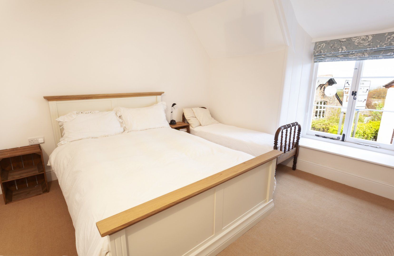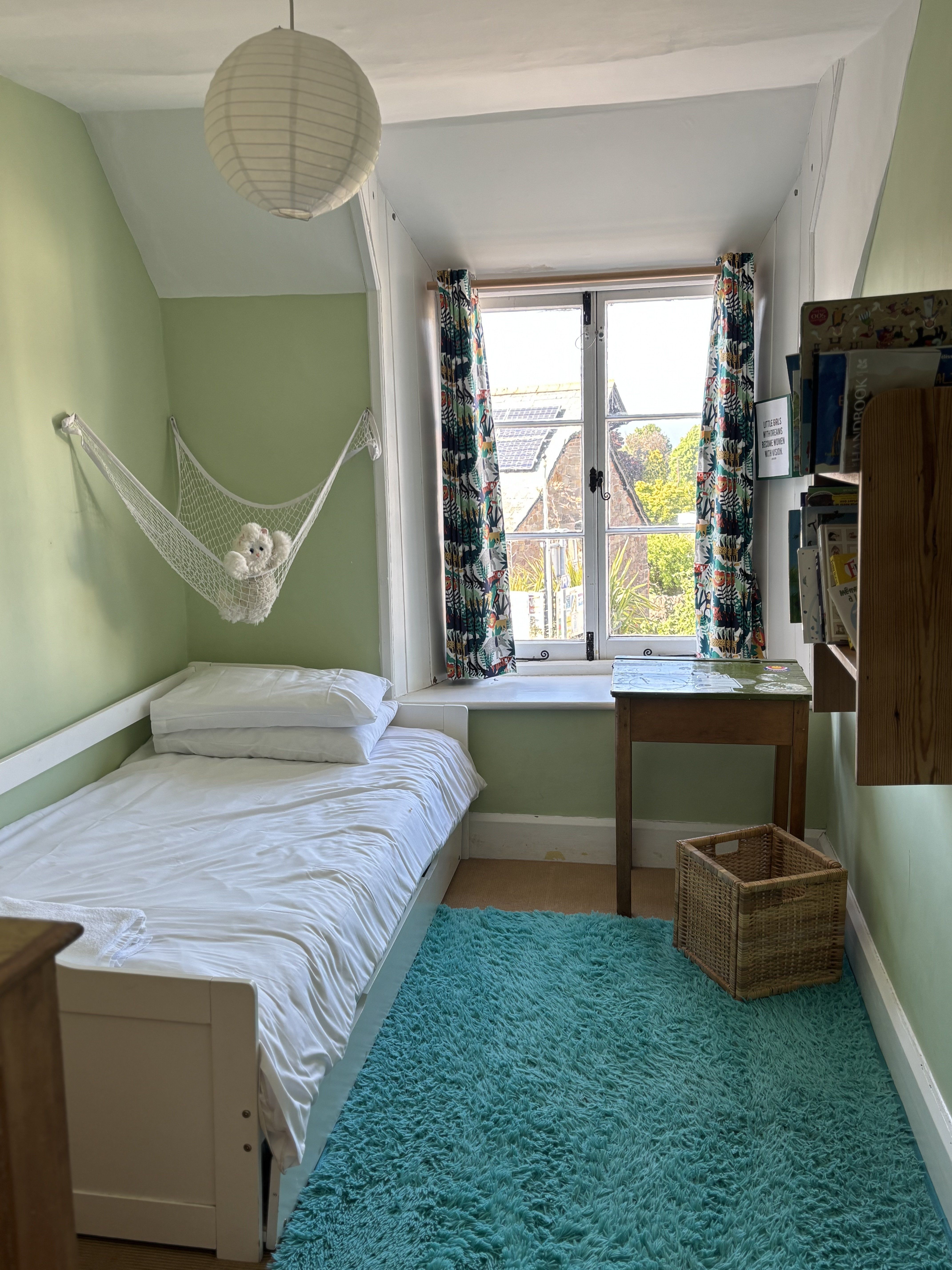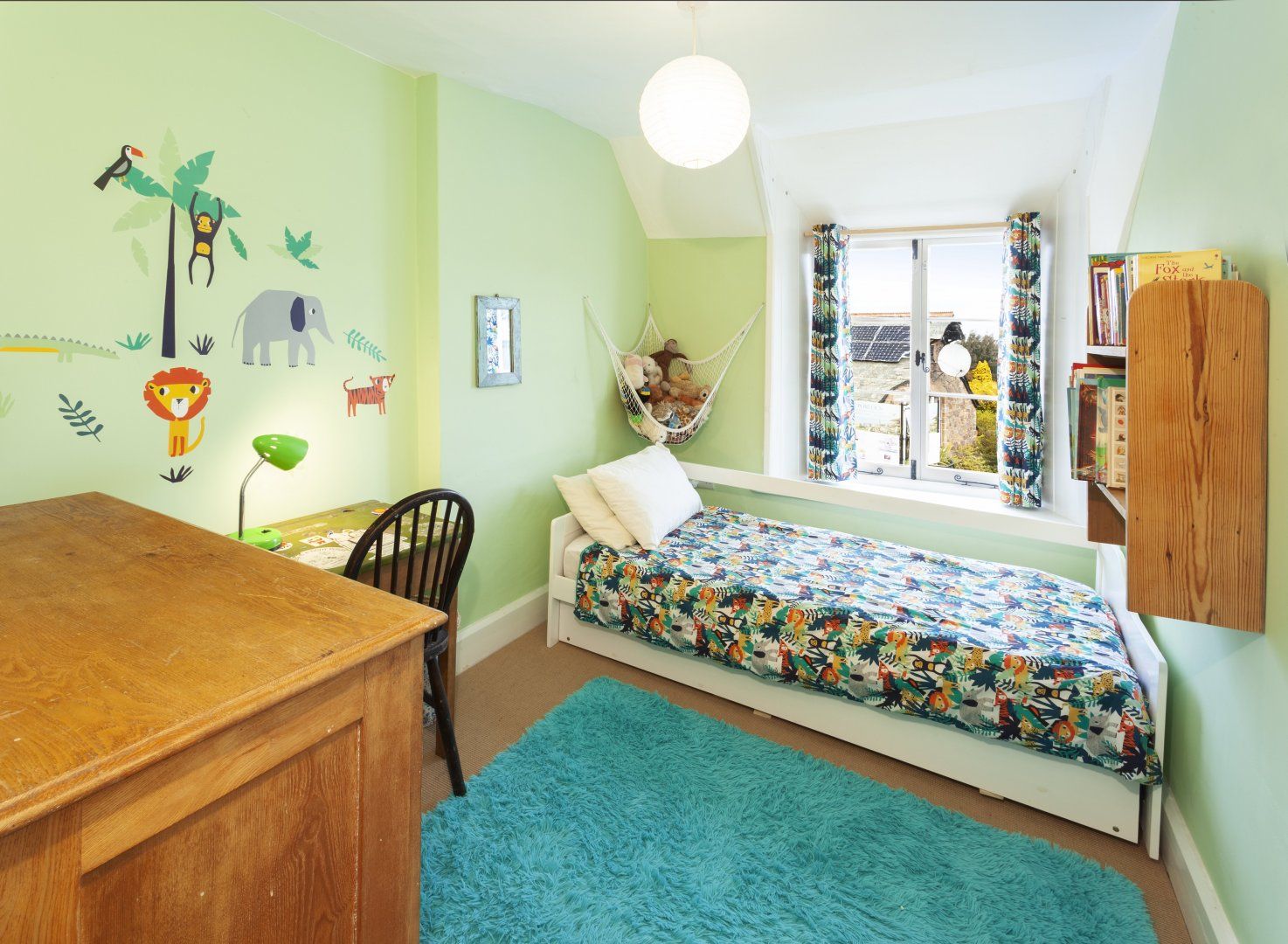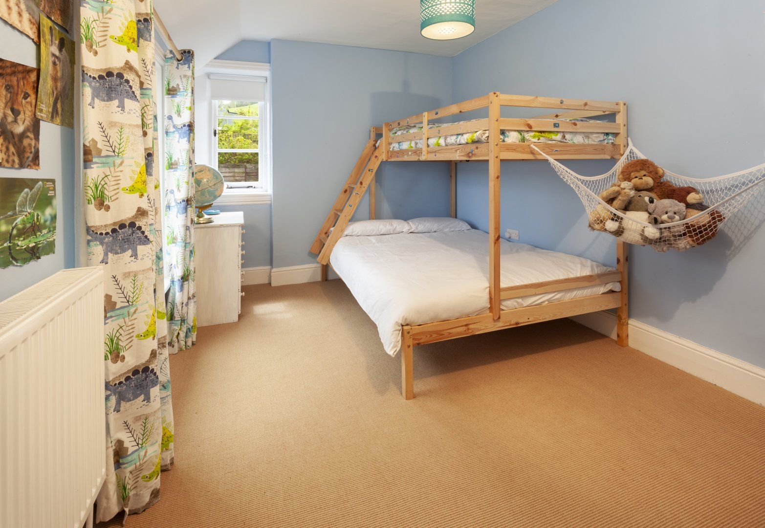 Upstairs there are 5 large bedrooms, 4 with sea views and the 5th overlooking Bossington hill. The master bedroom has a king-size bed with dual aspect views towards the sea and fields to the back. The second large double bedroom has a double bed and a small single bed for a young child. There is also space for a cot (available on request), again the room has sea views. The smaller double bedroom has a double bed, a desk and sea views. The first 'child's bedroom' has a triple bunk bed, with a double bed on the bottom and a single on top. Can comfortably accommodate a small family or siblings or friends. The final bedroom upstairs has a single bed, with a roll-out single comfortable sleeping for two children.