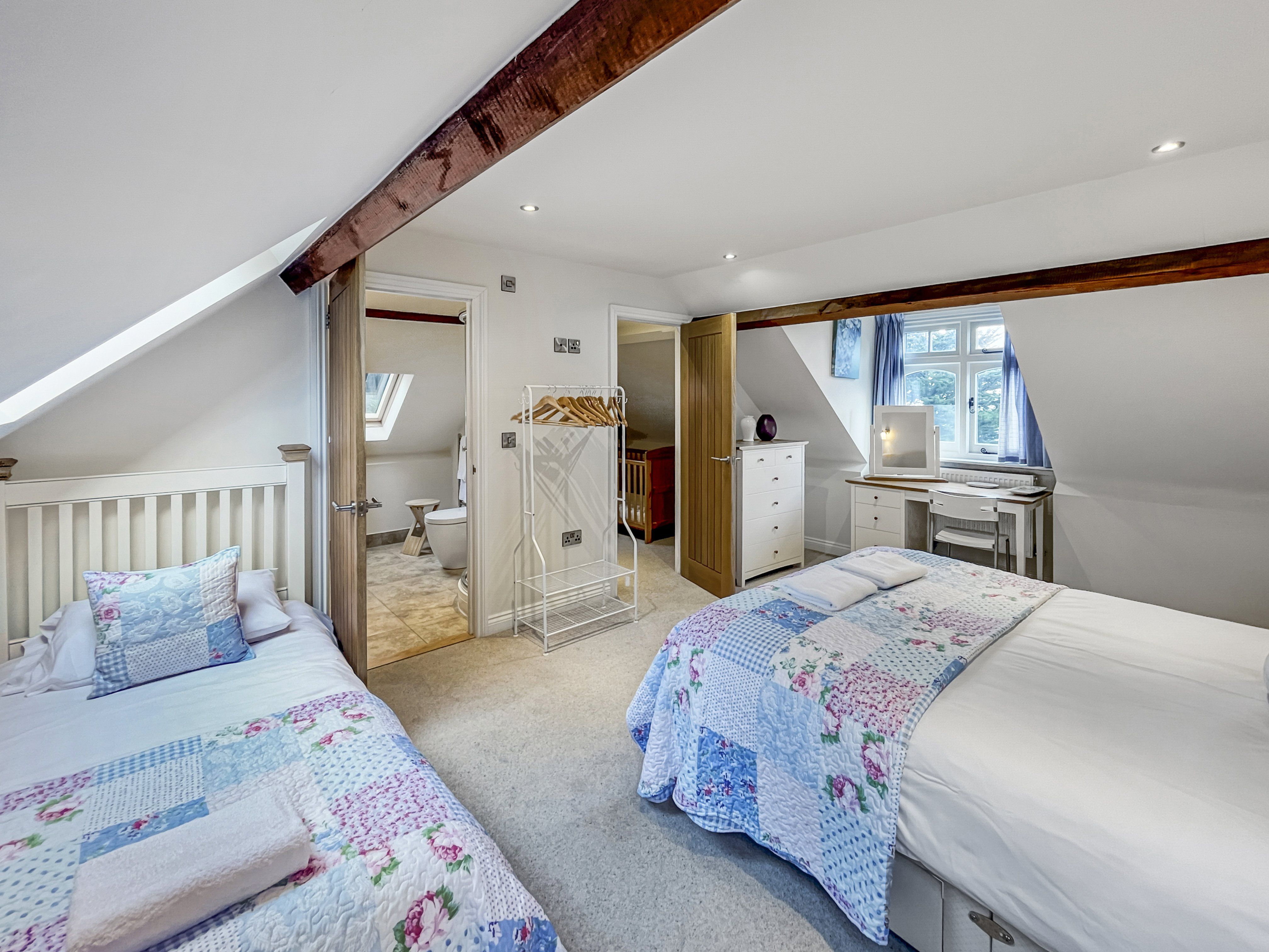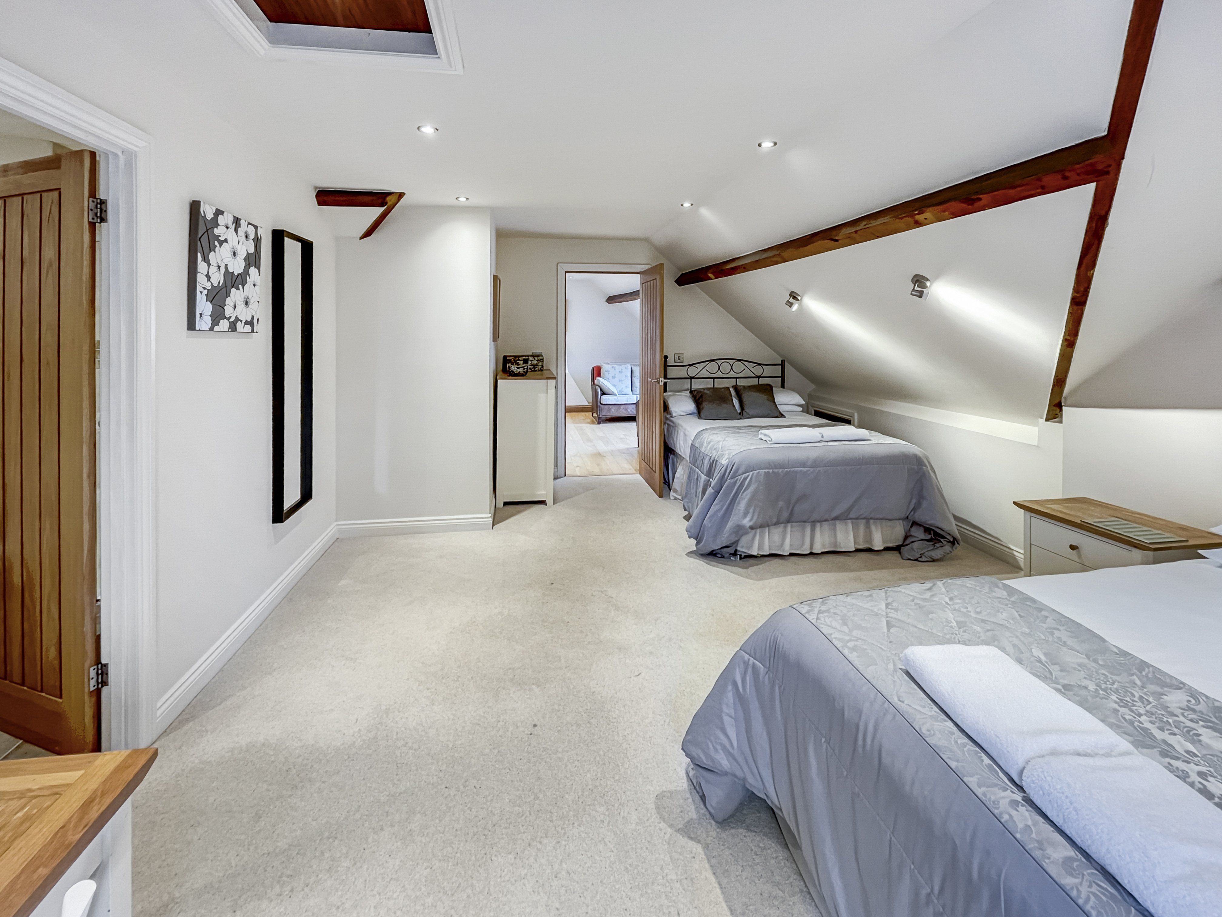 The upstairs bedrooms are configured to each sleep up to 3 guests; one has a king-sized (5') double bed plus a 4' bed, the en-suite has a bath, separate shower, toilet, and hand basin. The other upstairs bedroom has a king-sized (5') double bed plus a single bed, the en-suite comprises a bath, toilet and hand basin. A permanent wooden cot is situated in the 'baby bedroom' off this bedroom.