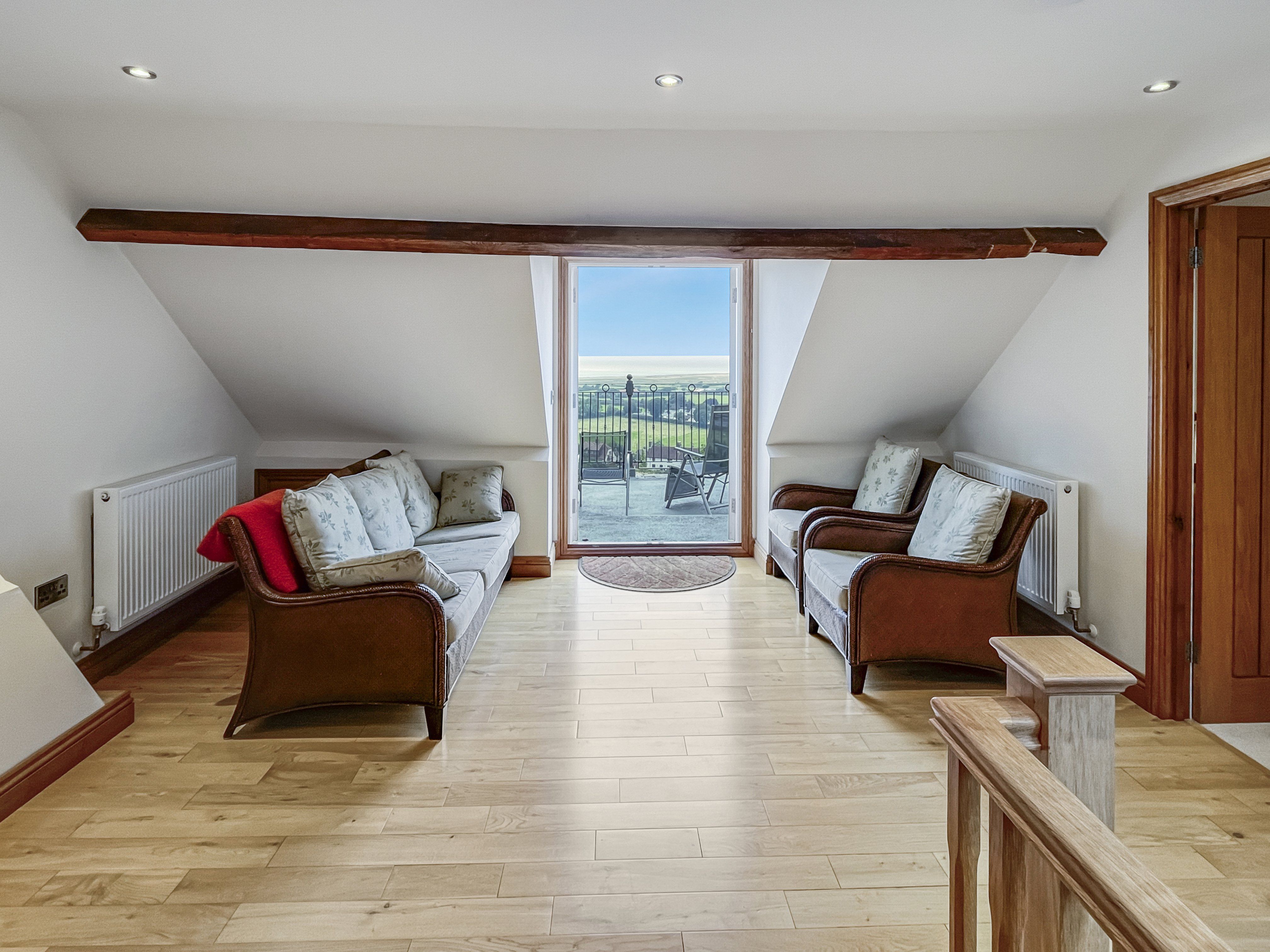 The impressive oak staircase leads up to the first floor and opens into a large hallway with comfortable seating. French doors open onto the balcony which has fantastic views of the coast and overlooking the village. A small table and 4 chairs for sitting on the balcony, just perfect for relaxing with a book or enjoying a glass of something at the end of the day and soaking up that view!