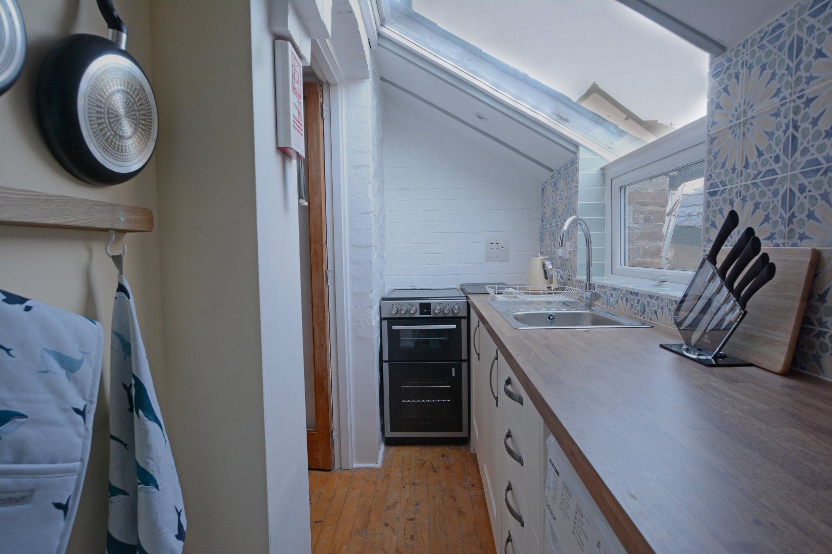 Accommodating up to four guests, Yellow Gate Cottage features a double bedroom and a twin bedroom on the first floor, along with a family bathroom complete with a shower over the bath. The compact galley-style kitchen is well-equipped with an electric cooker, washing machine, and fridge with an ice box. The open plan living and dining area is perfect for relaxing and socializing, with an electric "wood burner" adding a cozy touch.