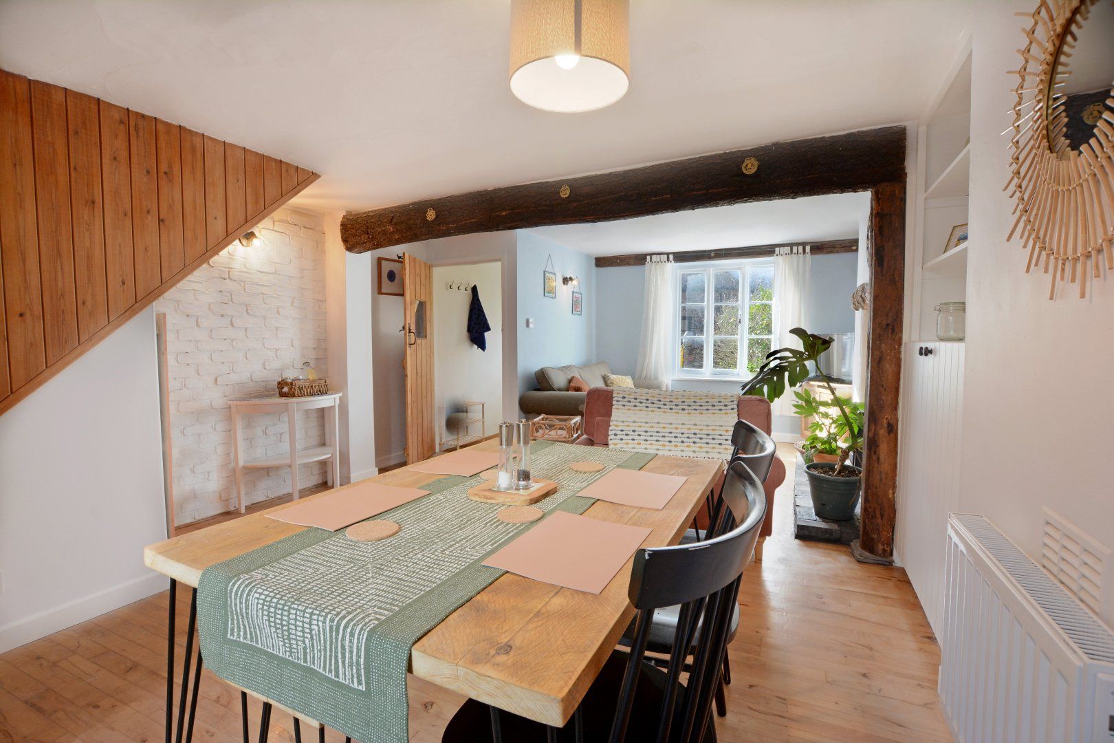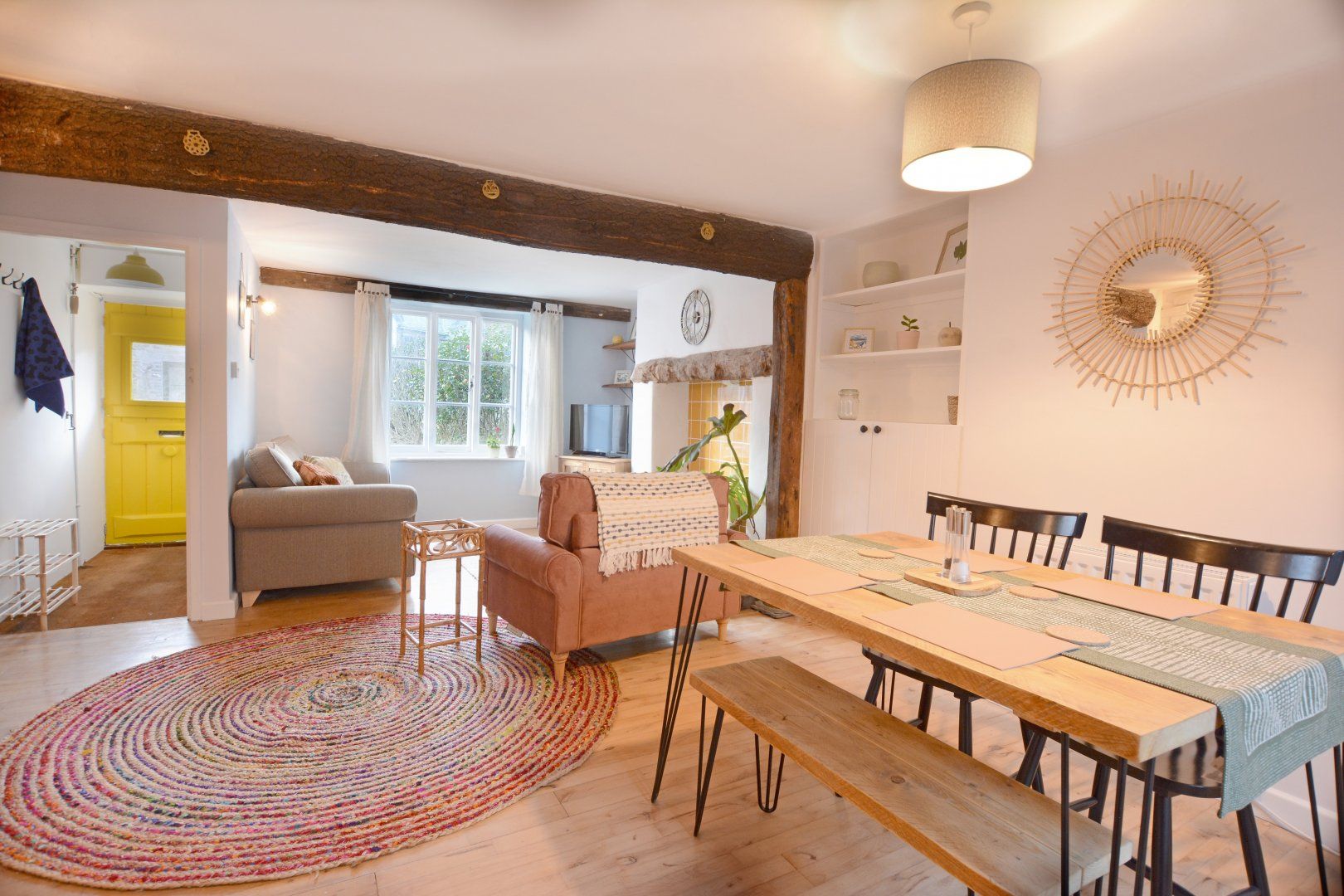 Facilities Enter the cottage via the yellow front door, a short porch area with hooks for coats and a shoe rack, leads into the wonderful living space, with a stunning bark covered beam, comfortable seating, electric wood burner, Smart TV and fabulous dining area. The kitchen is wonderfully quirky, while being compact, it is filled with light and is fully equipped with everything you will need during your stay!