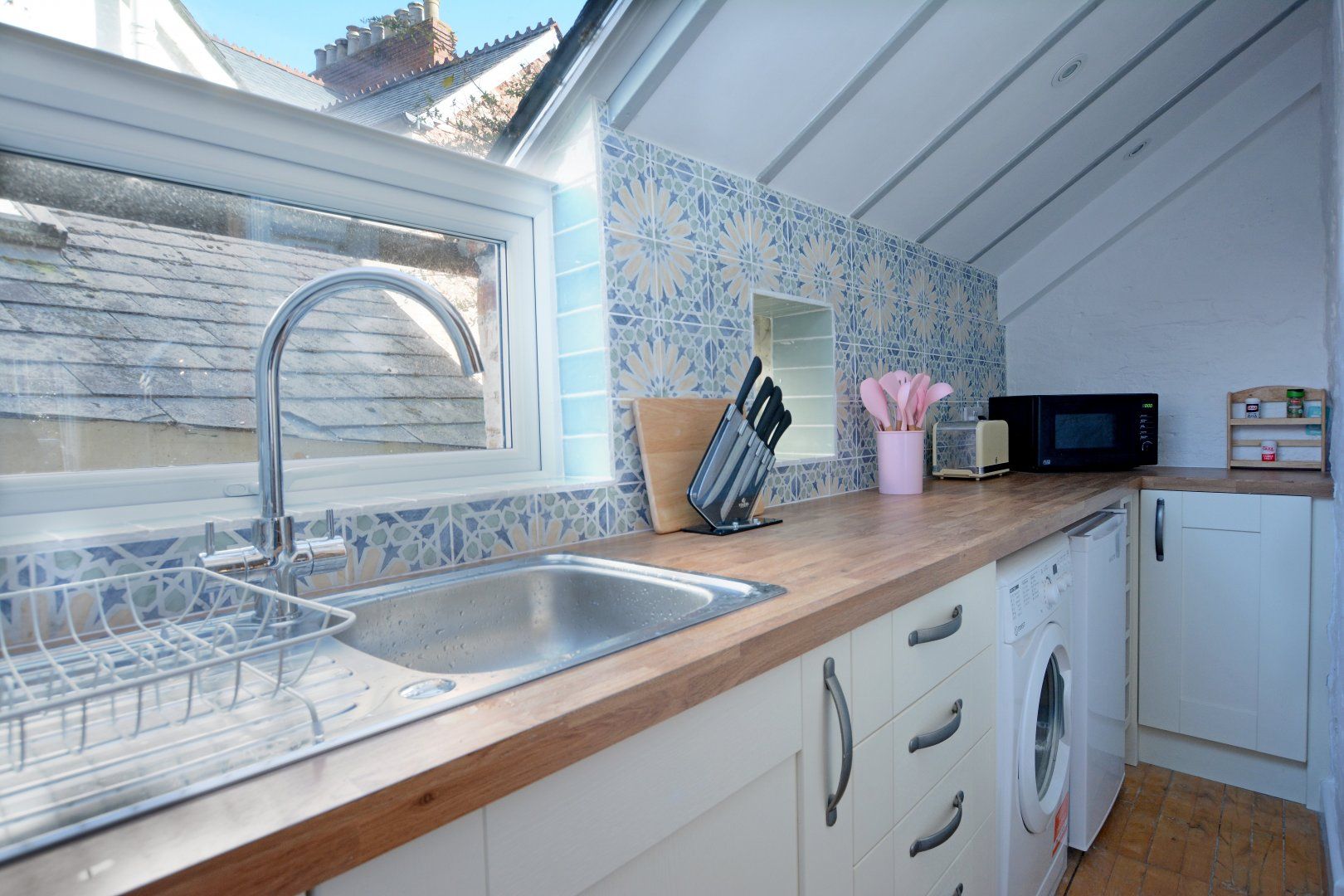 The kitchen comprises an electric double oven with hob, washing machine, under-counter fridge with ice box, microwave, kettle, toaster plus a good selection of cookware, crockery, cutlery and glassware.