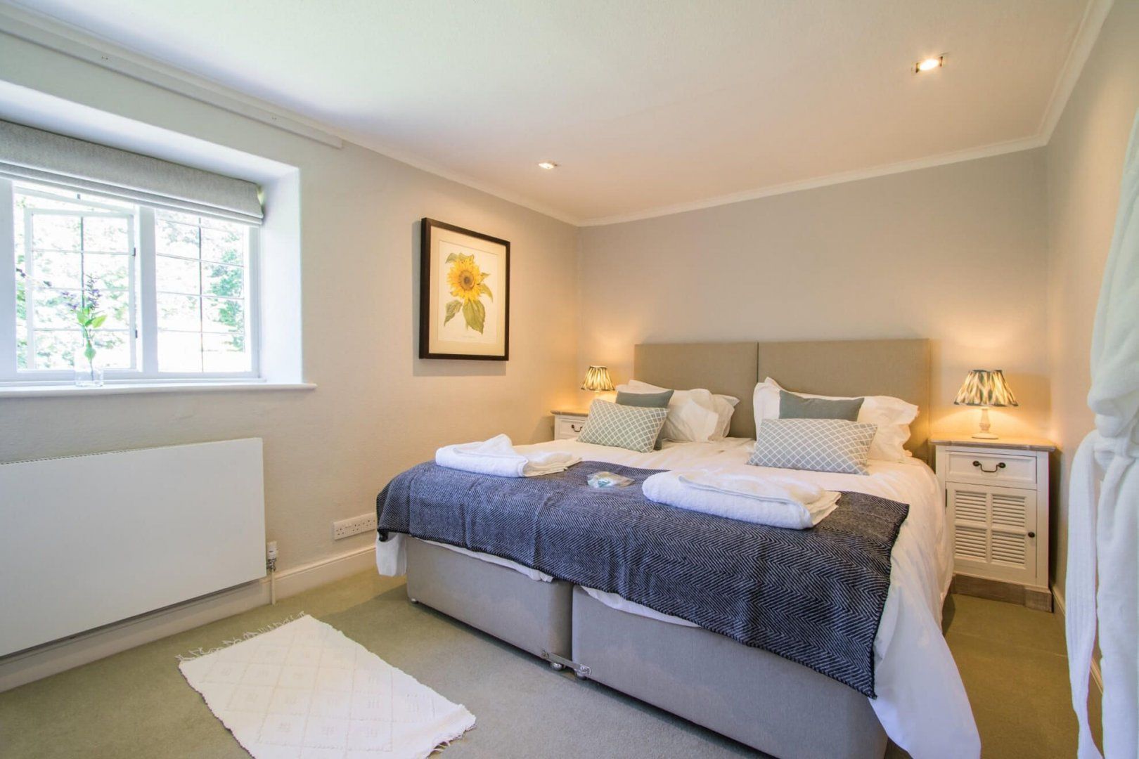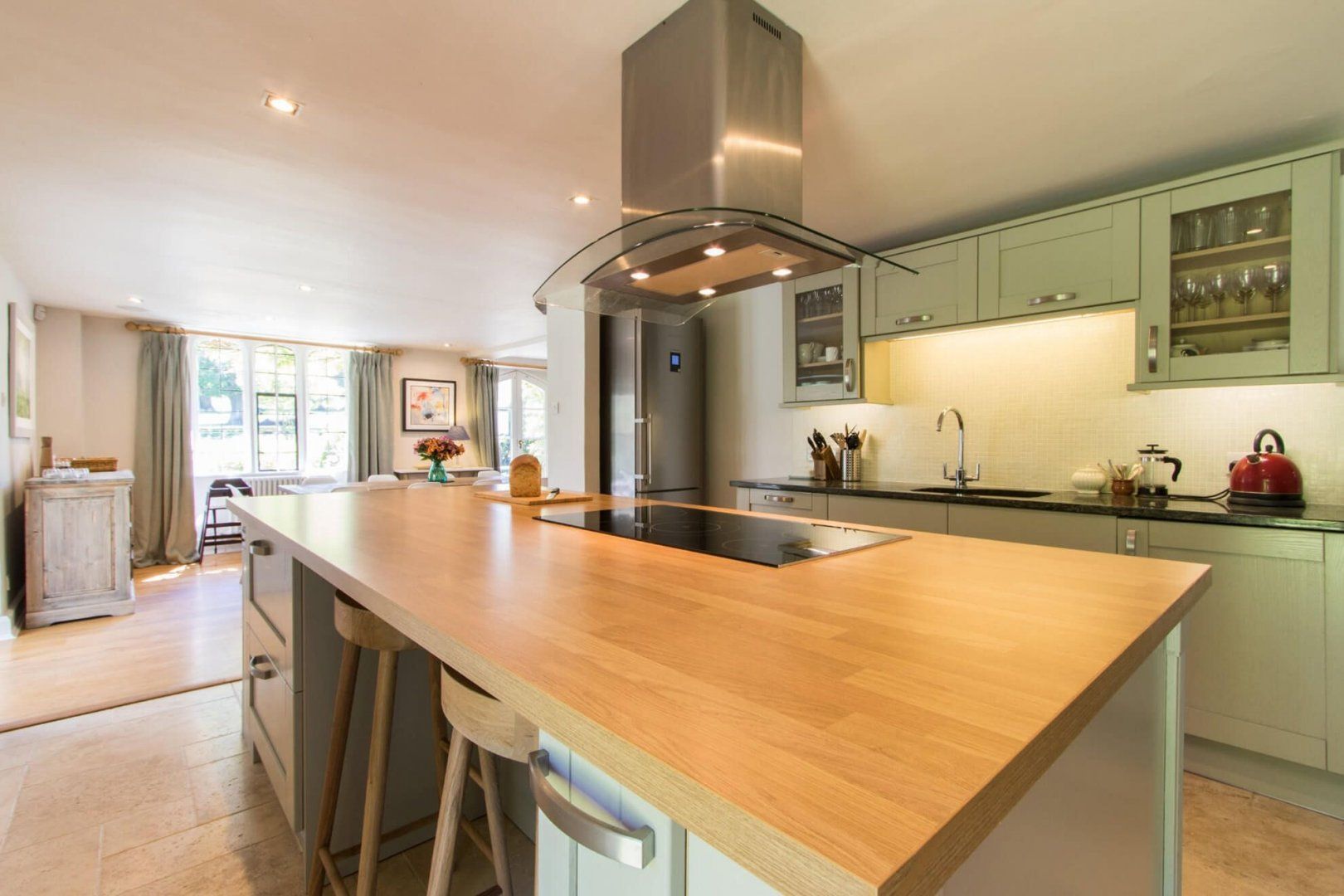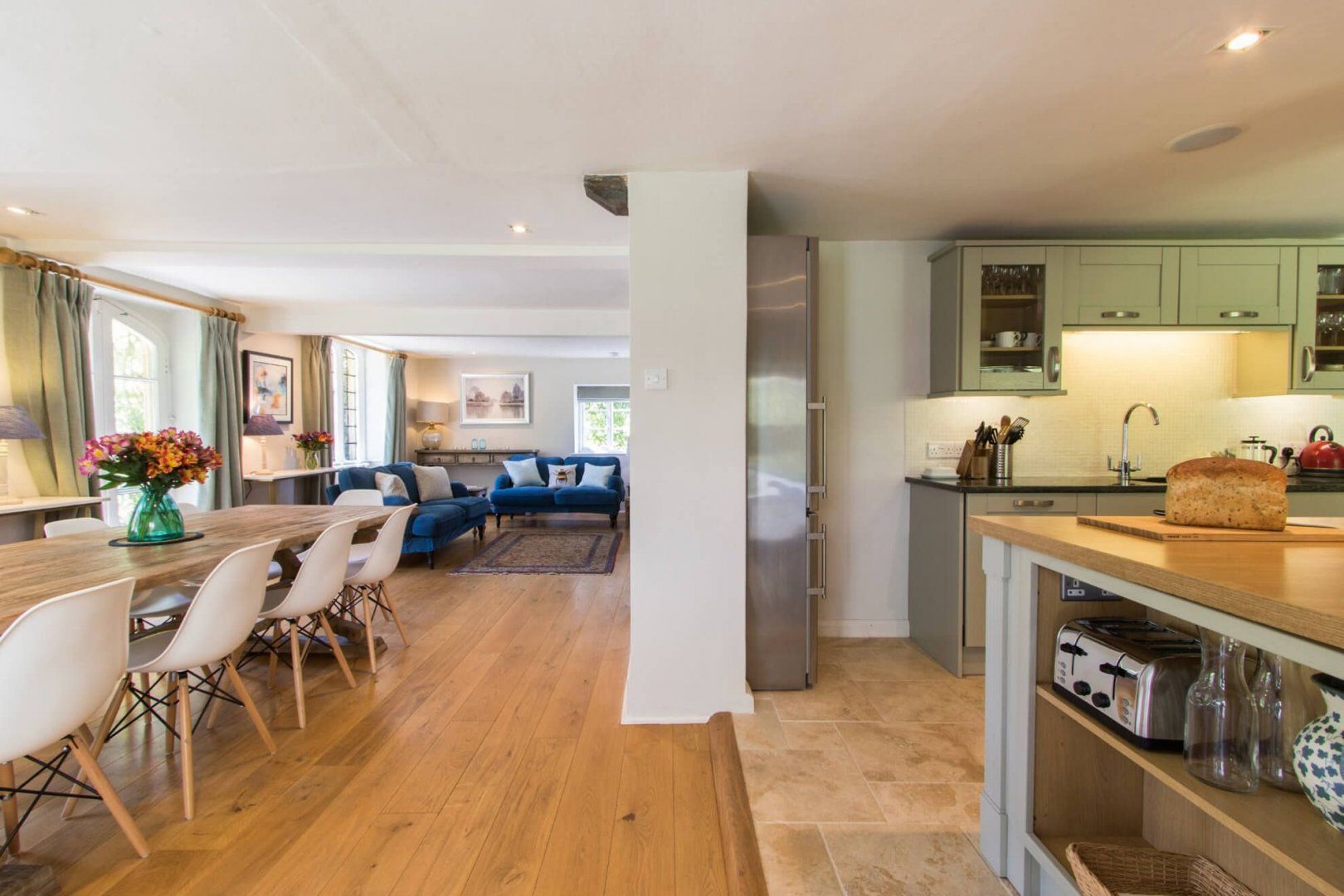 Set in the rolling Somerset countryside outside Ilminster (a three-minute drive), this home epitomises the phrase “sitting pretty”. A honey-hued facade is covered with roses, like a storybook cottage. Though grand bedrooms with sleigh beds and lots of space are more manor house than country cottage. Downstairs, the cosy sitting room is set around a wood-burning in the old hearth and there’s a second family snug with bean bags and a squashy sofa, ideal for film nights. The kitchen is a vision of modernity with its big breakfast island to accommodate the bustle of family mealtimes and dining takes place in the conservatory area overlooking the sprawling grounds. Stepping outside you’ll find a sweeping, manicured lawn and wooden climbing frame for the kids to run free, and patio dining for the whole group courtesy of a charcoal barbecue should the weather allow. Our favourite part? The wood-fired hot tub hidden between the trees and looking out over the fields and woodland.