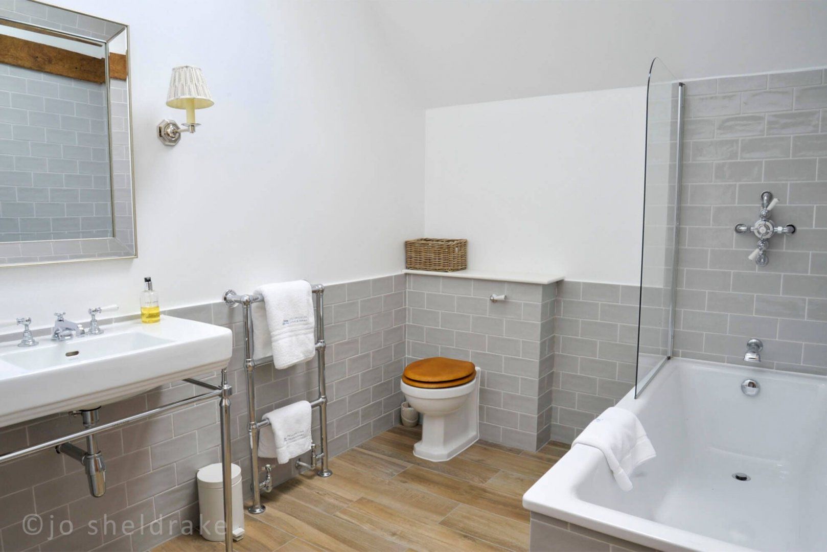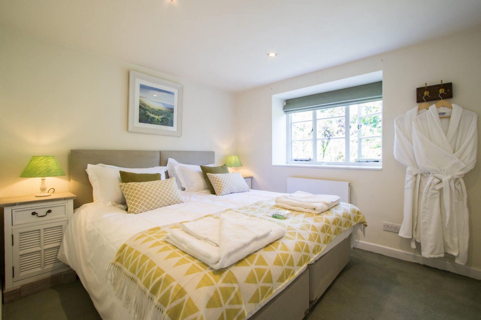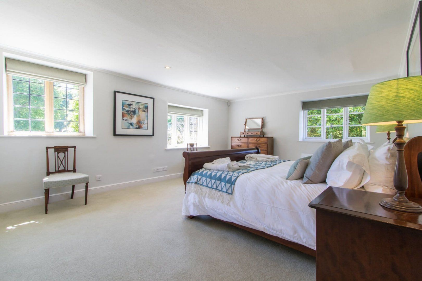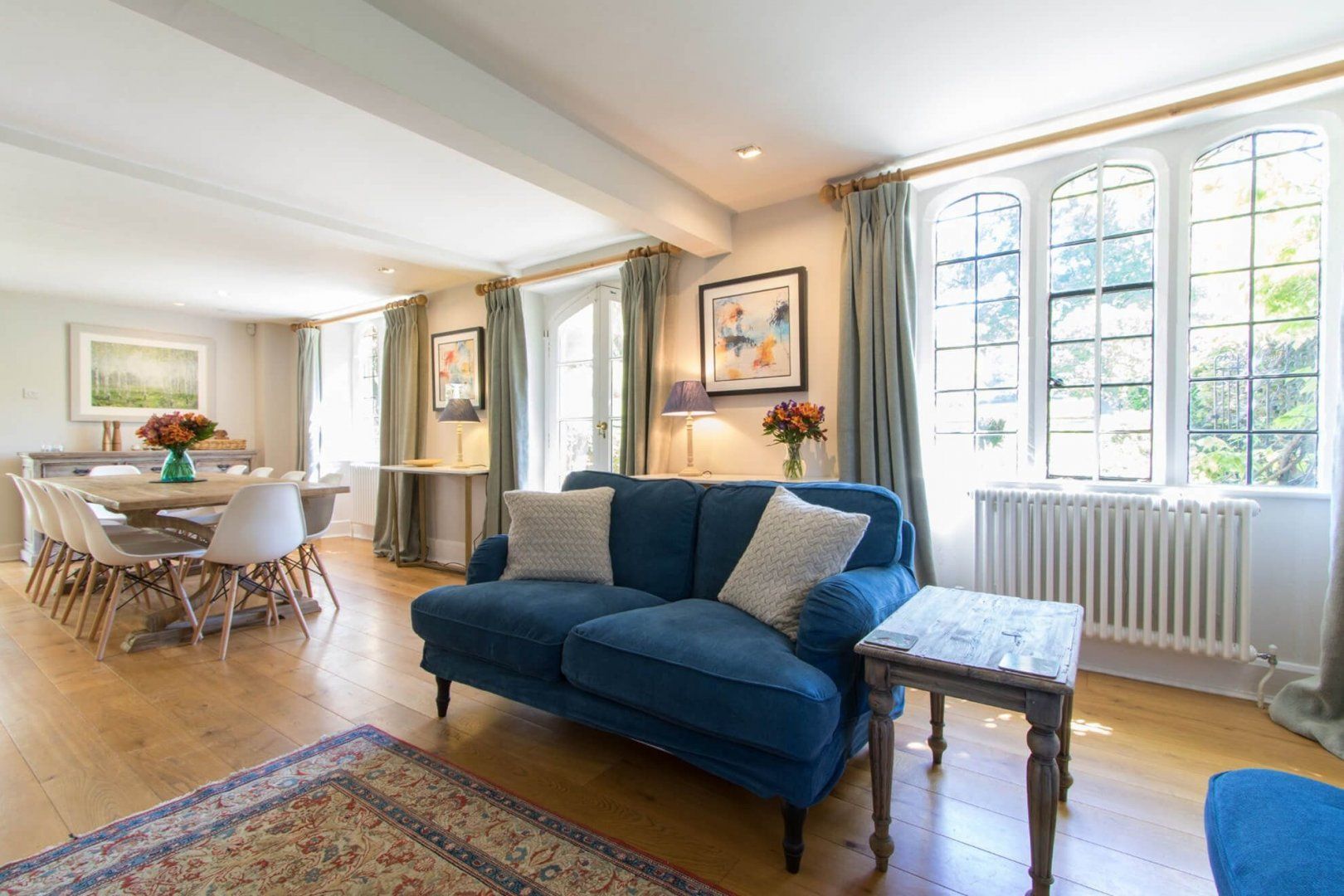 Set in the rolling Somerset countryside outside Ilminster (a three-minute drive), this home epitomises the phrase “sitting pretty”. A honey-hued facade is covered with roses, like a storybook cottage. Though grand bedrooms with sleigh beds and lots of space are more manor house than country cottage. Downstairs, the cosy sitting room is set around a wood-burning in the old hearth and there’s a second family snug with bean bags and a squashy sofa, ideal for film nights. The kitchen is a vision of modernity with its big breakfast island to accommodate the bustle of family mealtimes and dining takes place in the conservatory area overlooking the sprawling grounds. Stepping outside you’ll find a sweeping, manicured lawn and wooden climbing frame for the kids to run free, and patio dining for the whole group courtesy of a charcoal barbecue should the weather allow. Our favourite part? The wood-fired hot tub hidden between the trees and looking out over the fields and woodland.