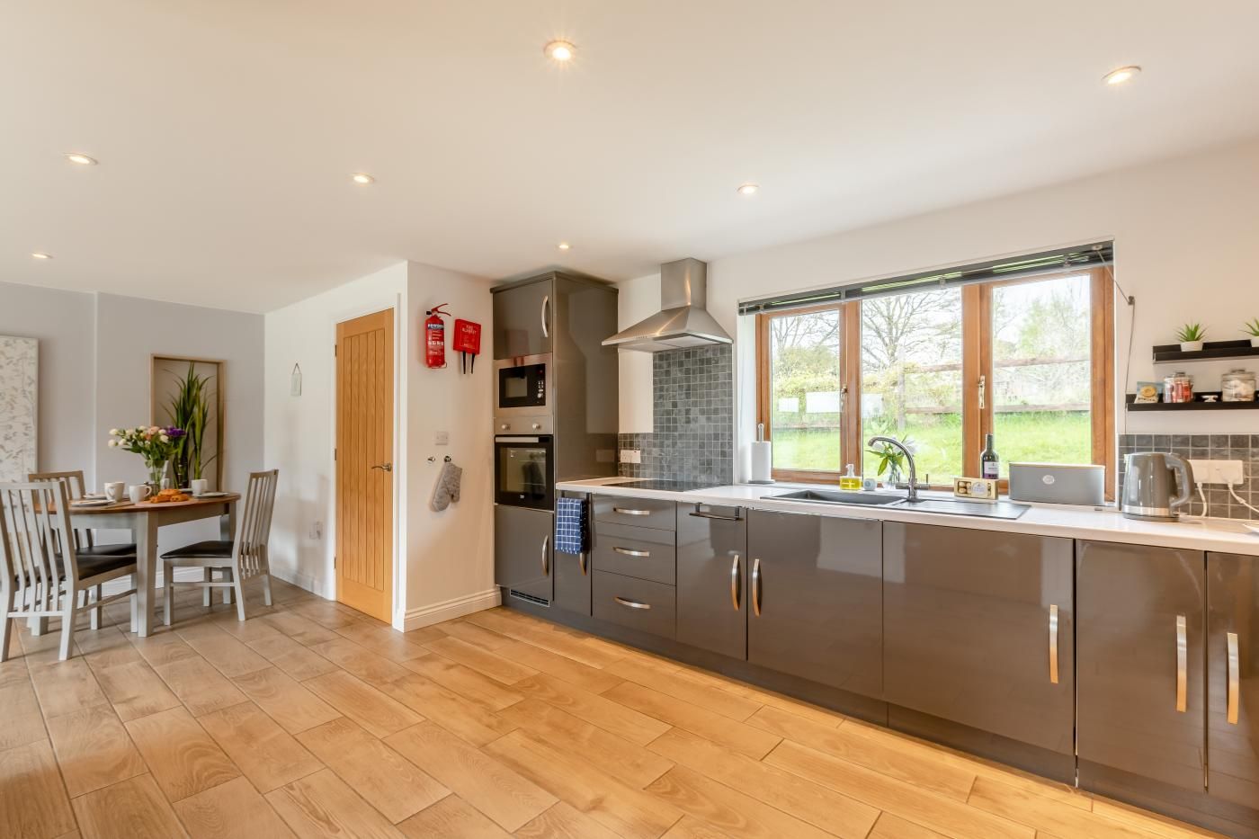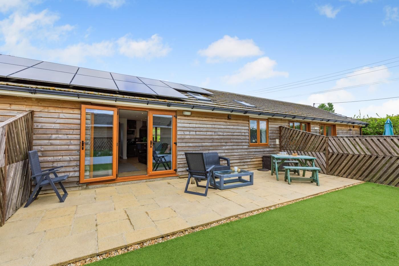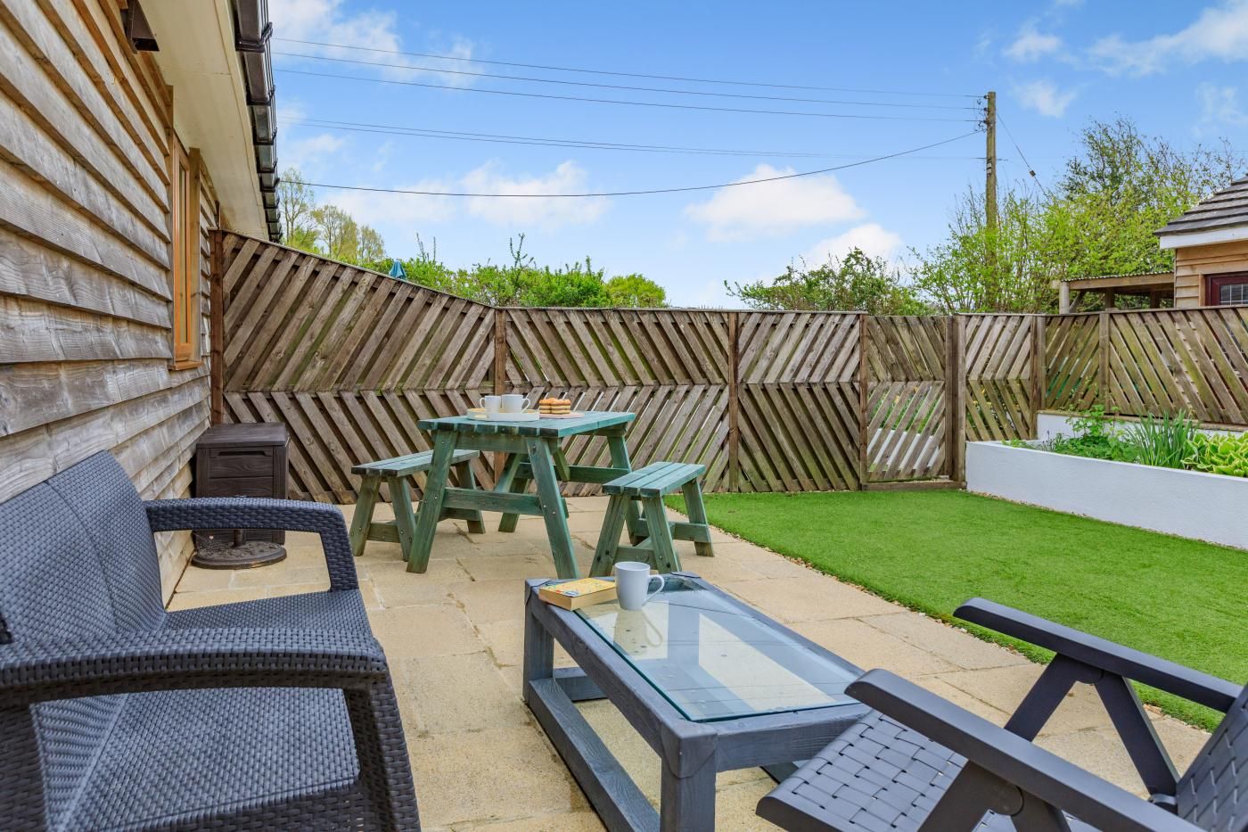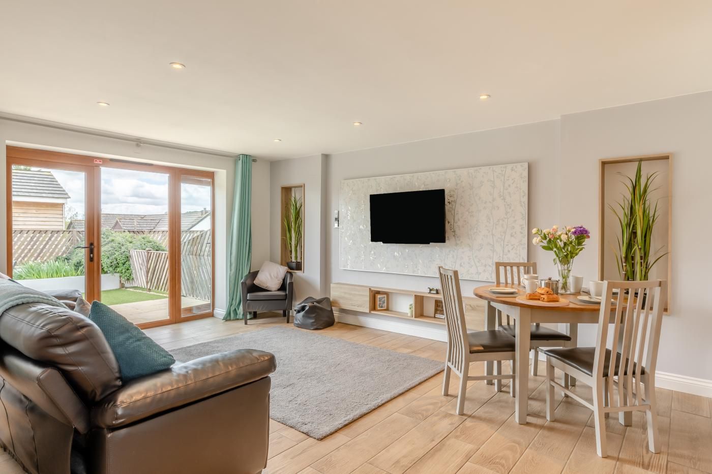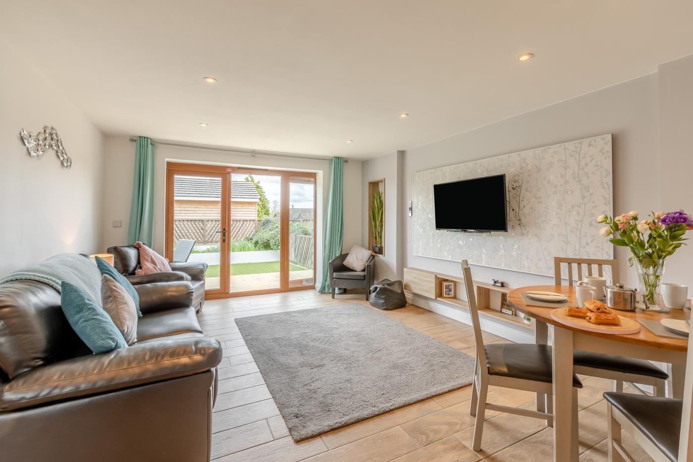 Inside, enjoy sociable open-plan living and contemporary styling, while outside, a suntrap private garden awaits for al fresco dining moments. Step inside this single-storey cottage and into the light and airy lounge/kitchen/diner, where a cosy sofa, snug armchair, and a smart TV await, with patio doors leading to the garden.