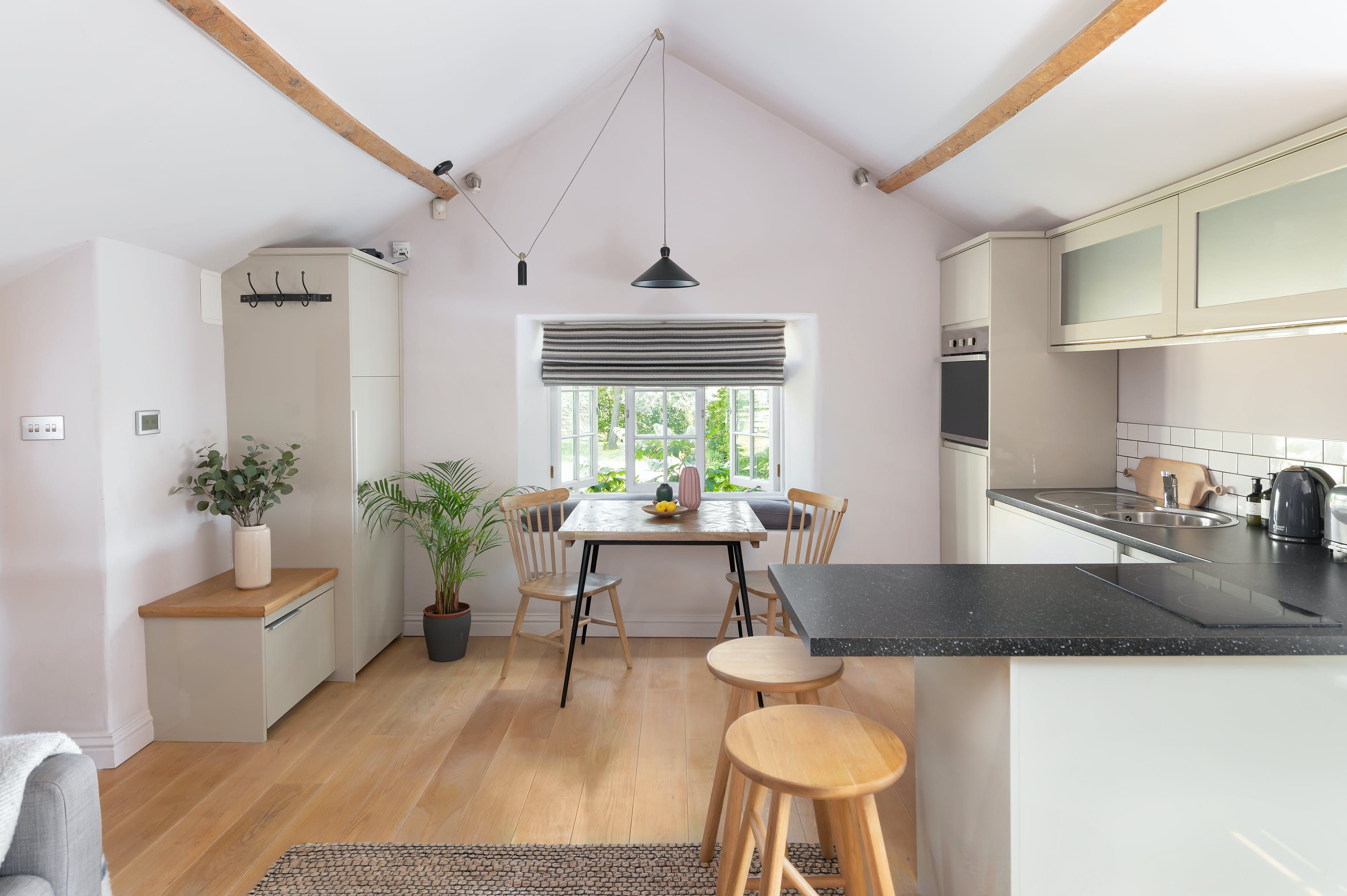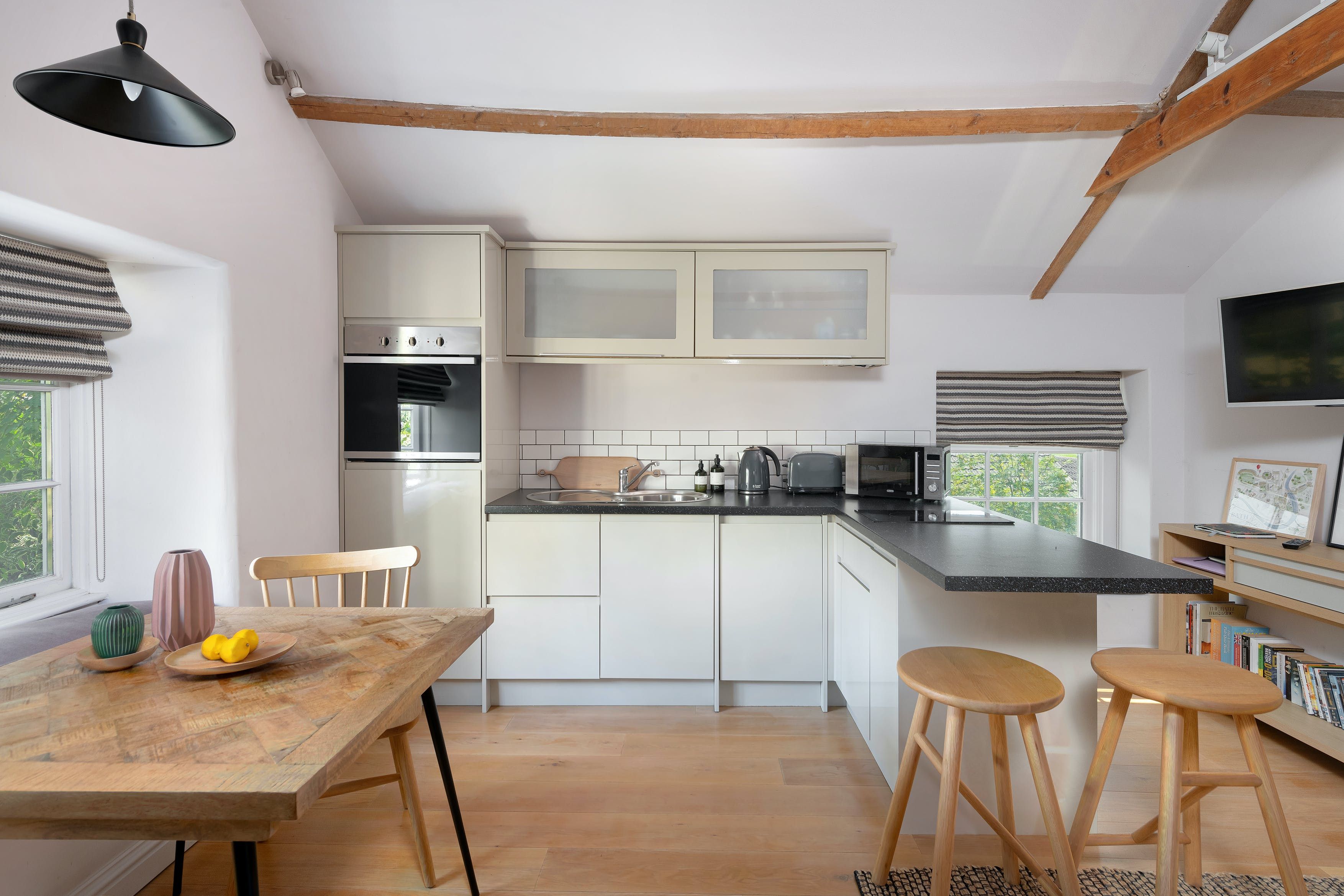 A fifteen-minute drive from the beautiful city of Bath, this studio apartment sits within the grounds of an old Georgian house. In the quintessential country village of Wellow, you’ve got a pub and village shop on your doorstep. An old railway line turned walking path leads right into Bath for those that like a long ramble. Make the most of sunny days with barbecues on the private patio, and enjoy starry skies at night away from the bright lights of the city. Inside, it’s an old hayloft turned apartment with a full kitchen, sitting area, dining table and bed sharing the same area. But it feels spacious thanks to a lofty ceiling and the personal touches like a little library of books and welcome pack are appreciated.