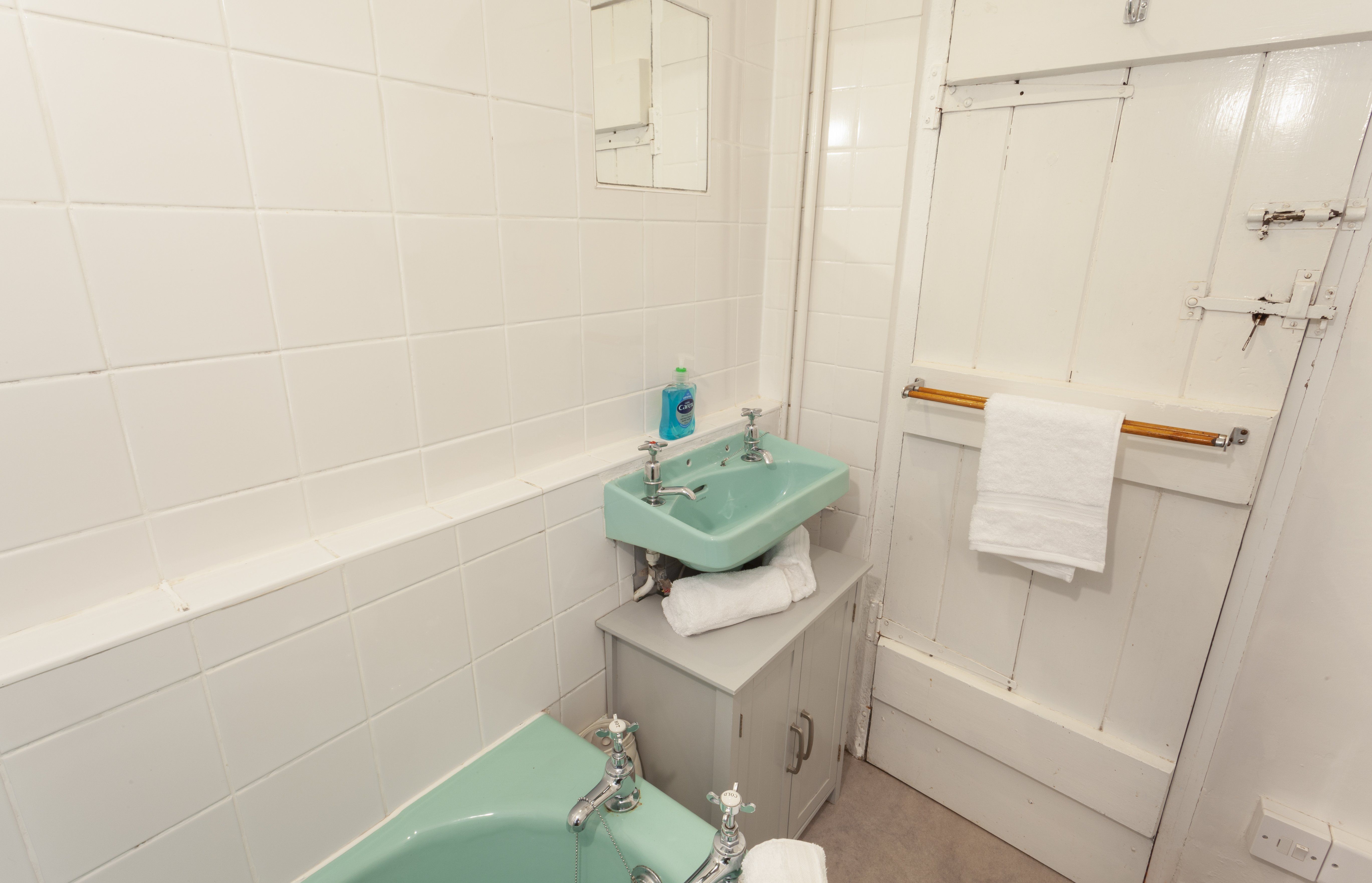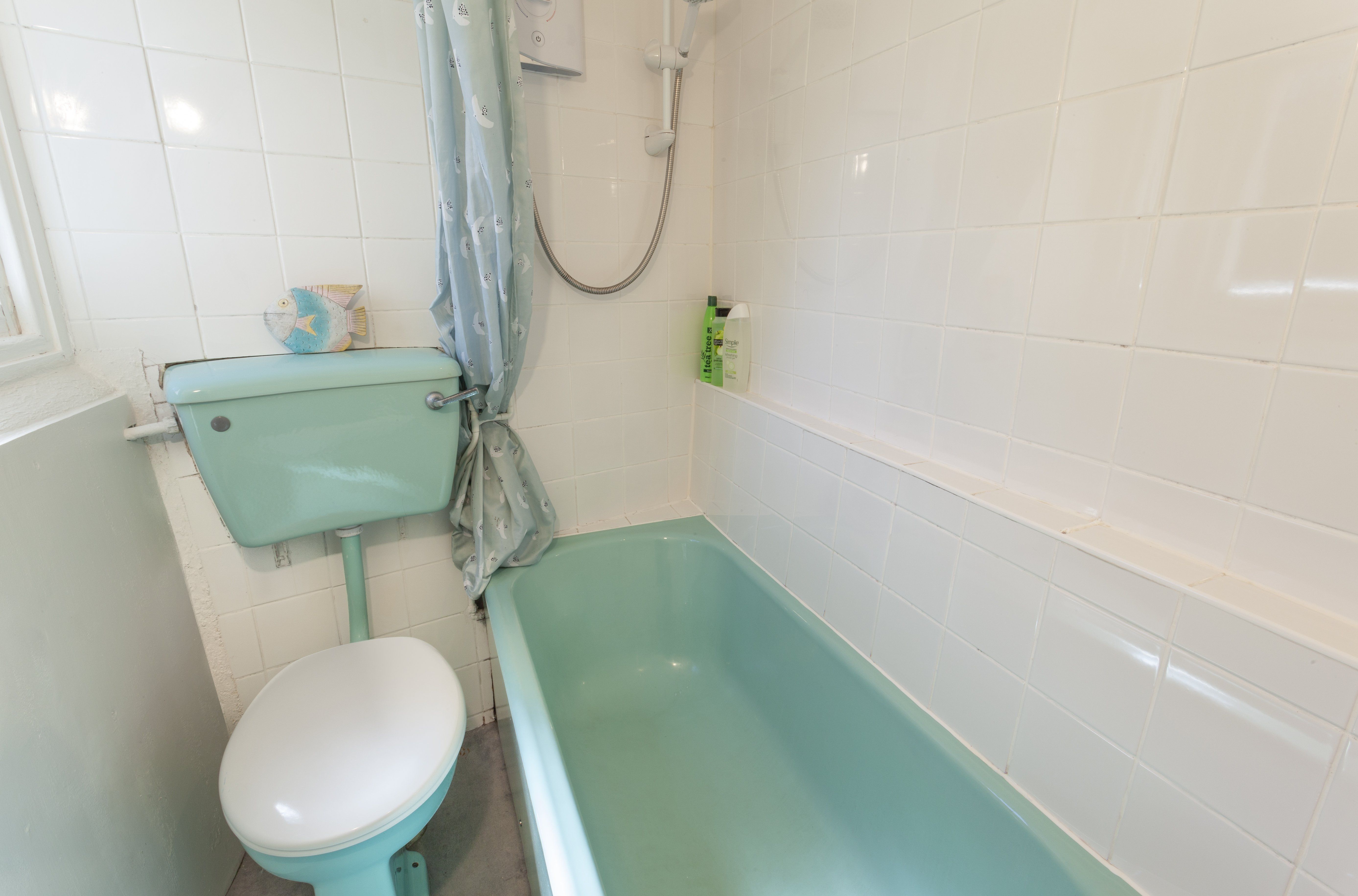 Ground floor bathroom comprising bath with electric shower over, hand basin, toilet, electrical wall heater, and heated towel rail