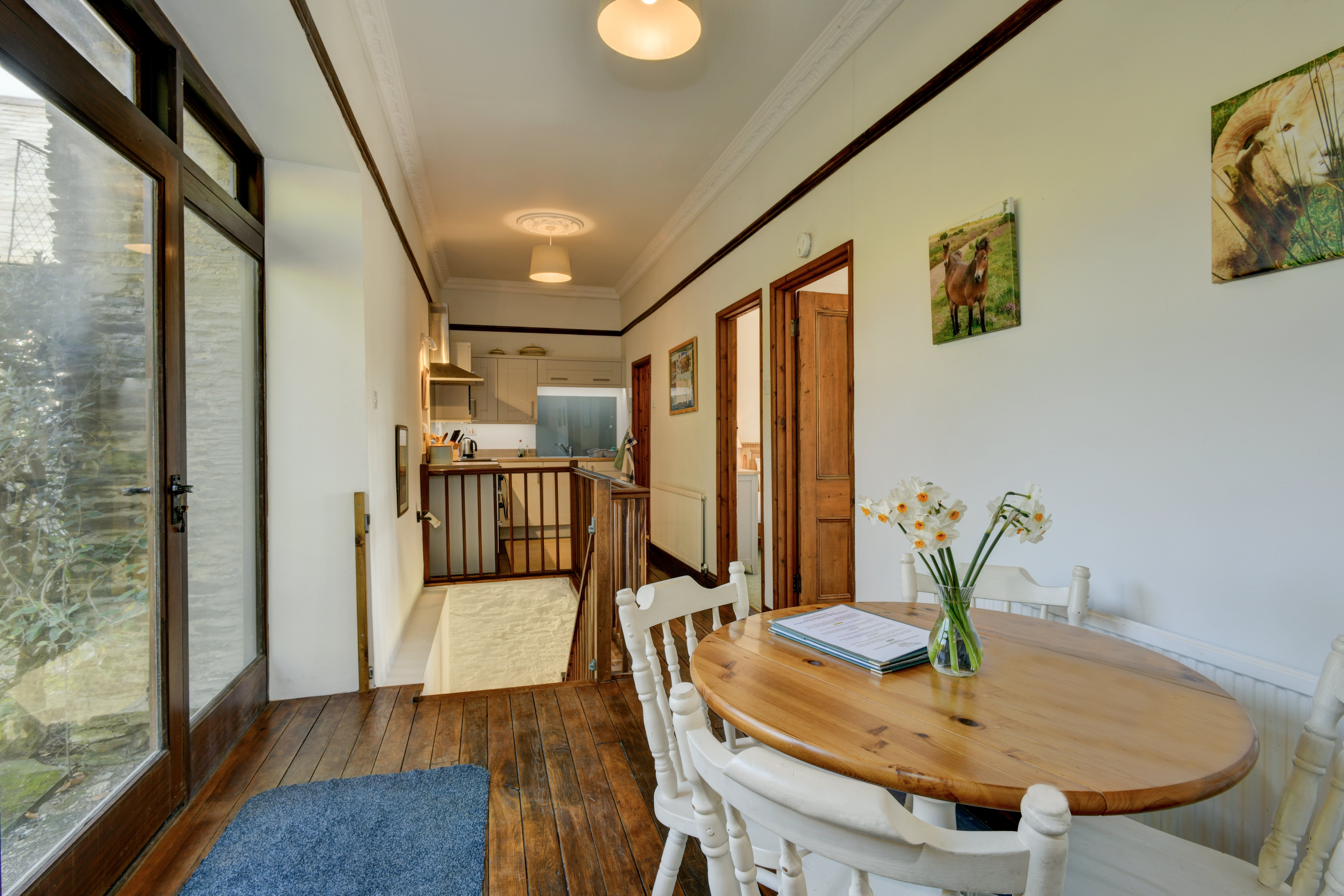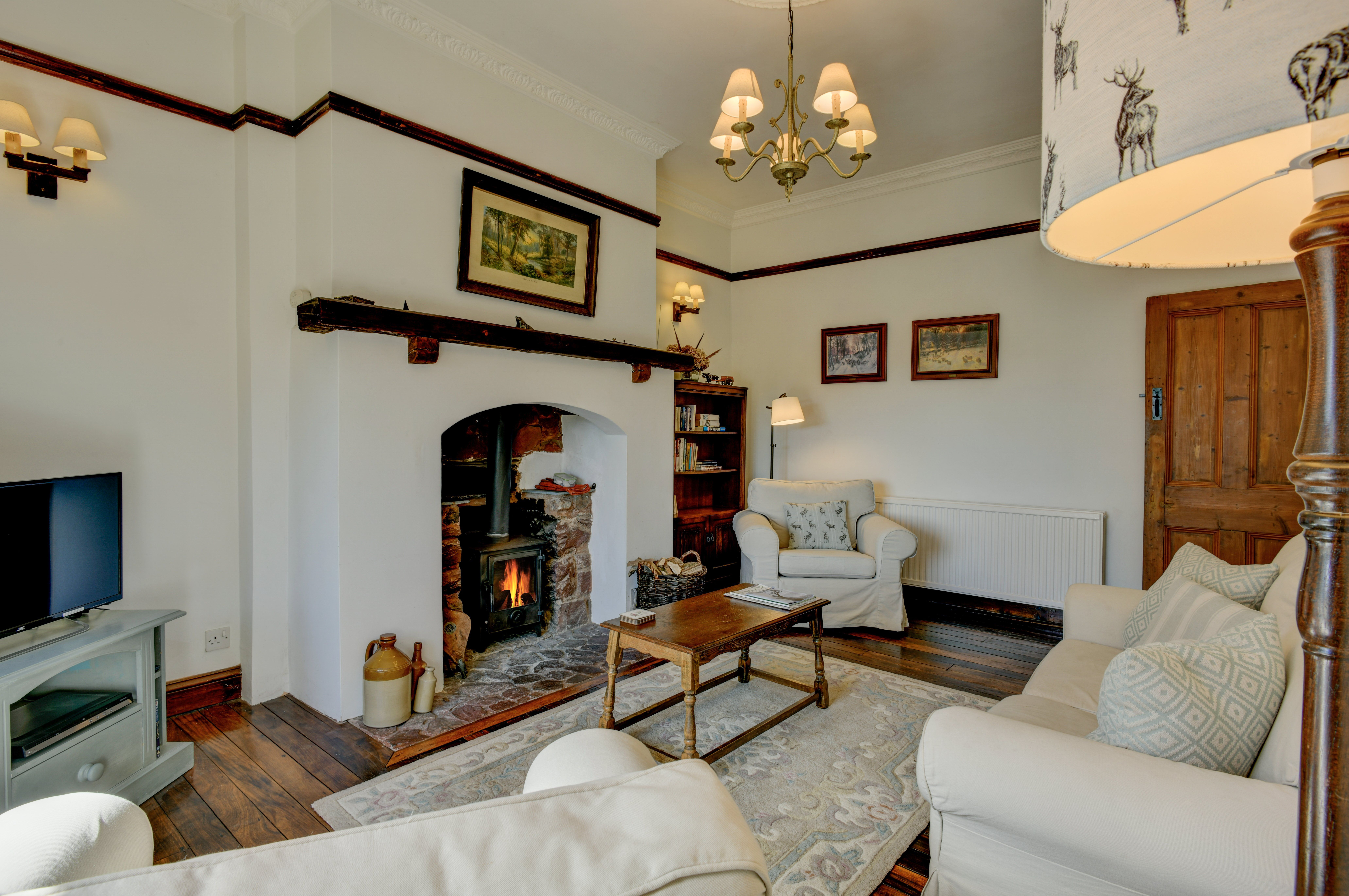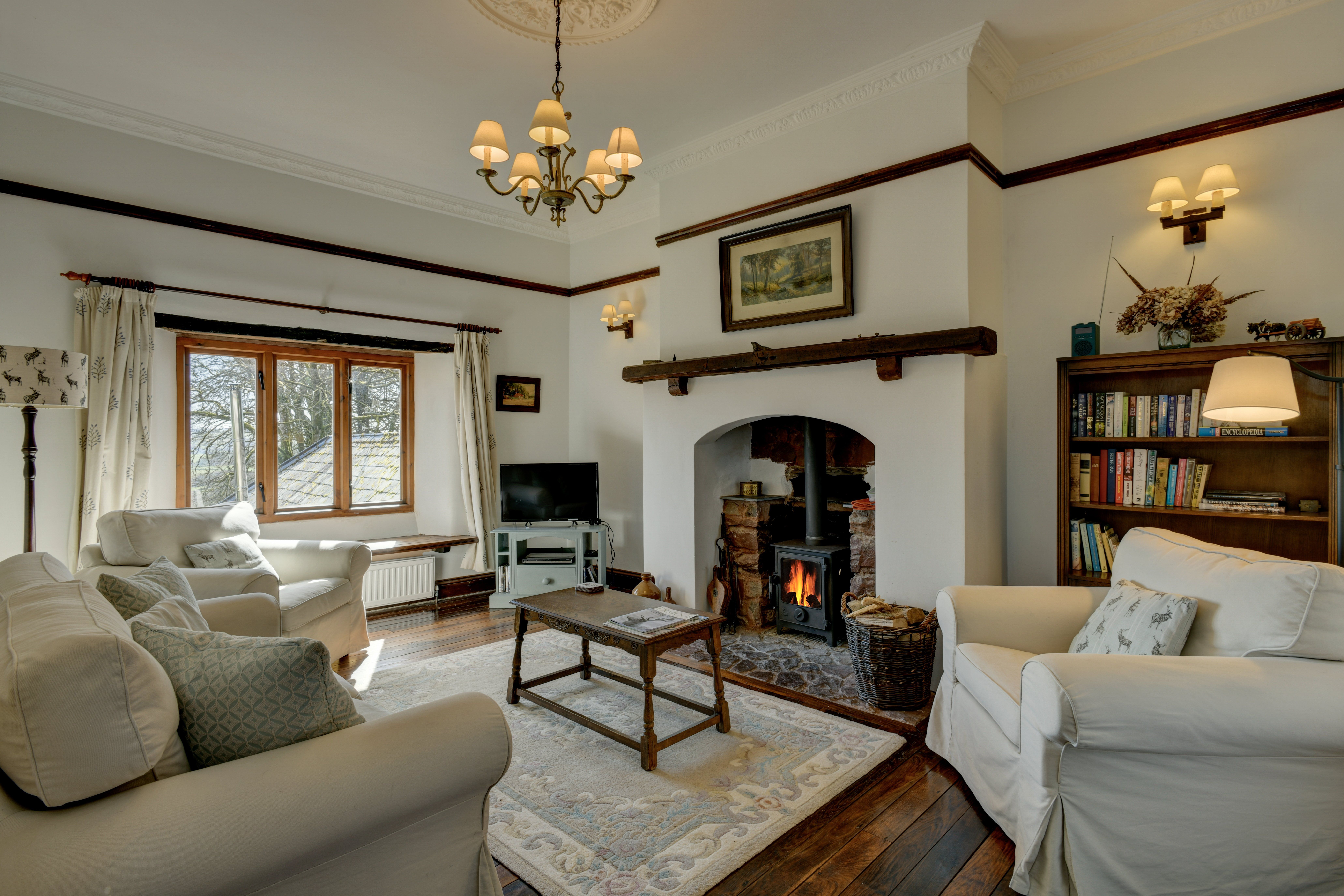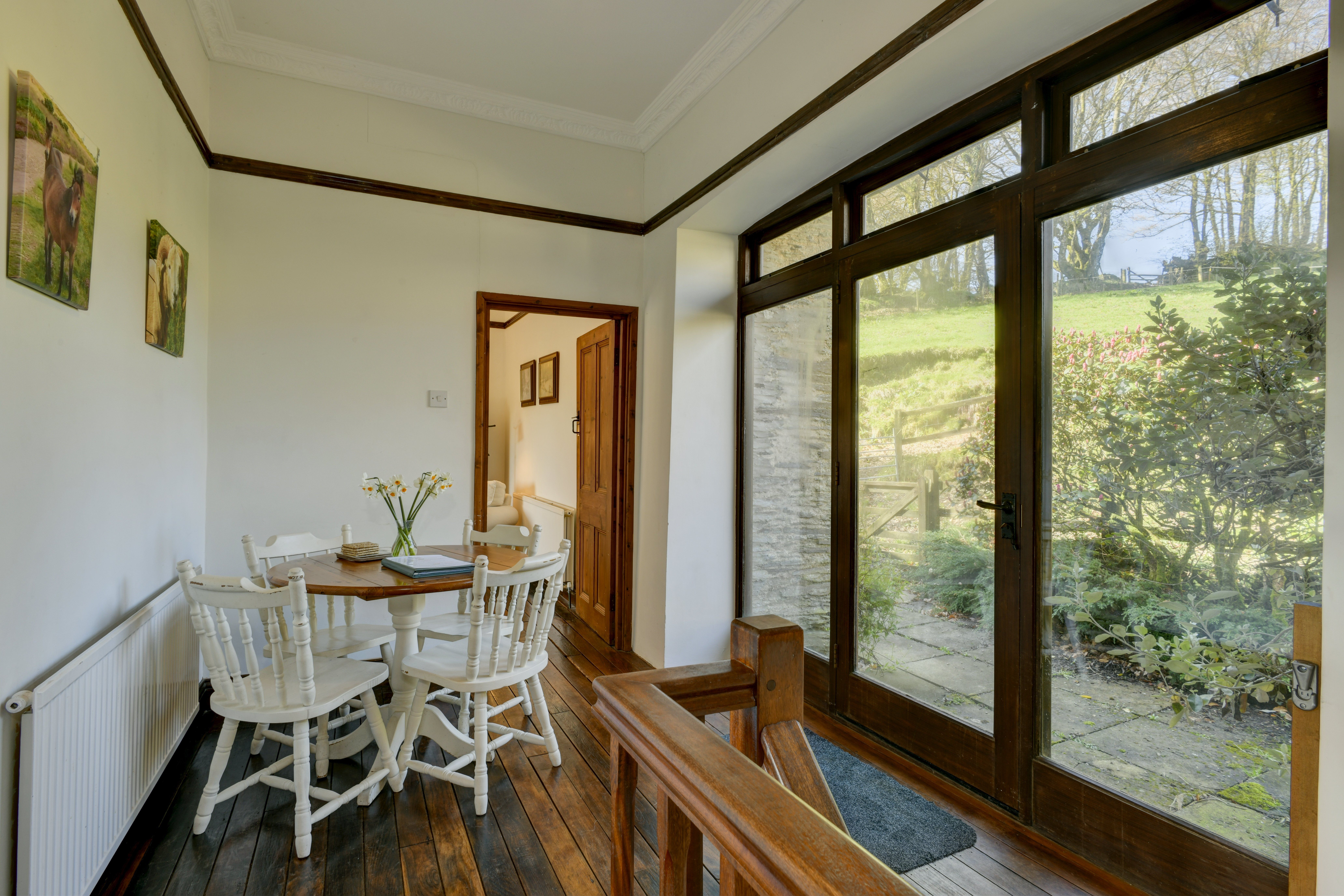 Sitting room with television/DVD player/DAB radio, open fire, French doors that open from dining area onto private terrace, and further valley views