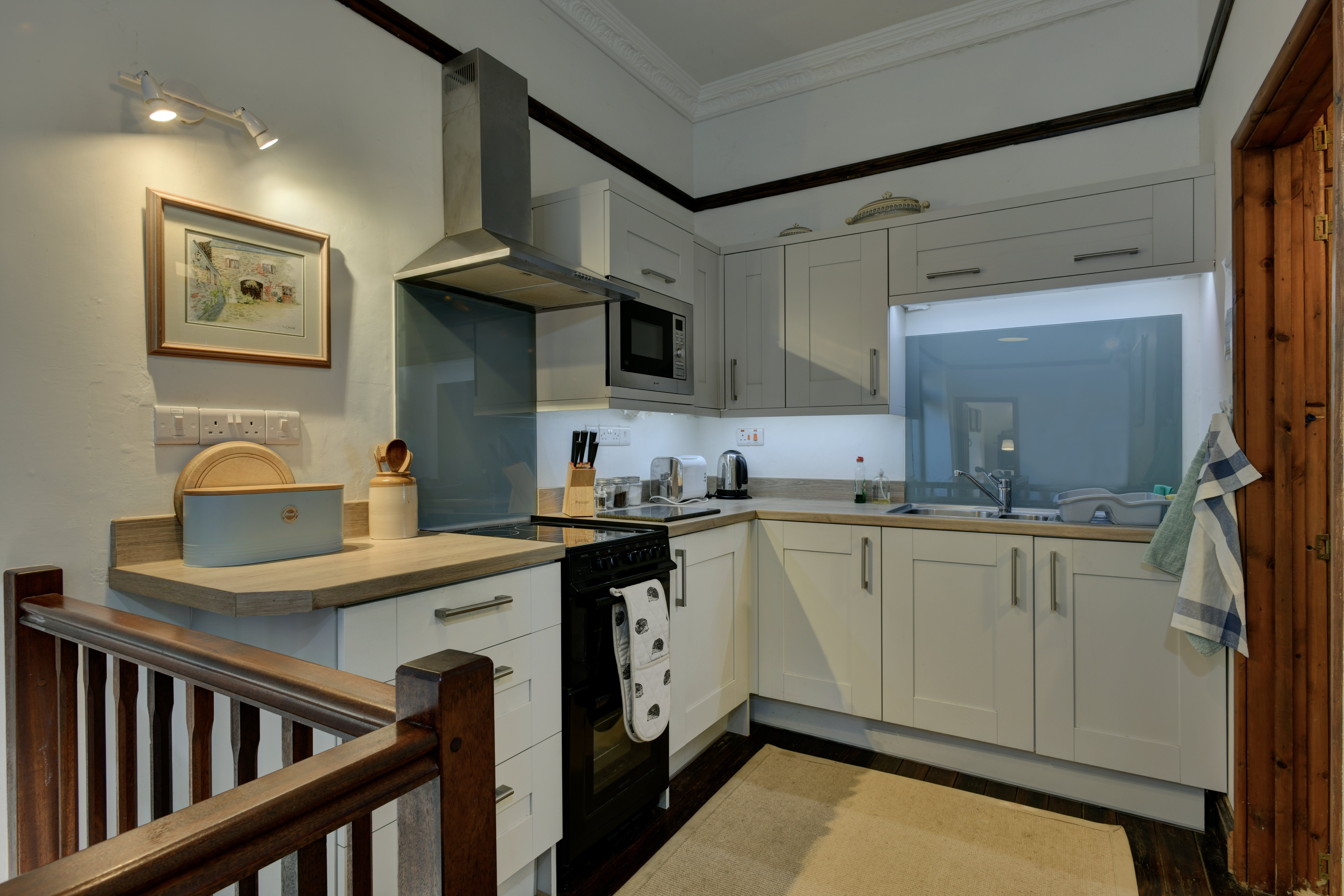Kitchen well fitted with fridge/freezer, microwave, electric oven and hob, plus toaster, kettle, variety of kitchen utensils, cutlery, crockery, and glasses